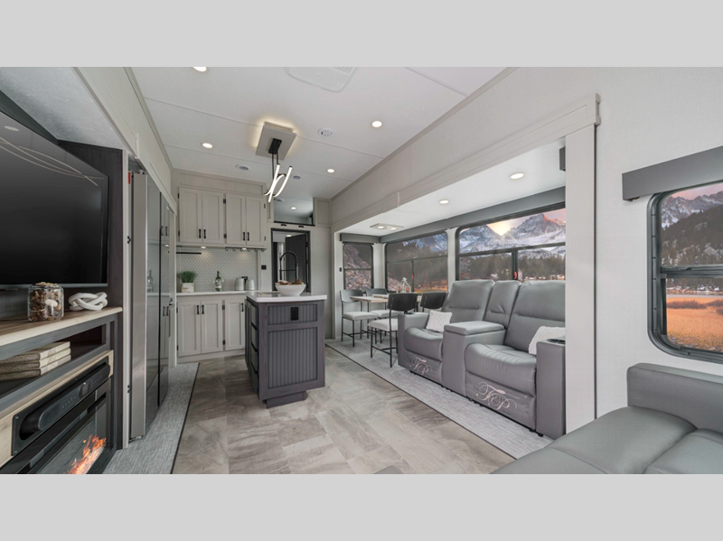 Sleeps 4 Slides 3 Length 34 ft 8 in Ext Width 8 ft Ext Height 12 ft 10 in Interior Color Linen, Carbon Hitch Weight 1935 lbs GVWR 12000 lbs Dry Weight 9574 lbs Cargo Capacity 2426 lbs Fresh Water Capacity 48 gals Grey Water Capacity 90 gals Black Water Capacity 45 gals Tire Size 15" Available Beds Queen Refrigerator Type Side by Side Stainless Glass 12V Refrigerator Size 16 cu ft Cooktop Burners 3 Number of Awnings 1 Water Heater Type On Demand TV Info LR 50" 4K Smart LED TV Awning Info 15' Electric with LED Light Strip Axle Count 2 Washer/Dryer Available Yes Shower Type Standard Electrical Service 50 amp Similar Floorplans