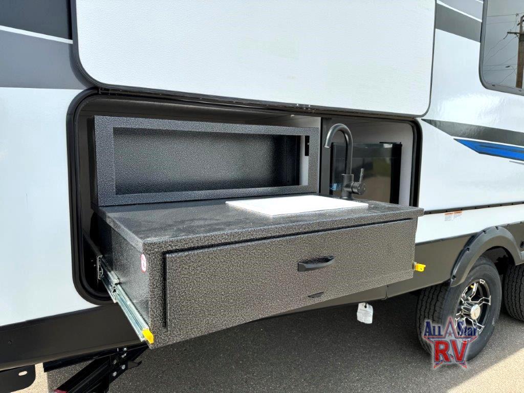 Are you looking for a travel trailer that will feel more like home? Look no further than this model that features a private bedroom up front, a full bath, plus a spacious rear kitchen. You will love to relax on the theatre sofa/hide-a-bed sofa across from the Smart TV and fireplace, and there is a booth dinette for dining. This model also includes a hidden pantry behind the TV for smart storage solutions. If the weather is nice you may just want to sit outdoors under the 18' power awning with LED lights. The chef of your group can prepare a meal on the pull-out camp kitchen, and the kids can grab their scooters from the pass-through storage.