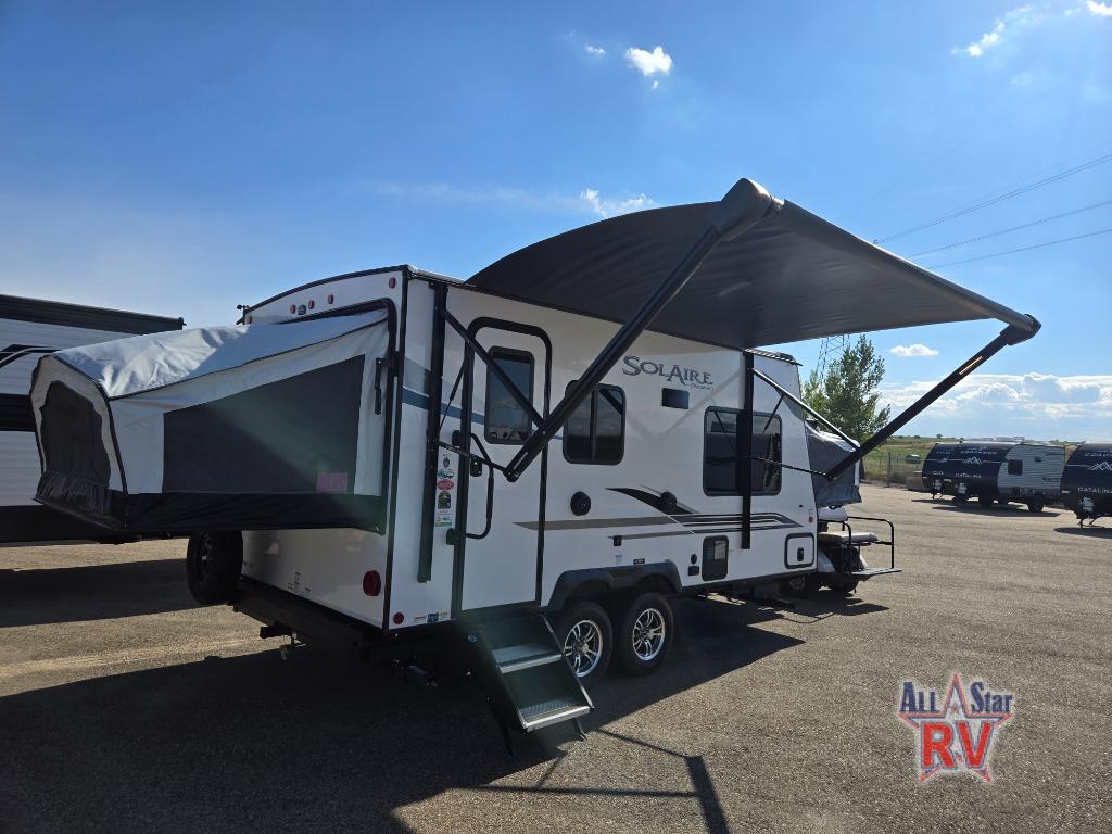 Each SolAire travel trailer or hybrid expandable features a white hi-gloss exterior, and Dexter Tor-Flex torsion axles for smooth towing. You will love having a power tongue jack for easy set up, plus slam latch baggage doors with magnets to make unloading easier than ever. There is also a tire pressure monitoring system, a power awning with LED lights, and aluminum wheels included on the exterior. Head inside to find solid surface countertops, roller shades, a Furrion HDMI DVD/Bluetooth/HDMI stereo, and USB ports to keep your electronics charged.
