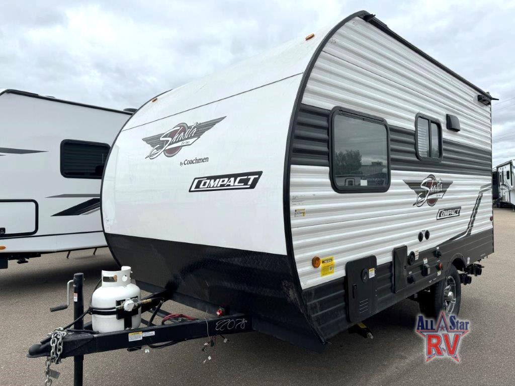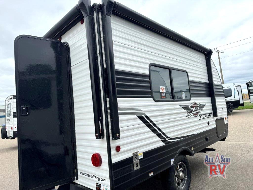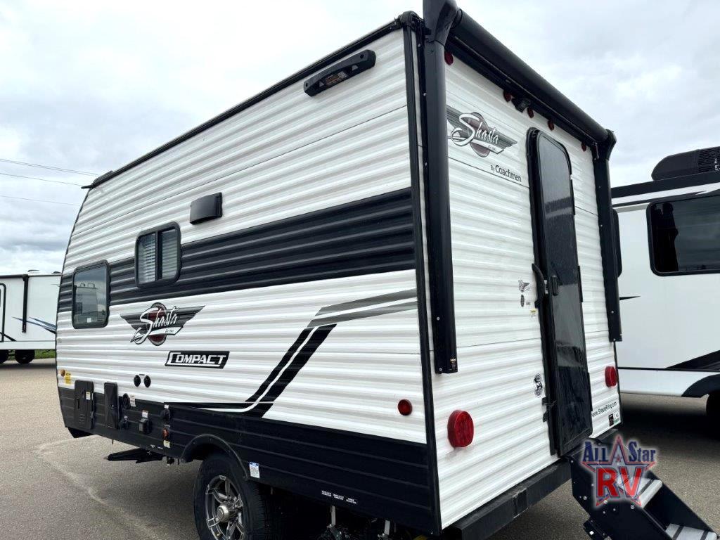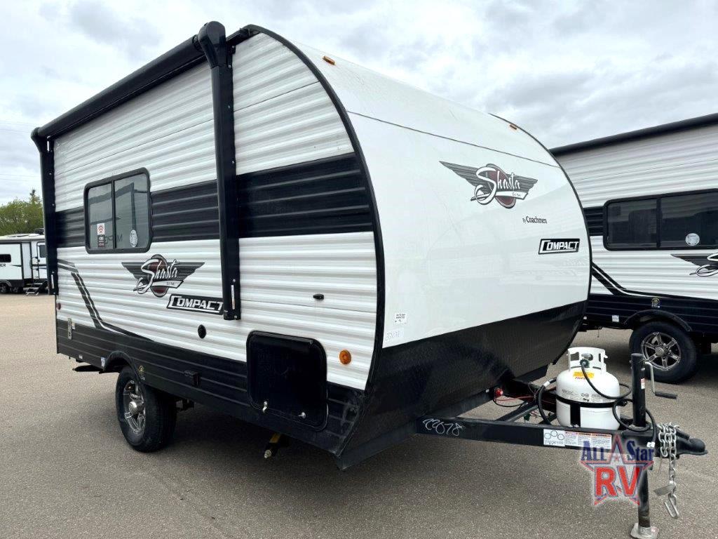 With any Compact travel trailer by Shasta RVs, you will enjoy the camping lifestyle in an easy-to-tow, lightweight unit! Each model includes four stabilizer jacks to keep your travel trailer secure at the campground, plus solar and back-up camera prep for off-grid capabilities and the option to make parking easier. An optional power tongue jack can be added for more convenience, as well as optional aluminum wheels and an optional spare tire and carrier. You will appreciate having a Tire Pressure Monitoring System onboard, along with a gas/electric DSI water heater and a 13.5 BTU A/C to keep you cool on hot summer camping days. The interior of each Compact travel trailer includes seamless countertops, kitchen and bath amenities, a Bluetooth portable speaker, plus storage space for all your belongings.