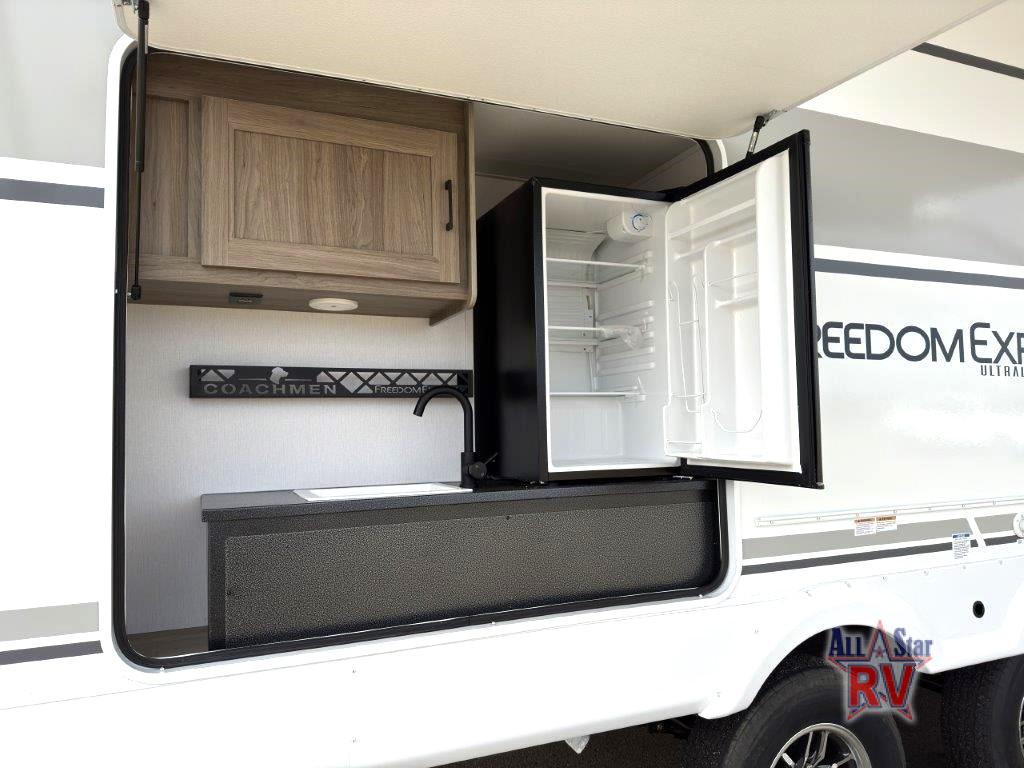 With any Freedom Express Ultra Lite travel trailer by Coachmen you will appreciate quality construction materials, such as vacuum bonded walls with Azdel composite, a 3/4 gel coated fiberglass cap with an automotive glass windshield, and a heated enclosed underbelly. Each model also features Tufflex PVC roofing, front rock guard, and E-Z Lube axles for smooth towing. Inside, you'll find kitchen backsplash, hidden hinge cabinetry, and wear-resistant vinyl flooring throughout. The power tongue jack included with the Ultra Lite Express Package will make set-up a breeze, and each model includes back-up camera prep and they are Freedom solar ready if you plan to go off-grid. Enjoy lightweight camping with a Freedom Express Ultra Lite travel trailer today!