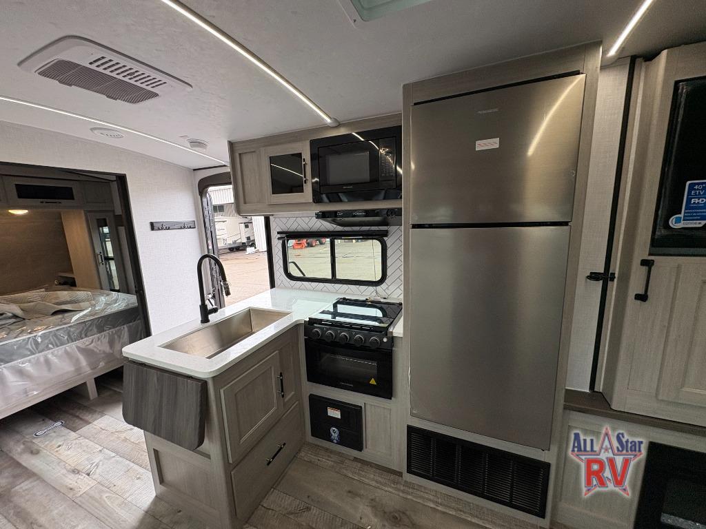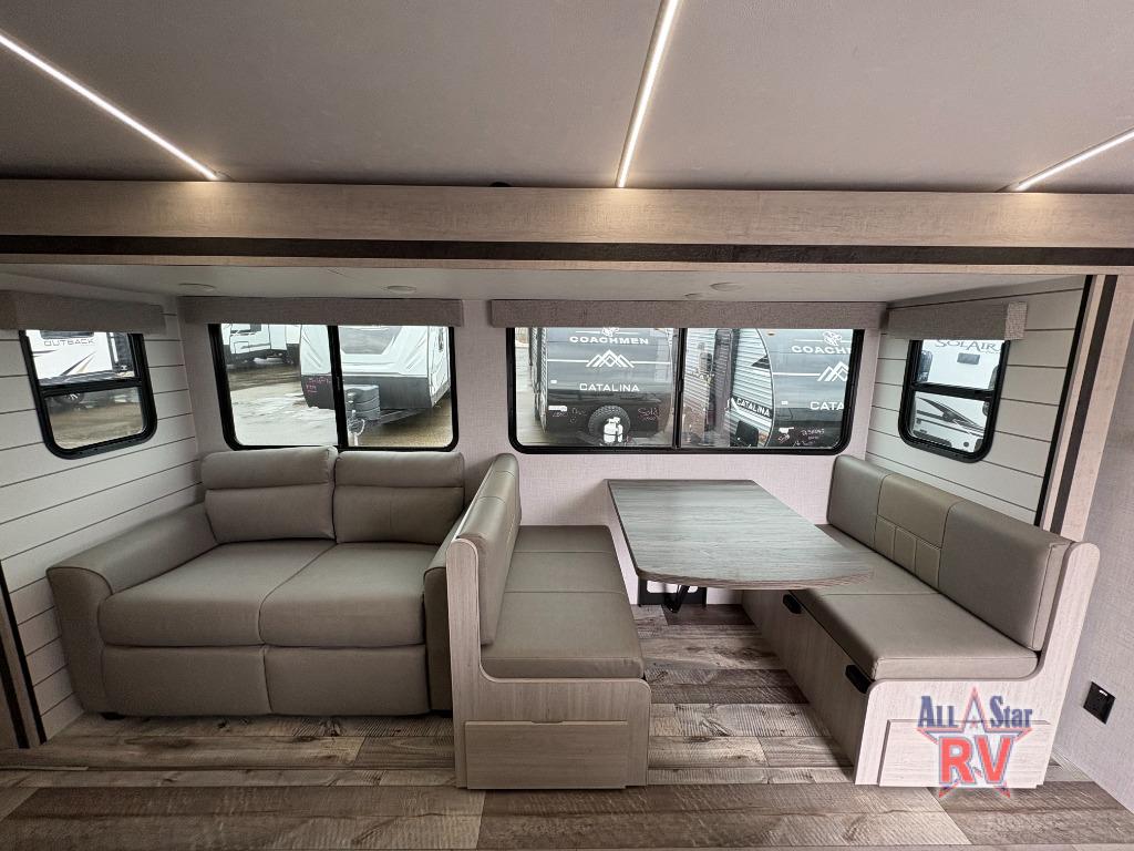 With any Sunset Trailer travel trailer by CrossRoads RV, you will enjoy comfort at every turn! The 5-sided aluminum structure, enclosed underbelly, and HyperDeck flooring provide a durable RV made to last. There is also a power awning with LED lights outdoors, a fiberglass front cap, and a docking station with battery disconnect for easy set-up. Each model includes solid surface kitchen countertops, porcelain toilets, roller shades, and hidden cabinet door hinges to name a few interior comforts!