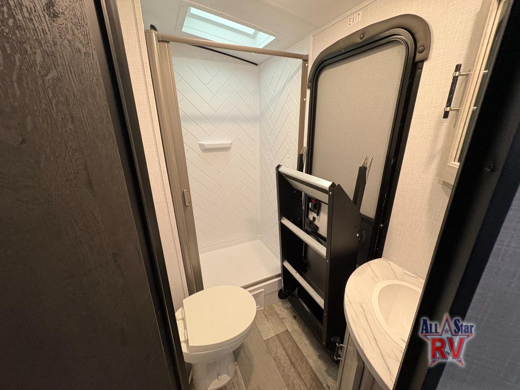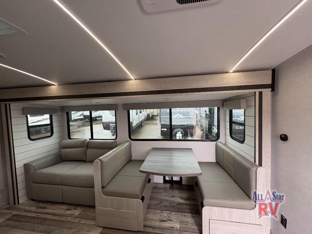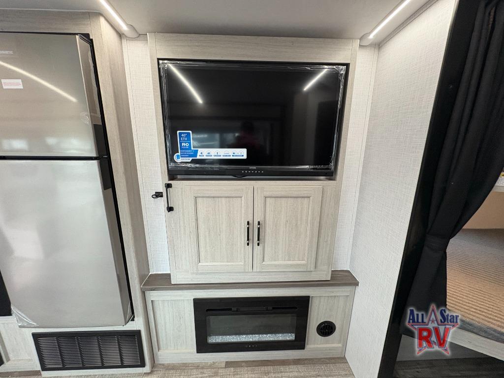 Camping trips are made fun in this spacious travel trailer for eight! There are double-size bunks in the rear corner, with the full bath close by for easy nighttime use. You'll enjoy the front private bedroom all to yourselves, and any other guests can sleep on the sofa and booth dinette. There is also a fireplace here to make this space more cozy. The chef of your group can make home cooked meals in the full kitchen, and they will appreciate the hidden pantry behind the entertainment center to keep food stocked!