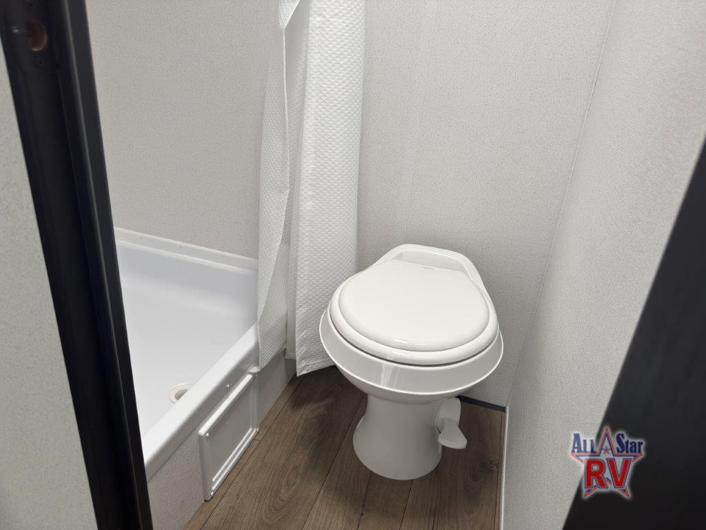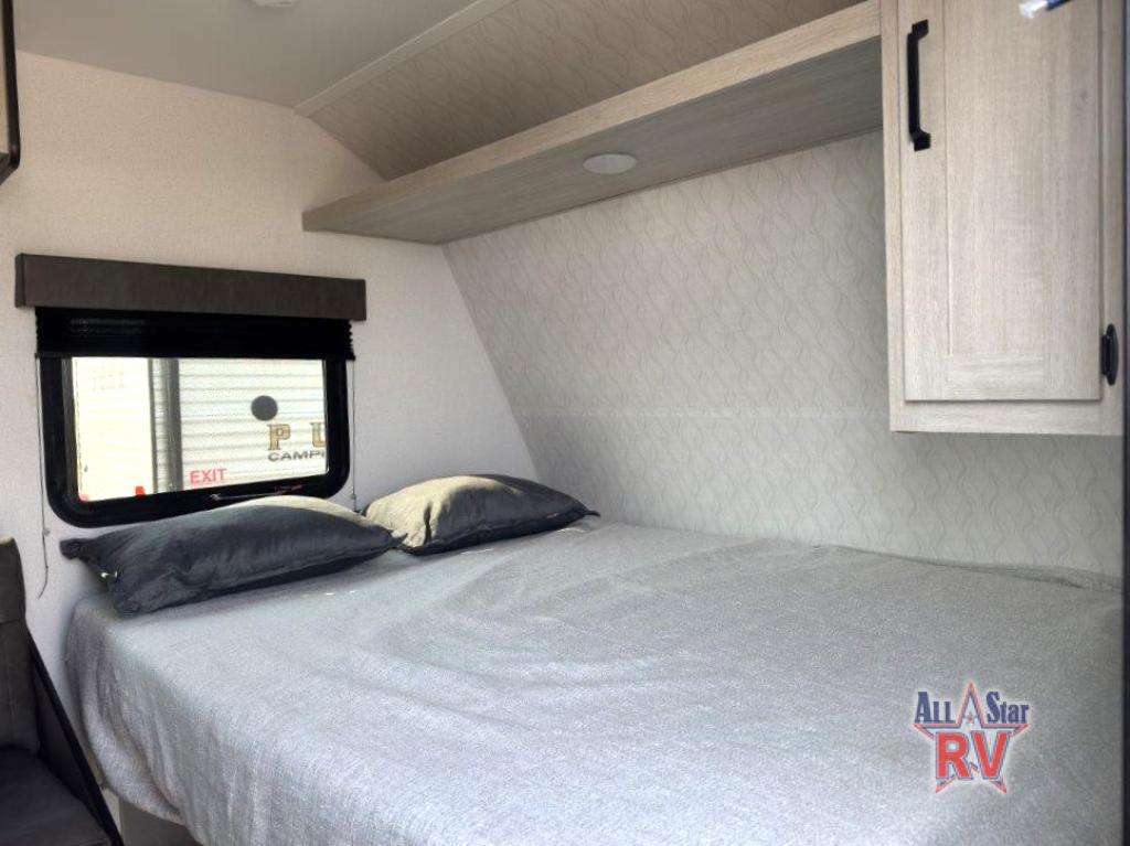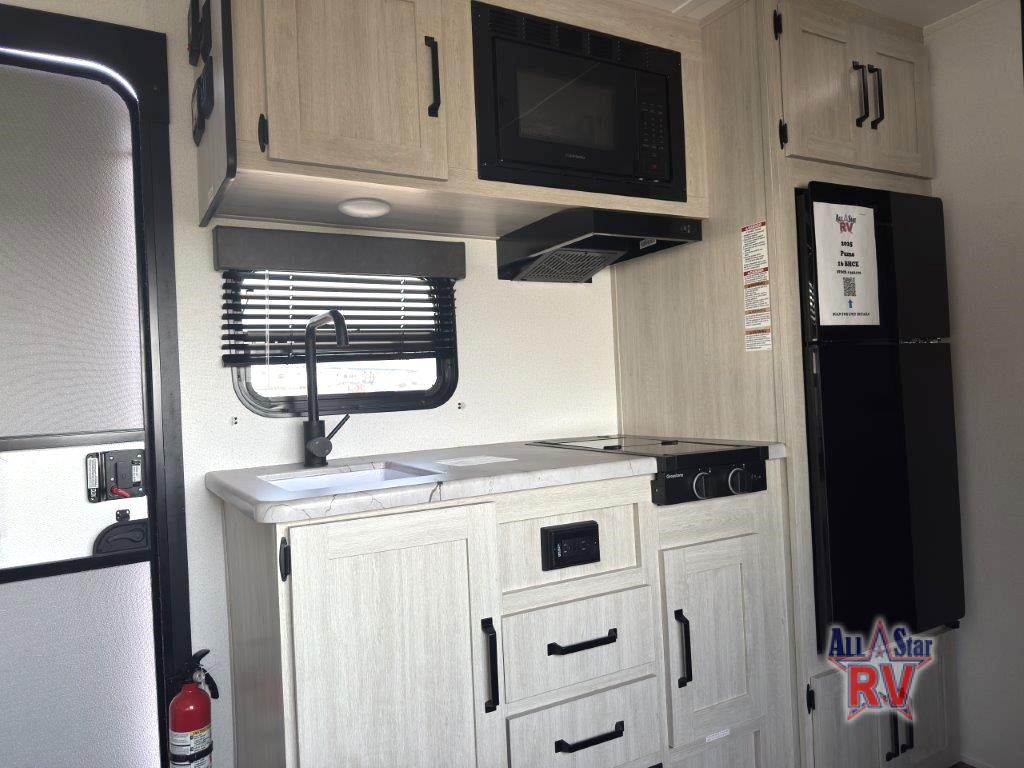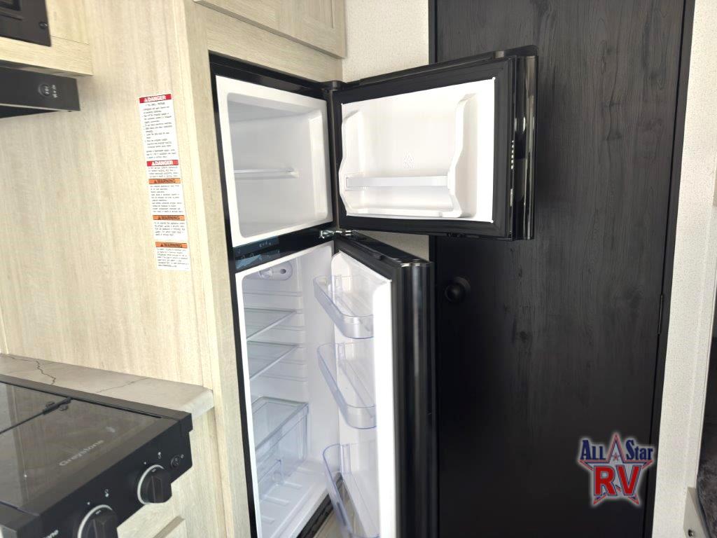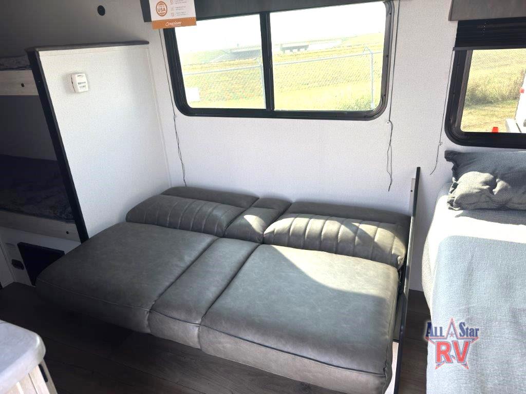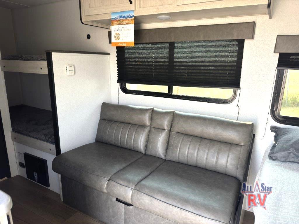 It will be so easy to enjoy camping trips in this single axle travel trailer! There is a front RV queen bed with flip-up storage at the foot of the bed for your belongings, and any additional guests can sleep on the bunk beds and sofa. A full kitchen includes a stainless two burner cooktop and stainless microwave to cook meals each day, and the 4.3 cu. ft. 12V black glass refrigerator will keep your food fresh. And a private bath with a toilet and shower will let you freshen up without having to use the camp's facilities!
