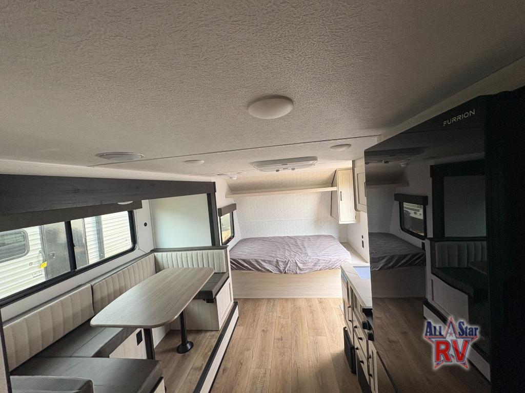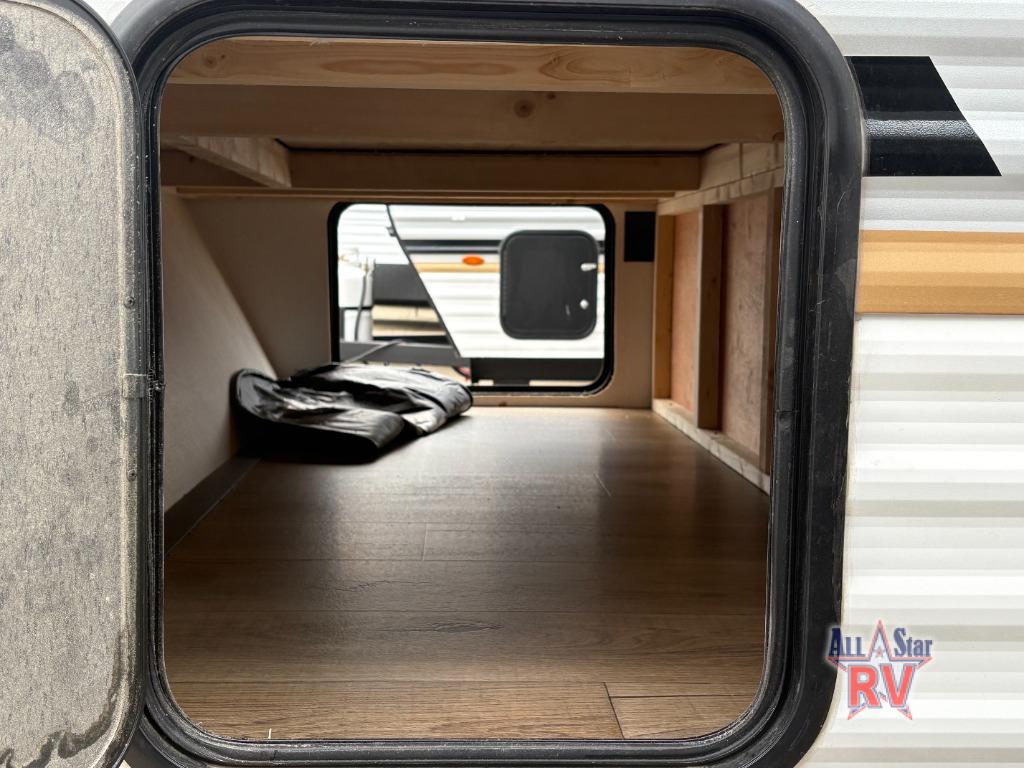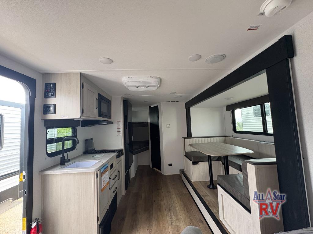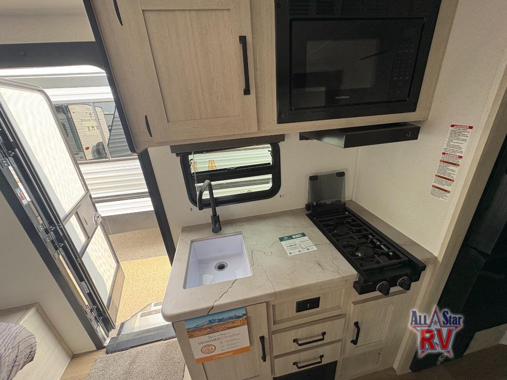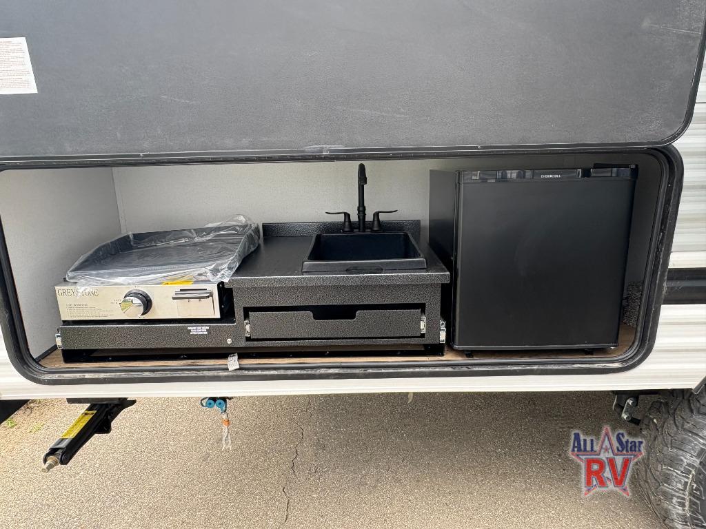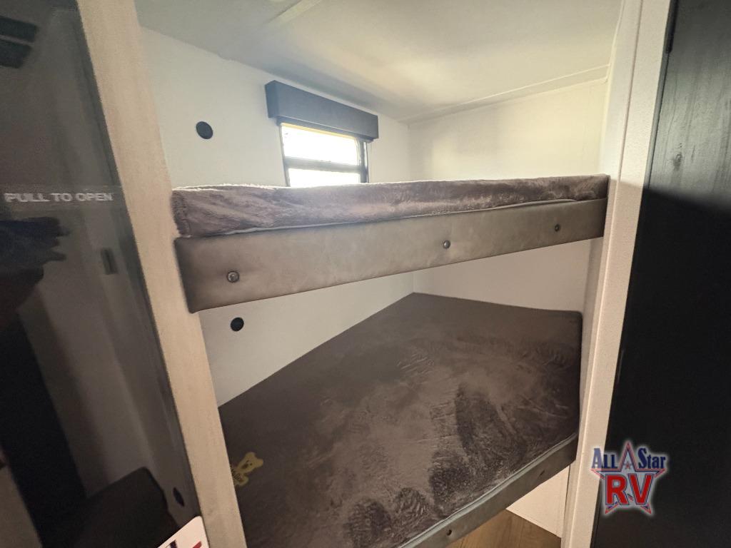 The whole gang will love camping in this travel trailer since there are double-size bunks for compact sleeping spaces and a slide out for more space to relax! The front RV queen bed is sure to provide a great night's rest, and you can choose the optional Murphy bed if you're needing more seating space during the day. Once you've made dinner on the two burner cooktop, you can dine around the U-shaped dinette. And an optional mini kitchen with a griddle is available if you'd rather cook outdoors! This unit includes ample storage space for your things, including exterior storage and storage under the bunks!