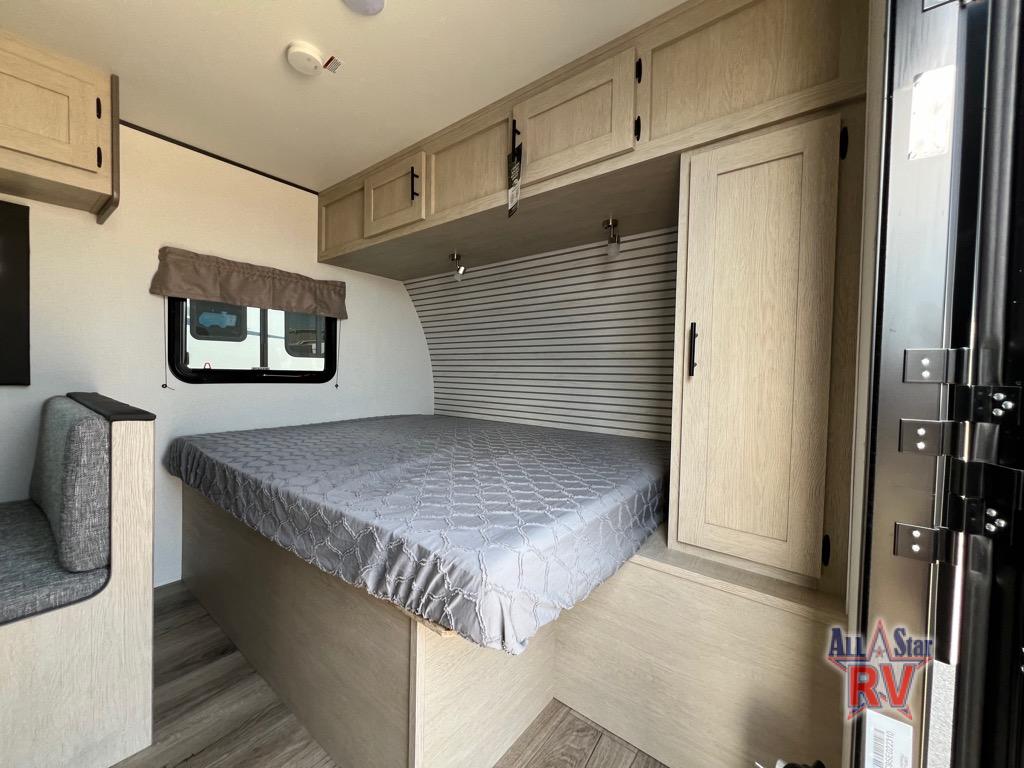 If you're looking for lightweight travel trailer with bunks, this is the one! There is even bunk storage so the kids or your guests can keep their things tidy, and you'll love the front RV queen bed all to yourselves. The full bath with a sink, toilet, and 24" x 40" shower pan will let everyone fresh up after a day outdoors. Once the chef of your group has made lunch in the kitchen, you can dine at the booth dinette or take your plate outdoors to sit at the campground picnic table. This model also includes plenty of storage space, including an exterior pass-through for fishing poles, hiking gear, and more!