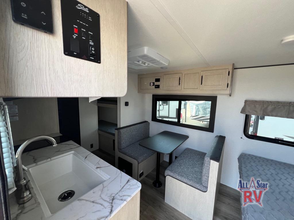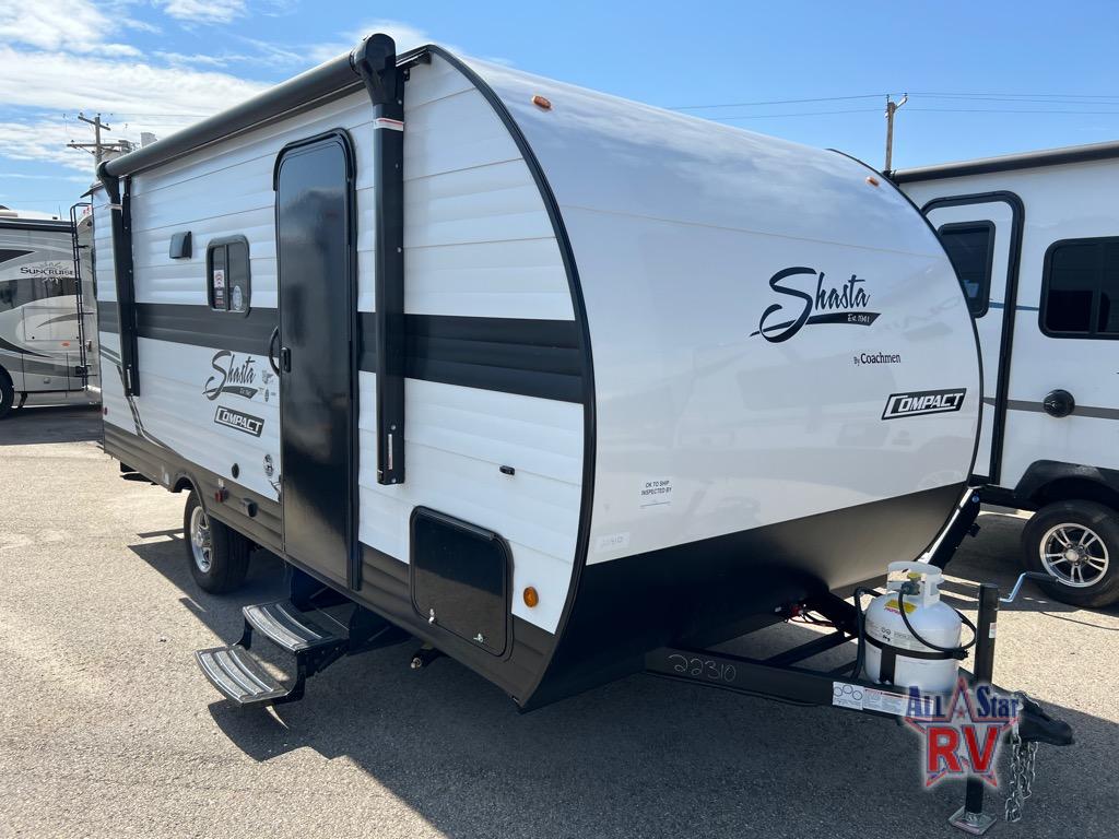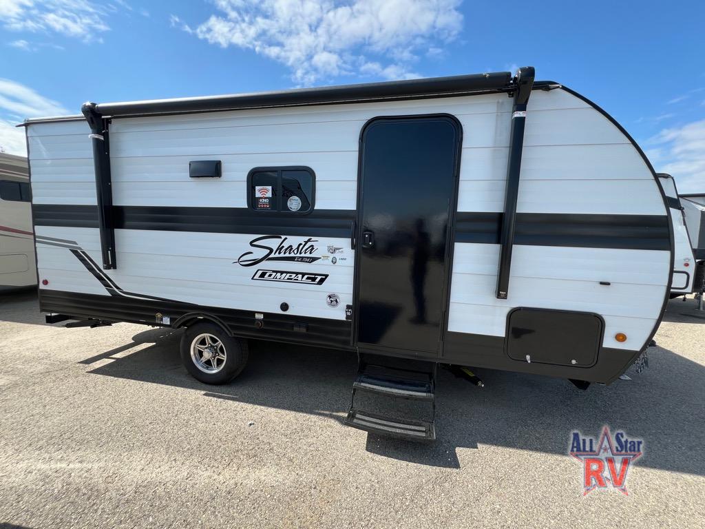 With any Compact travel trailer by Shasta RVs, you will enjoy the camping lifestyle in an easy-to-tow, lightweight unit! Each model includes four stabilizer jacks to keep your travel trailer secure at the campground, plus solar and back-up camera prep for off-grid capabilities and the option to make parking easier. An optional power tongue jack can be added for more convenience, as well as optional aluminum wheels and an optional spare tire and carrier. You will appreciate having a Tire Pressure Monitoring System onboard, along with a gas/electric DSI water heater and a 13.5 BTU A/C to keep you cool on hot summer camping days. The interior of each Compact travel trailer includes seamless countertops, kitchen and bath amenities, a Bluetooth portable speaker, plus storage space for all your belongings.