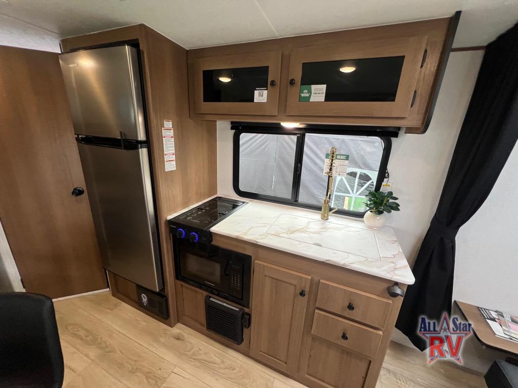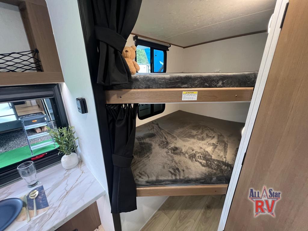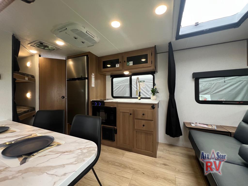 As you step into this versatile travel trailer, you'll be greeted by a front Murphy bed that offers the best of both worlds, a comfortable place to sleep at night and a cozy sofa for daytime lounging. Convenient storage is provided with a wardrobe at the foot of the bed and a nightstand on the other side for your essentials. In the center, the kitchen is fully equipped with a 10-cu. ft. refrigerator, a 2-burner cooktop, and an air fryer microwave, giving you all the tools you need to prepare your favorite meals. Across from the kitchen, a counter with chairs offers a welcoming space to dine, work, or gather. Toward the rear, double bed bunks provide additional sleeping space, with the lower bunk flipping up to reveal extra storage for your gear. Rounding out the layout is a full bathroom in the rear corner, featuring a tub/shower combo so you can enjoy the comfort and convenience of bathing right inside your trailer.