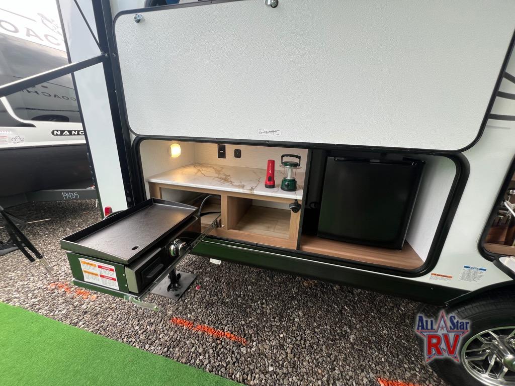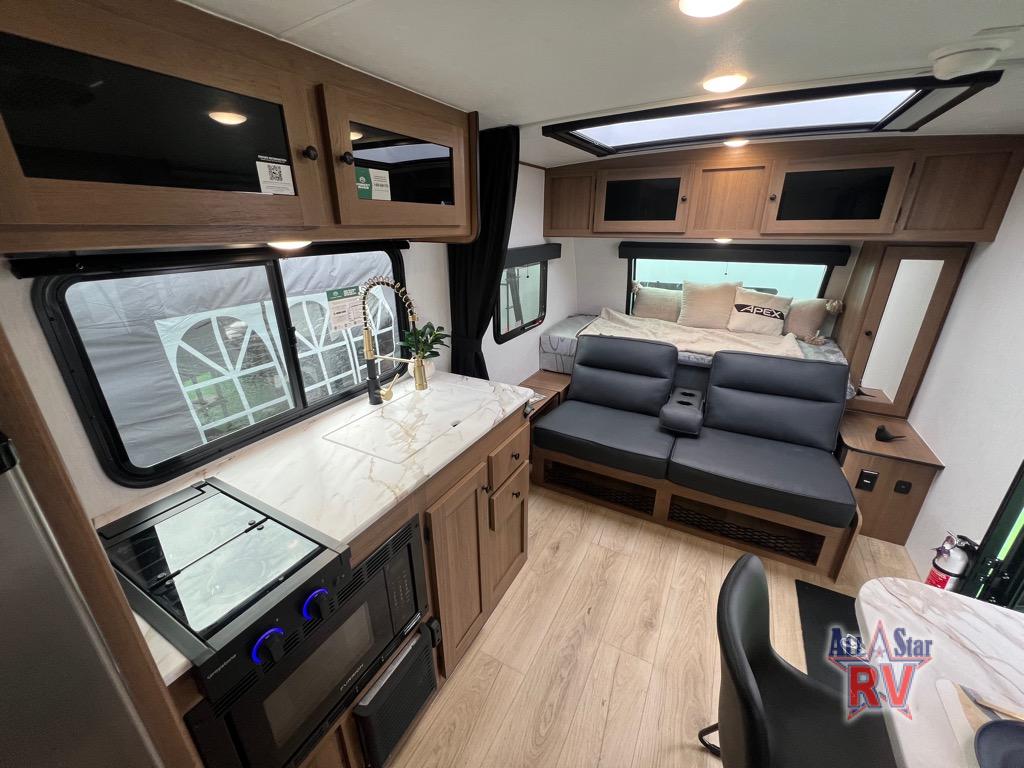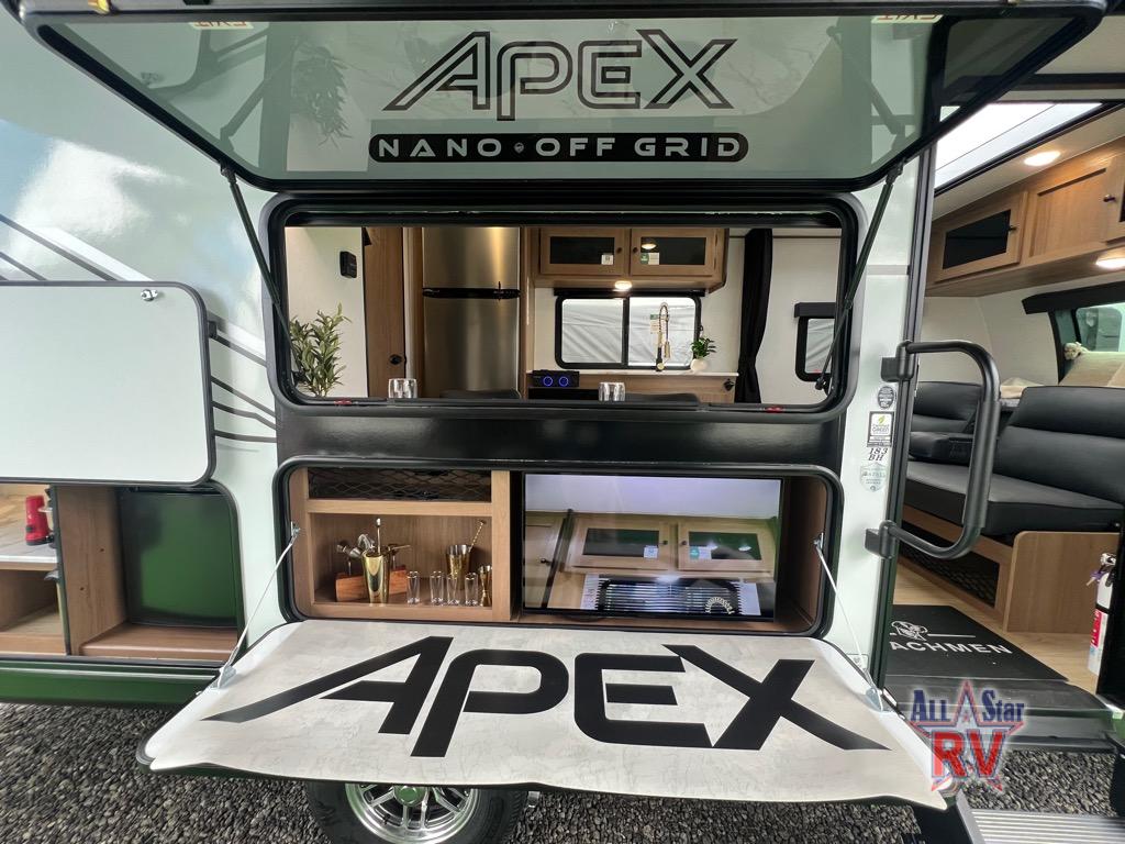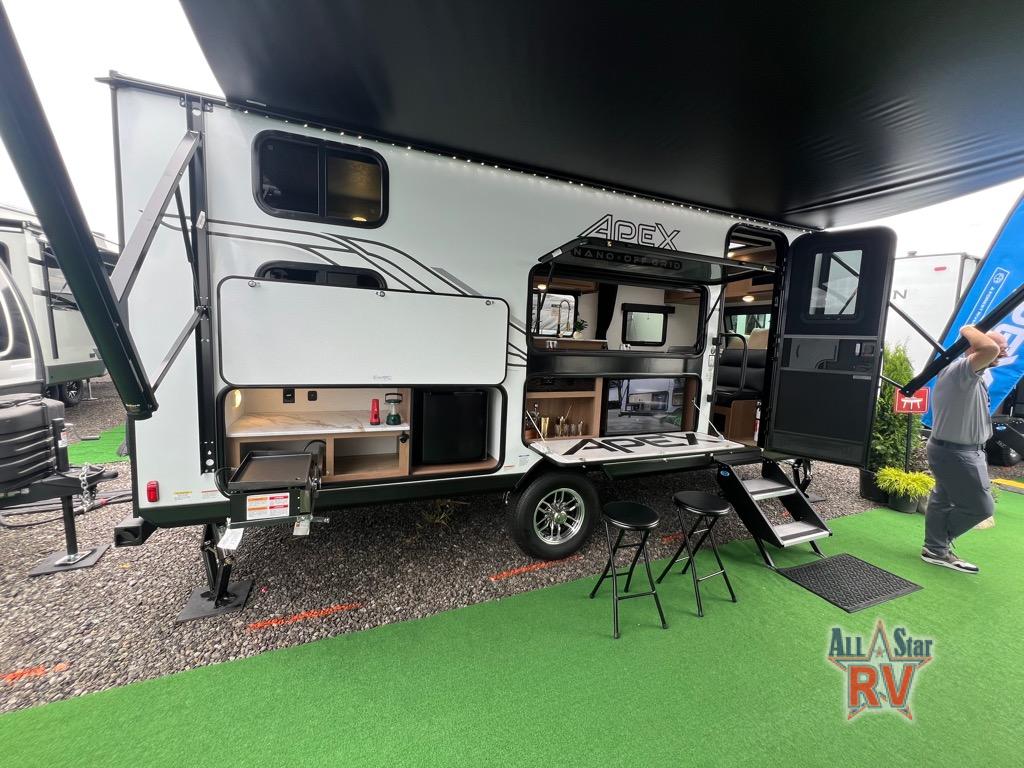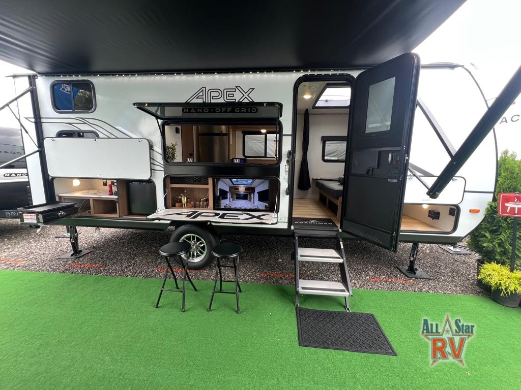You will find comfort, convenience, and a sturdy construction with each of these Coachmen RV Apex Nano travel trailers! They are held together with an aluma-cage construction, an I-beam chassis, plus vacuum-bonded laminated dual Azdel fiberglass walls for double the protection against the elements. The 400-watt solar panel with a 30-amp control charger is included, along with two 20 lb. LP tanks, a high velocity power roof vent, plus 12V outlets to keep you powered up. More exterior features include a hot/cold shower, four stabilizer jacks, a power awning with LED lighting, and radius thumb latch baggage doors to easily pack and unload your gear. You will love the interior of your Apex Nano with Congoleum residential flooring, one-piece seamless edge countertops, matte black hardware in the galley, and a hand-crafted wood medicine cabinet in the bath.