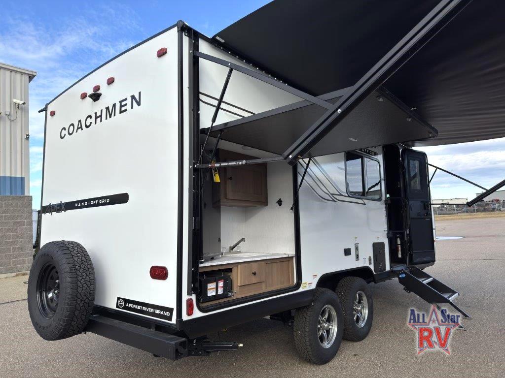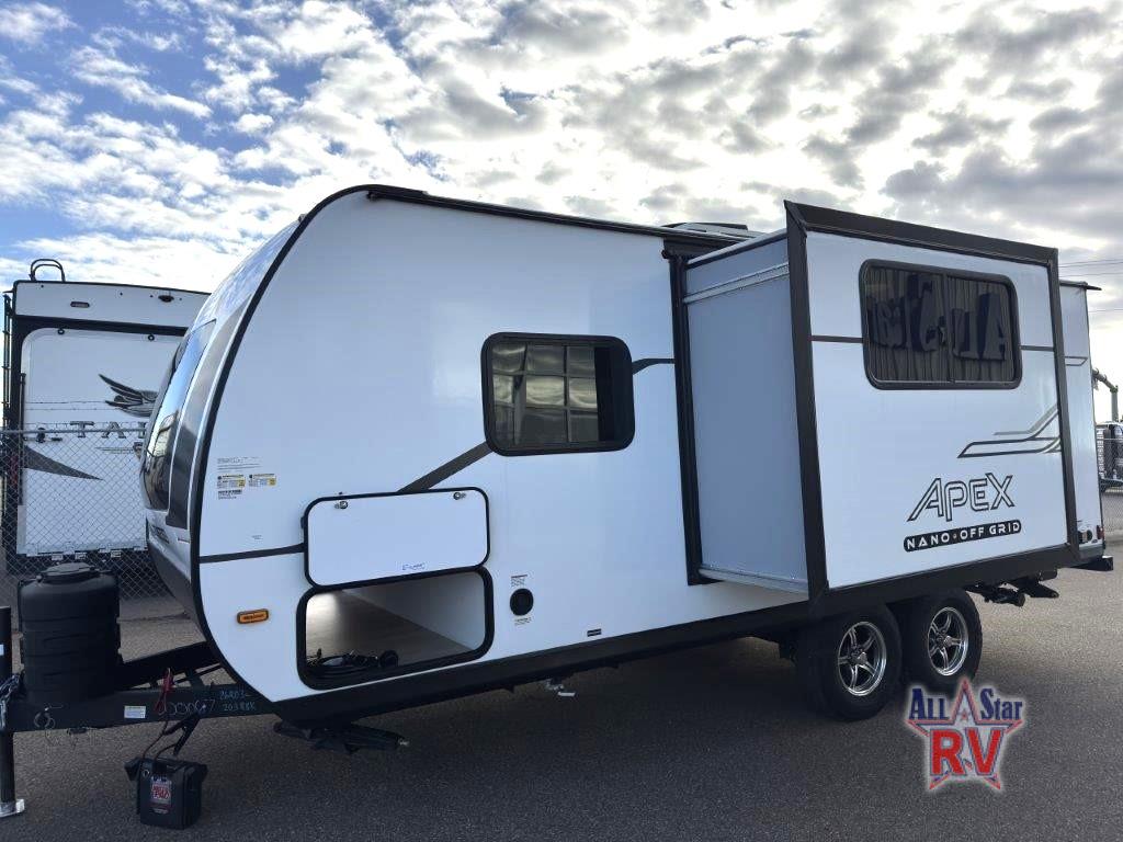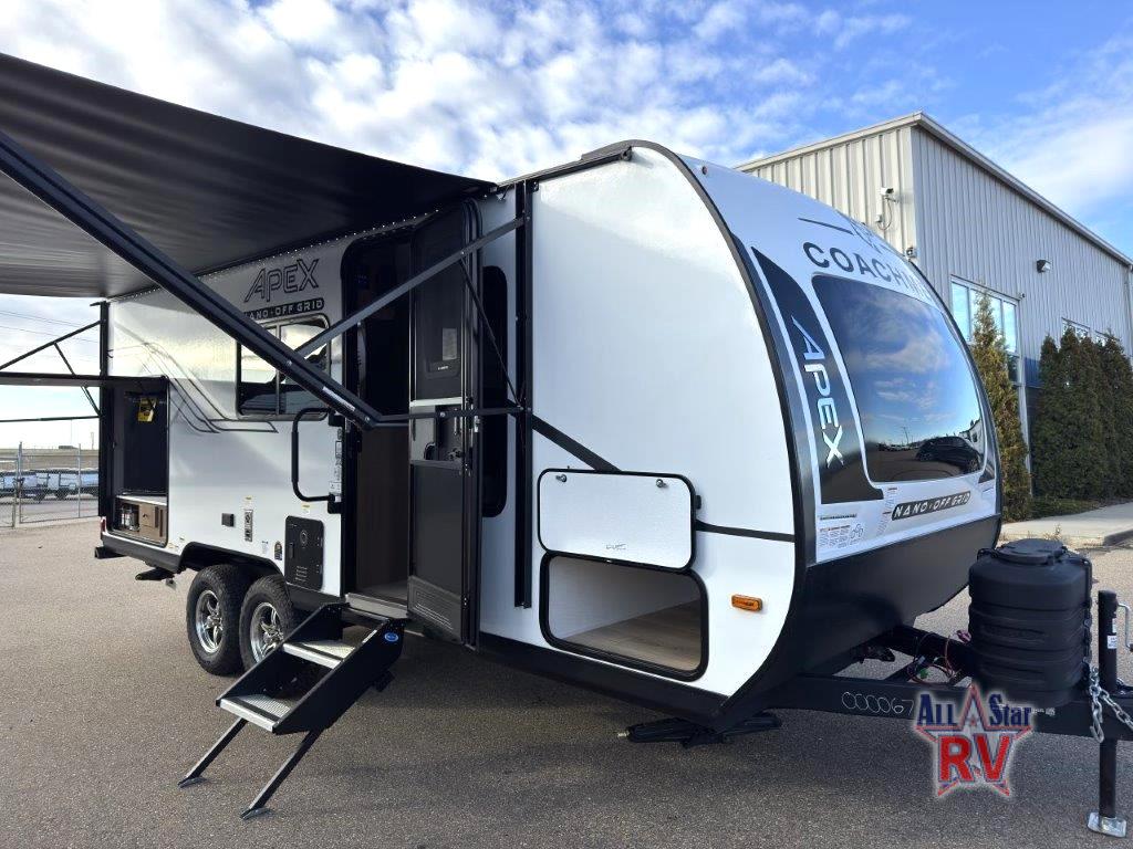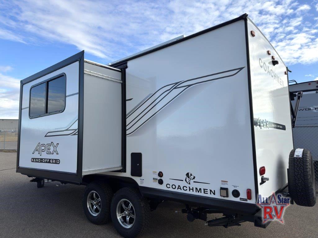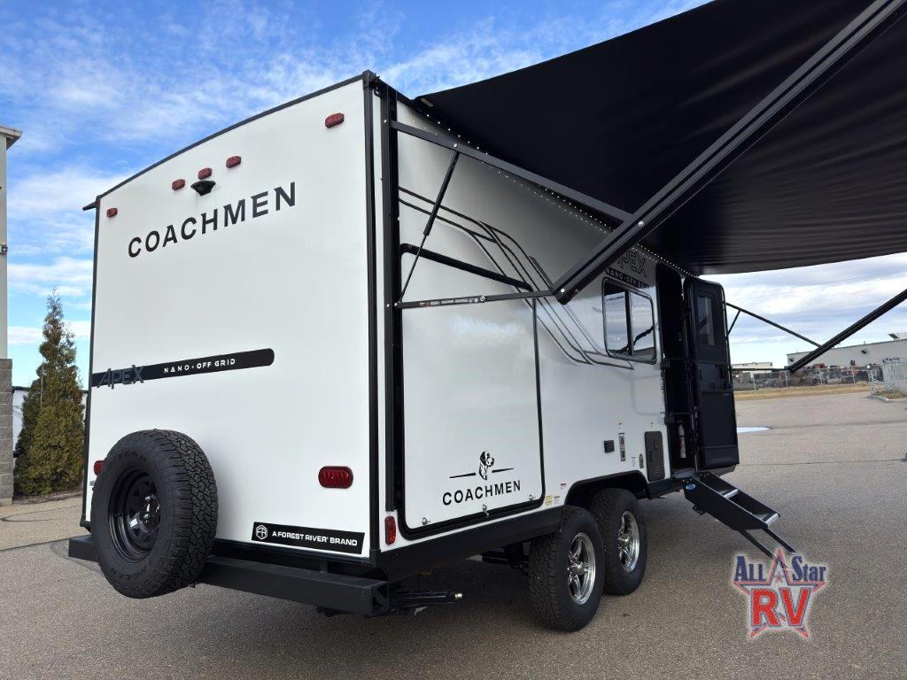 You will find comfort, convenience, and a sturdy construction with each of these Coachmen RV Apex Nano travel trailers! They are held together with an aluma-cage construction, an I-beam chassis, plus vacuum-bonded laminated dual Azdel fiberglass walls for double the protection against the elements. The 200-watt solar panel with a 30 amp control charger is included within the Off-Grid Package, along with two 20 lb. LP tanks, a high velocity power roof vent, plus 12V outlets to keep you powered up. More exterior feature include a hot/cold shower, four stabilizer jacks, a power awning with LED lighting, and magnetic baggage door catches to easily pack and unload your gear. You will love the interior of your Apex Nano with Congoleum residential flooring, one-piece seamless edge countertops, matte black hardware in the galley, and a hand-crafted wood medicine cabinet in the bath.