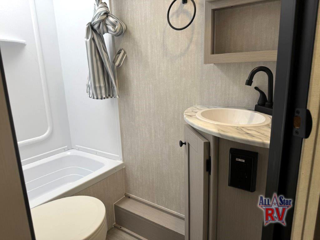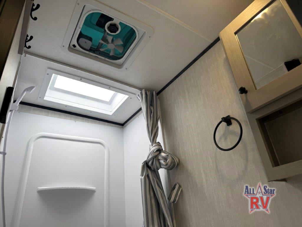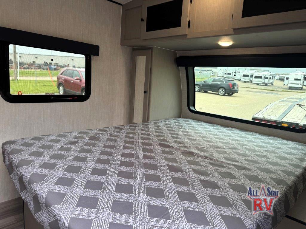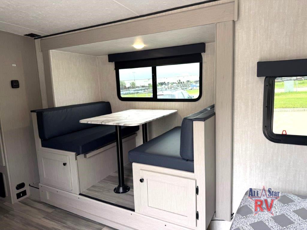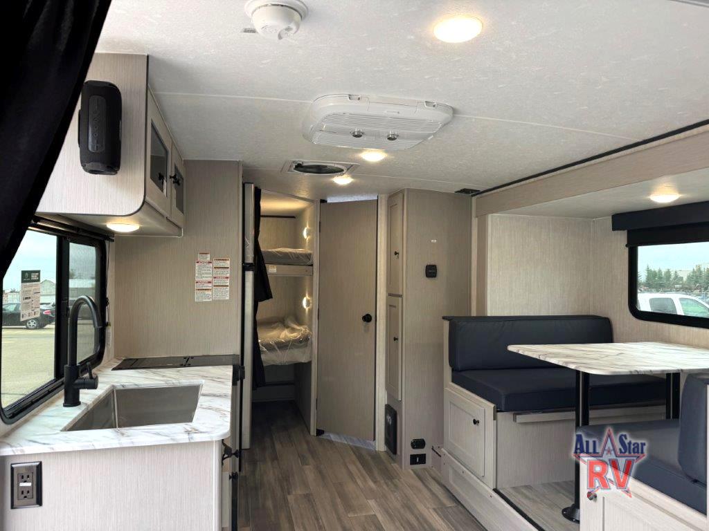 You and a few friends or family members can camp comfortably in this travel trailer! It features a front queen bed with wardrobes on either side to keep your clothes out of the way or you can switch it out for the optional Murphy bed for more versatility. Two others can sleep on the rear corner upper double bed and lower flip up double bed. After you have fried up some eggs on the two burner cooktop and heated up a piece of banana bread in the microwave, you can head to the booth dinette slide to enjoy it. There is even a pantry to store your coffee grounds and snacks. Now that your bellies are full, you can freshen up in the rear corner bathroom with the tub/shower.
