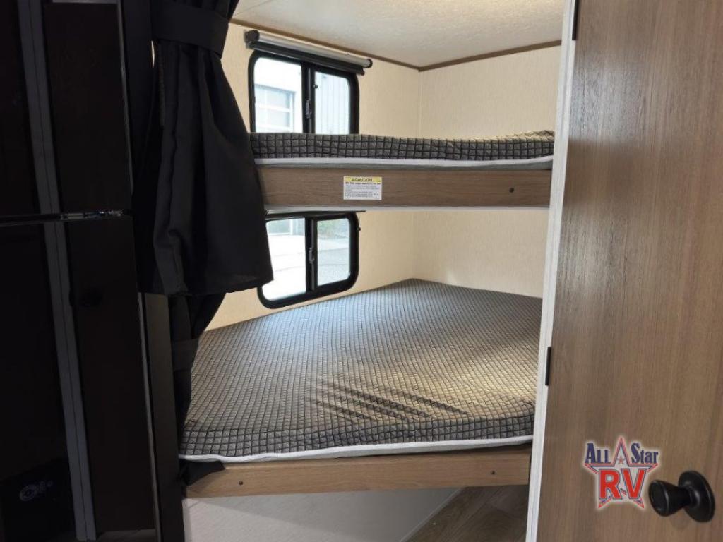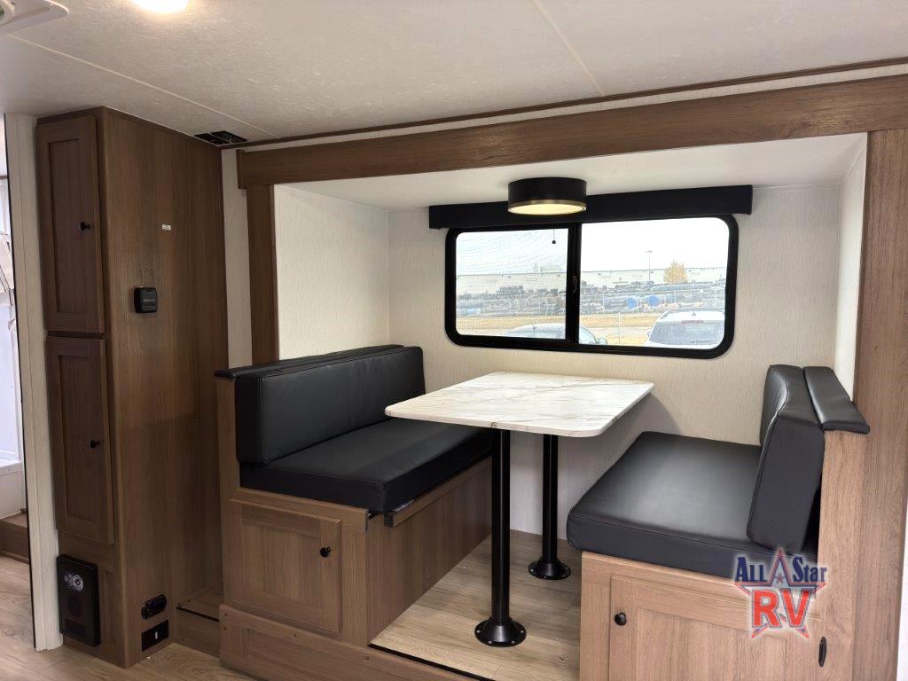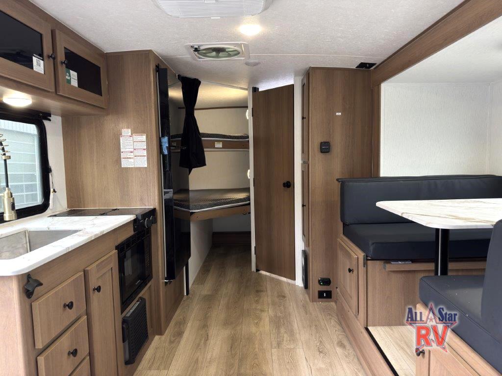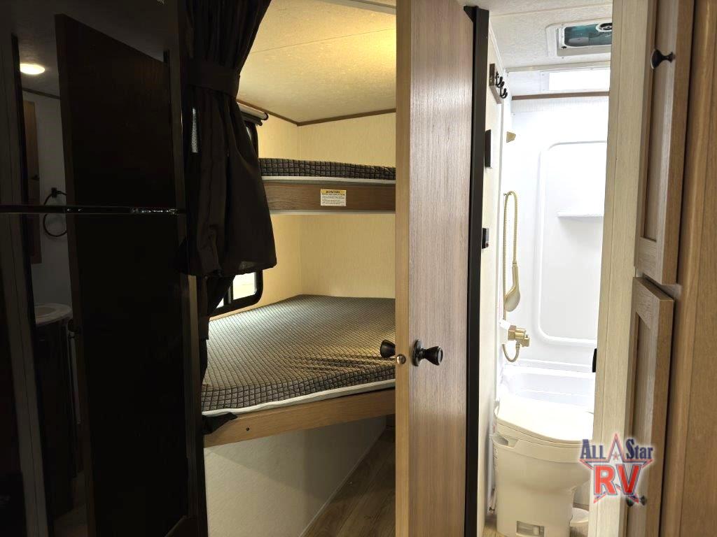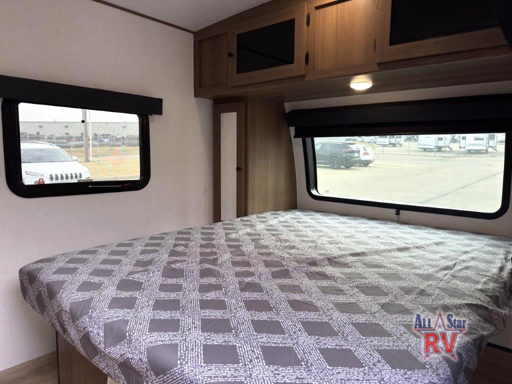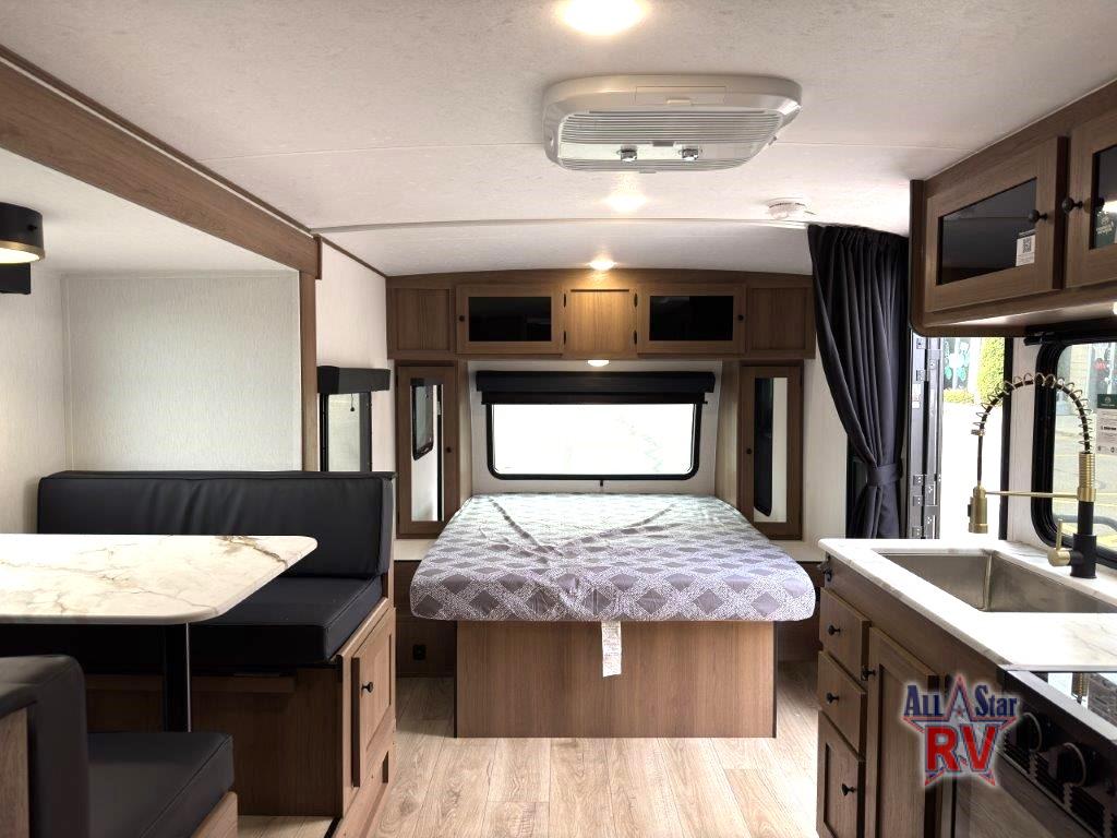 You and a few friends or family members can camp comfortably in this travel trailer! It features a front queen bed with wardrobes on either side to keep your clothes out of the way or you can switch it out for the optional Murphy bed for more versatility. Two others can sleep on the rear corner upper double bed and lower flip up double bed. After you have fried up some eggs on the two burner cooktop and heated up a piece of banana bread in the microwave, you can head to the booth dinette slide to enjoy it. There is even a pantry to store your coffee grounds and snacks. Now that your bellies are full, you can freshen up in the rear corner bathroom with the tub/shower.