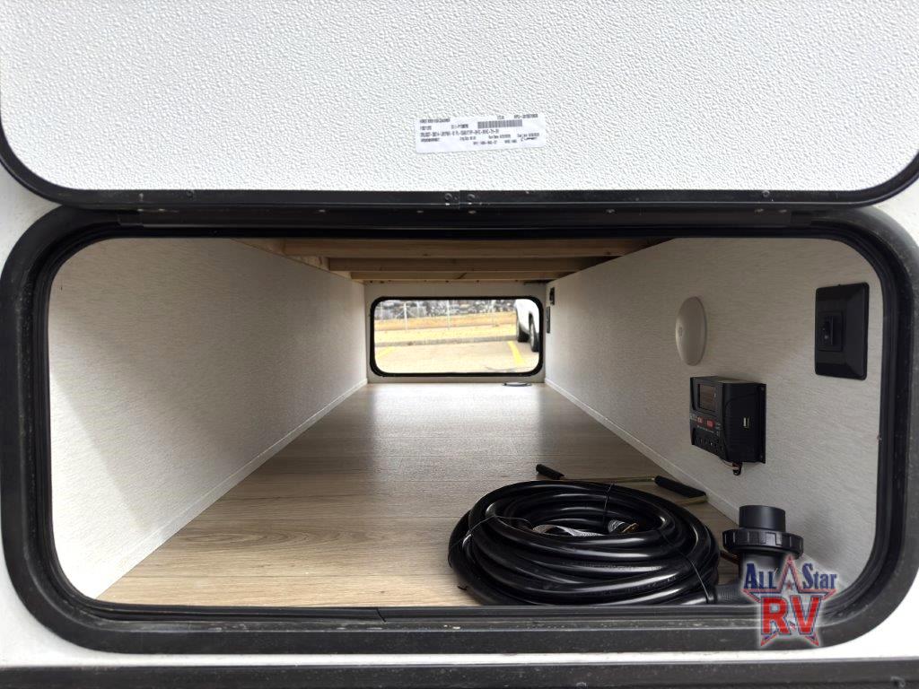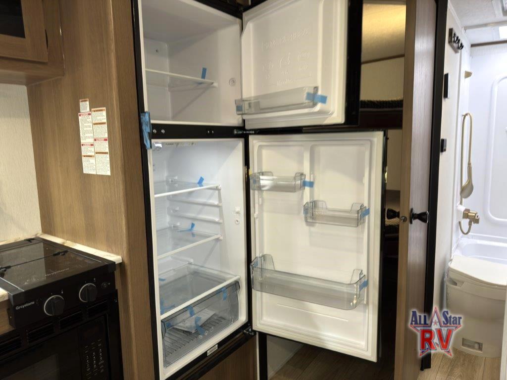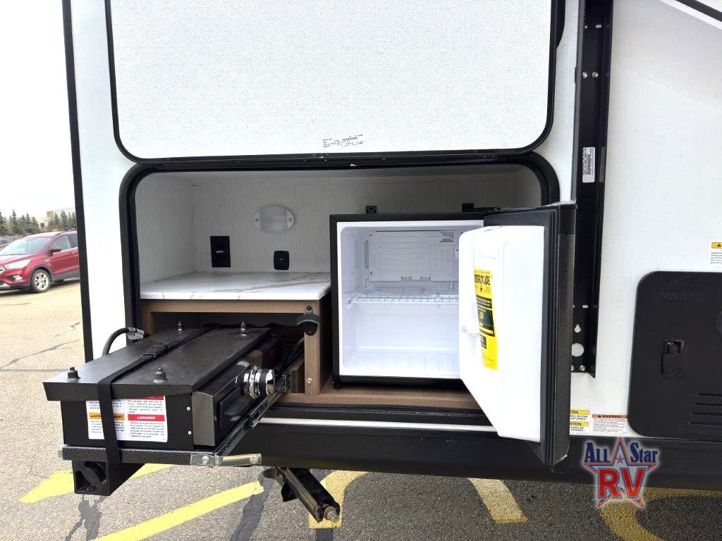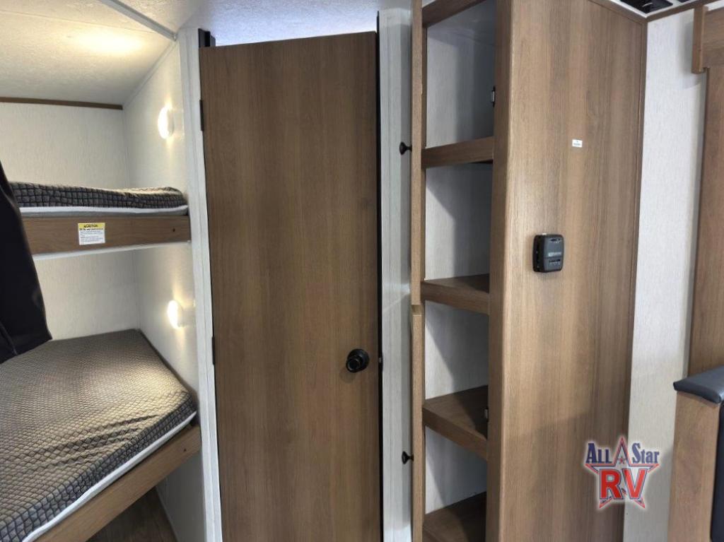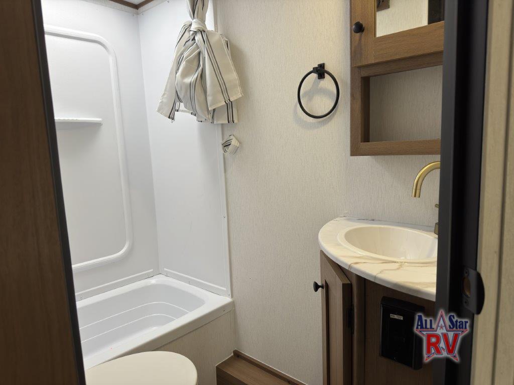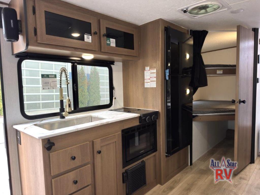 You and a few friends or family members can camp comfortably in this travel trailer! It features a front queen bed with wardrobes on either side to keep your clothes out of the way or you can switch it out for the optional Murphy bed for more versatility. Two others can sleep on the rear corner upper double bed and lower flip up double bed. After you have fried up some eggs on the two burner cooktop and heated up a piece of banana bread in the microwave, you can head to the booth dinette slide to enjoy it. There is even a pantry to store your coffee grounds and snacks. Now that your bellies are full, you can freshen up in the rear corner bathroom with the tub/shower.