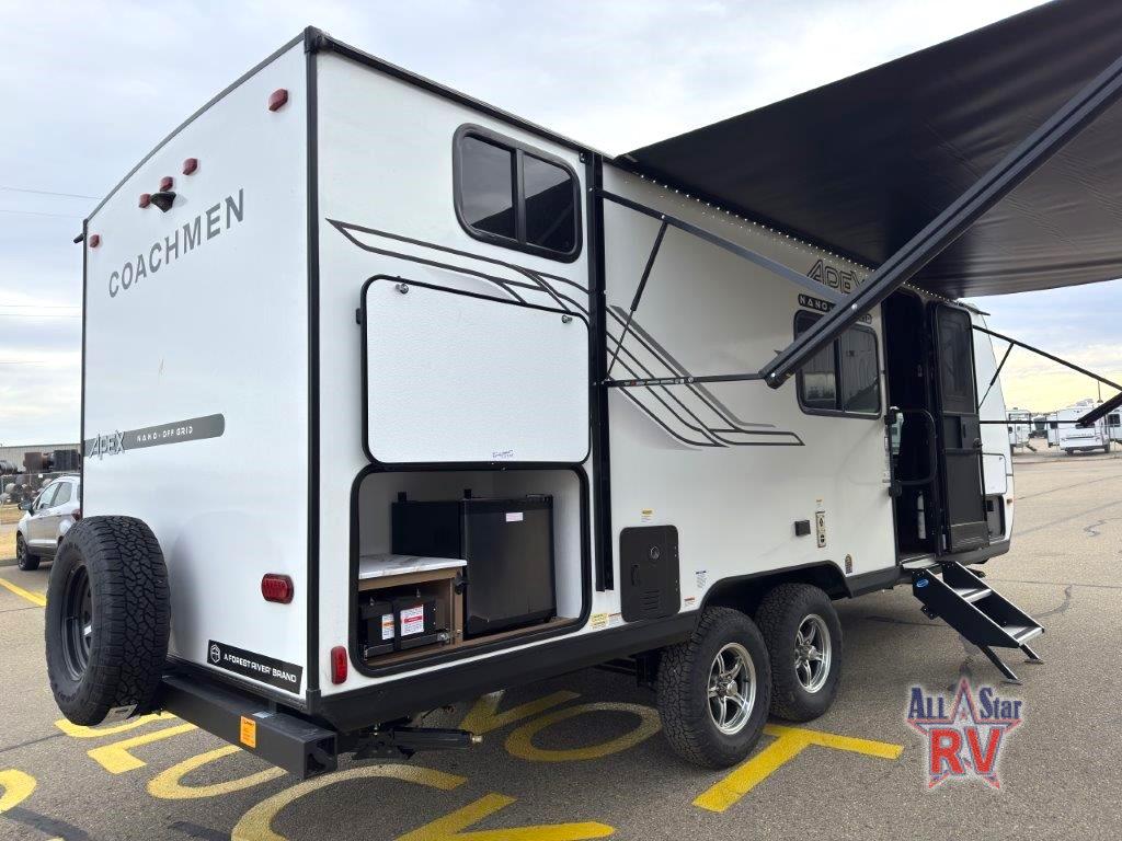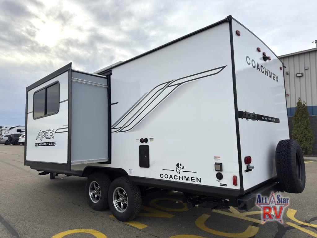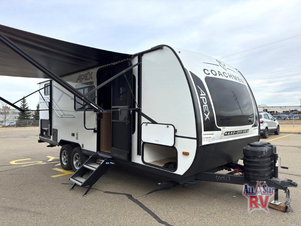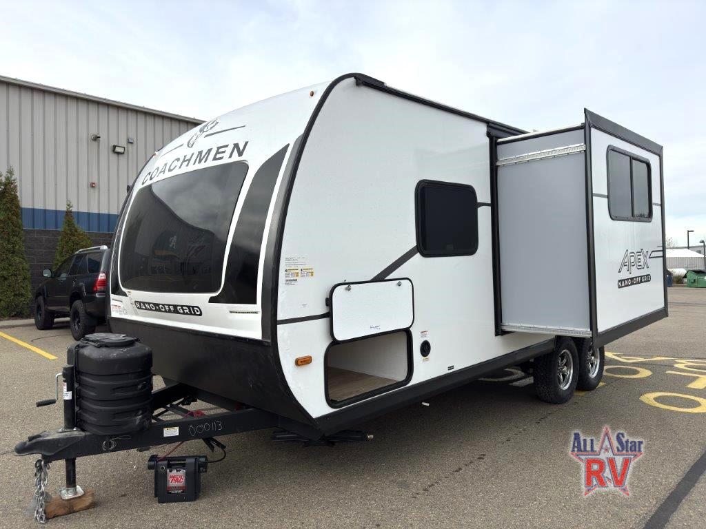 You will find comfort, convenience, and a sturdy construction with each of these Coachmen RV Apex Nano travel trailers! They are held together with an aluma-cage construction, an I-beam chassis, plus vacuum-bonded laminated dual Azdel fiberglass walls for double the protection against the elements. The 200-watt solar panel with a 30 amp control charger is included within the Off-Grid Package, along with two 20 lb. LP tanks, a high velocity power roof vent, plus 12V outlets to keep you powered up. More exterior feature include a hot/cold shower, four stabilizer jacks, a power awning with LED lighting, and magnetic baggage door catches to easily pack and unload your gear. You will love the interior of your Apex Nano with Congoleum residential flooring, one-piece seamless edge countertops, matte black hardware in the galley, and a hand-crafted wood medicine cabinet in the bath.