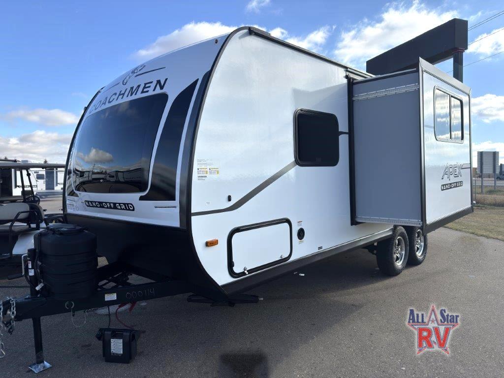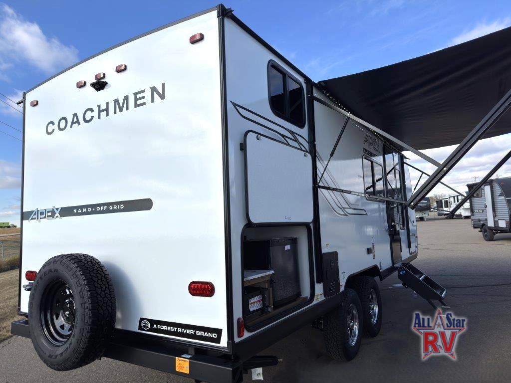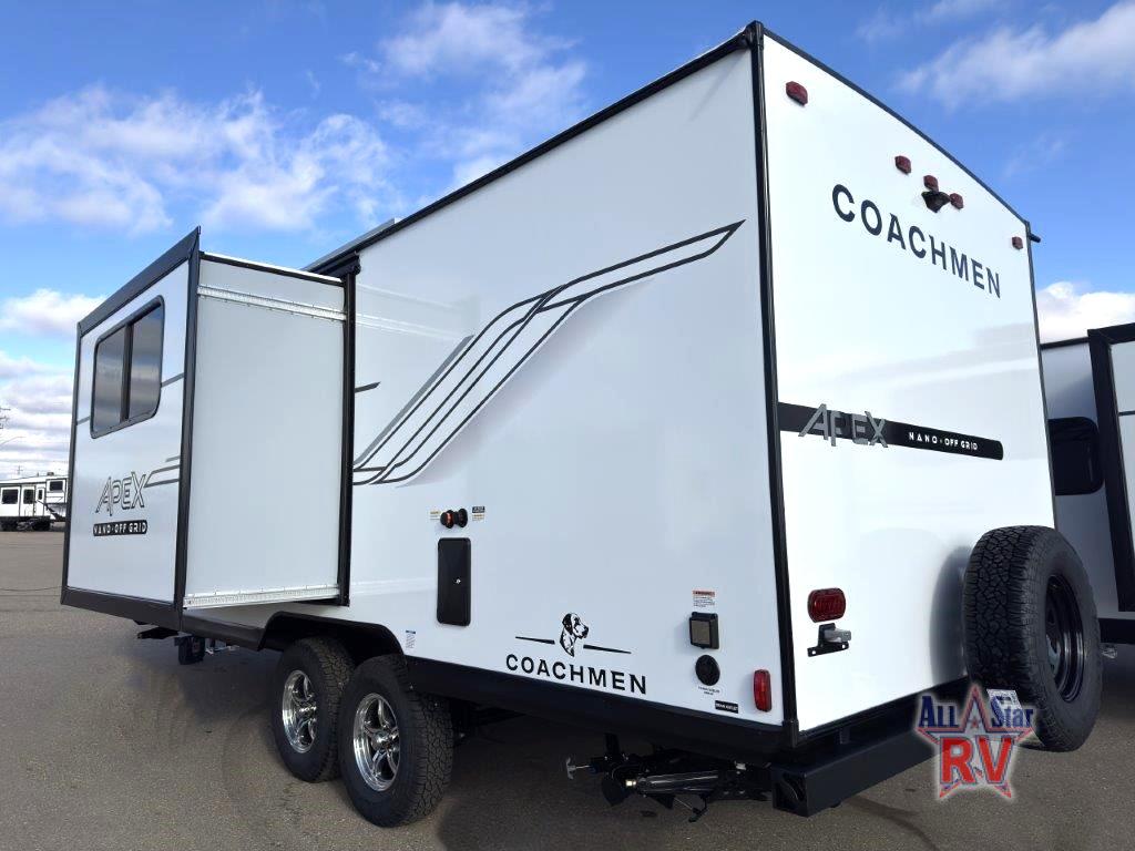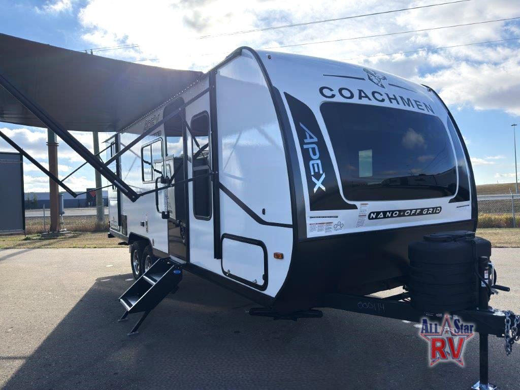 You will find comfort, convenience, and a sturdy construction with each of these Coachmen RV Apex Nano travel trailers! They are held together with an aluma-cage construction, an I-beam chassis, plus vacuum-bonded laminated dual Azdel fiberglass walls for double the protection against the elements. The 200-watt solar panel with a 30 amp control charger is included within the Off-Grid Package, along with two 20 lb. LP tanks, a high velocity power roof vent, plus 12V outlets to keep you powered up. More exterior feature include a hot/cold shower, four stabilizer jacks, a power awning with LED lighting, and magnetic baggage door catches to easily pack and unload your gear. You will love the interior of your Apex Nano with Congoleum residential flooring, one-piece seamless edge countertops, matte black hardware in the galley, and a hand-crafted wood medicine cabinet in the bath.