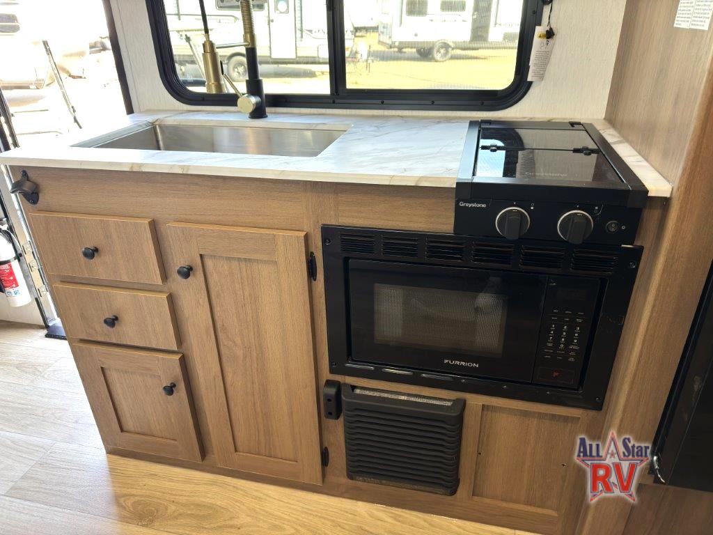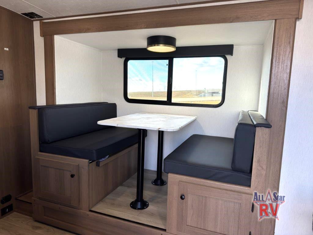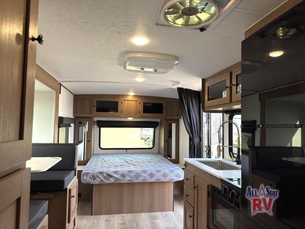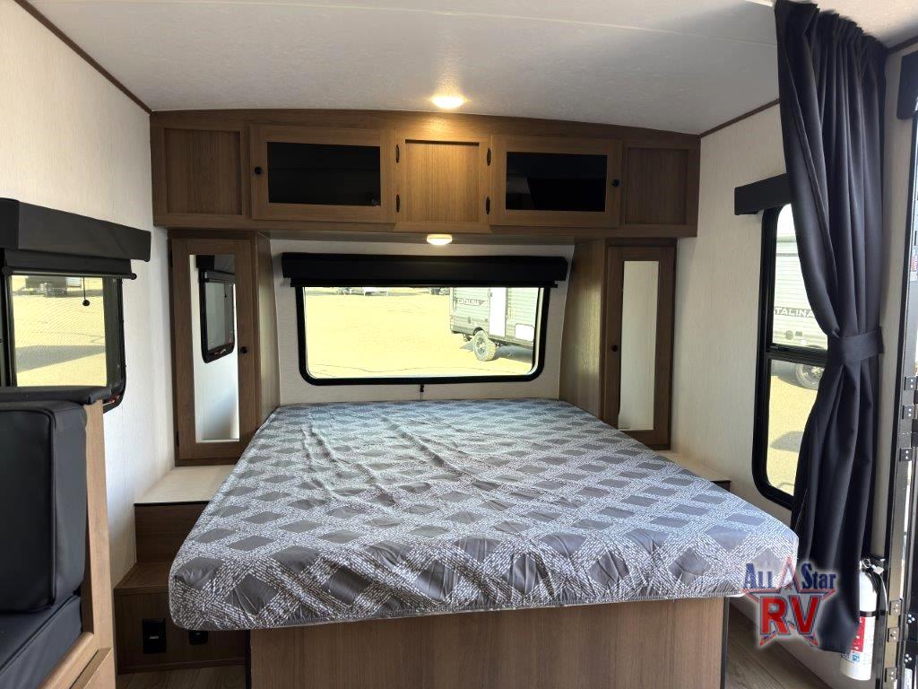 You and a few friends or family members can camp comfortably in this travel trailer! It features a front queen bed with wardrobes on either side to keep your clothes out of the way or you can switch it out for the optional Murphy bed for more versatility. Two others can sleep on the rear corner upper double bed and lower flip up double bed. After you have fried up some eggs on the two burner cooktop and heated up a piece of banana bread in the microwave, you can head to the booth dinette slide to enjoy it. There is even a pantry to store your coffee grounds and snacks. Now that your bellies are full, you can freshen up in the rear corner bathroom with the tub/shower.