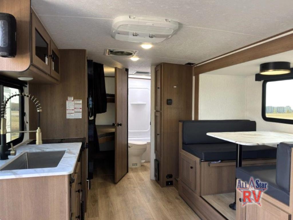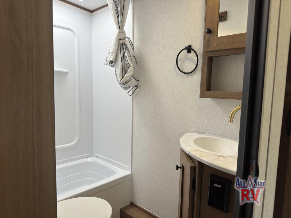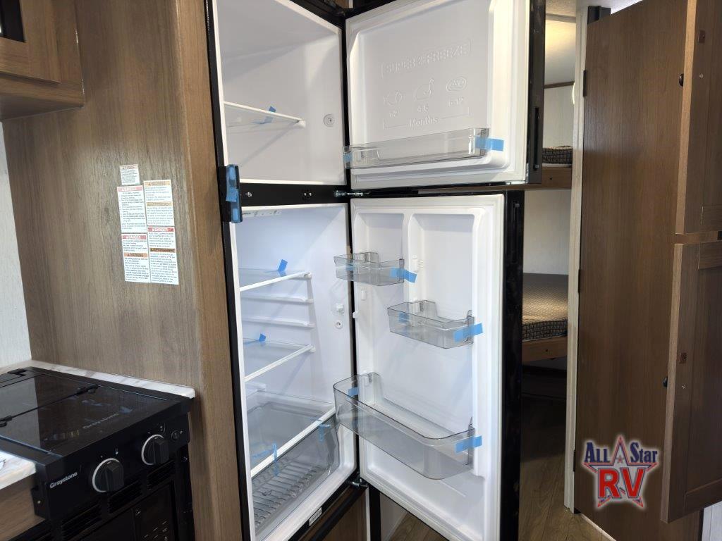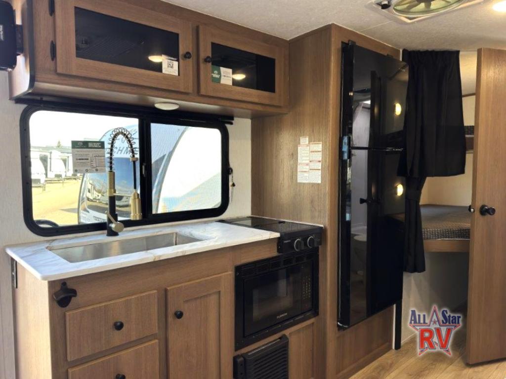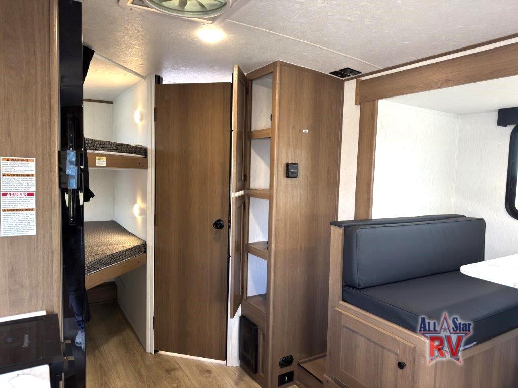 You and a few friends or family members can camp comfortably in this travel trailer! It features a front queen bed with wardrobes on either side to keep your clothes out of the way or you can switch it out for the optional Murphy bed for more versatility. Two others can sleep on the rear corner upper double bed and lower flip up double bed. After you have fried up some eggs on the two burner cooktop and heated up a piece of banana bread in the microwave, you can head to the booth dinette slide to enjoy it. There is even a pantry to store your coffee grounds and snacks. Now that your bellies are full, you can freshen up in the rear corner bathroom with the tub/shower.