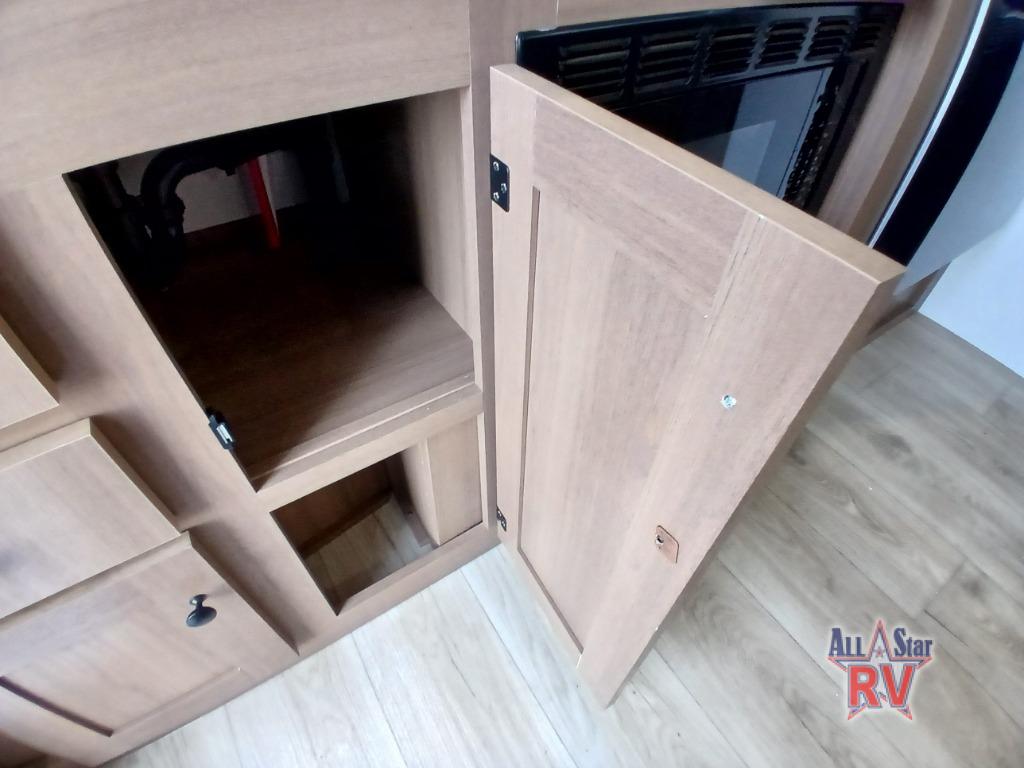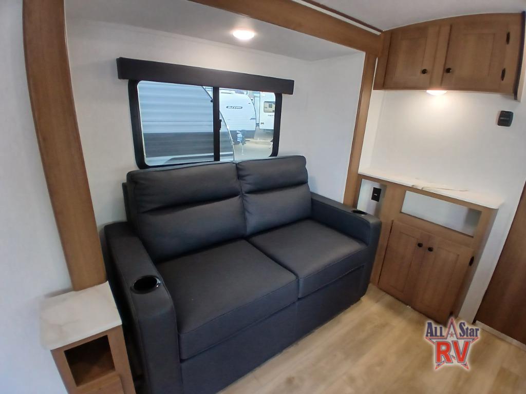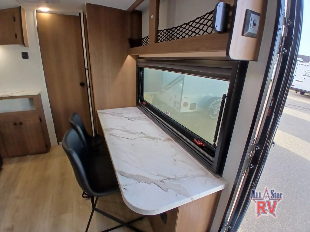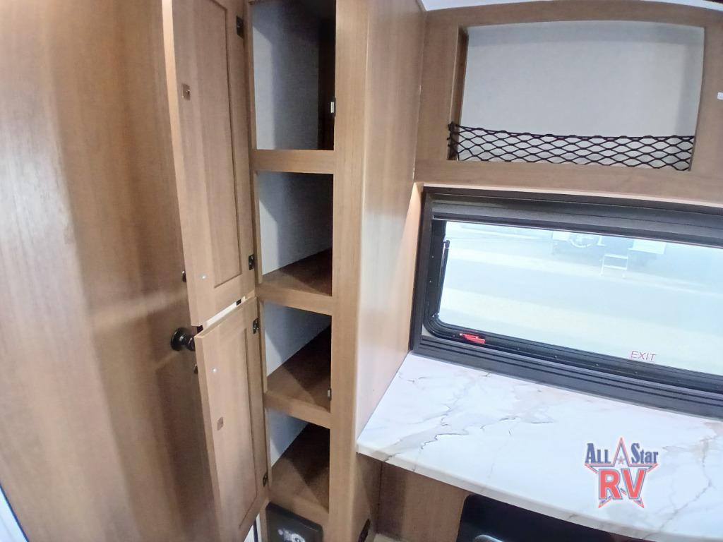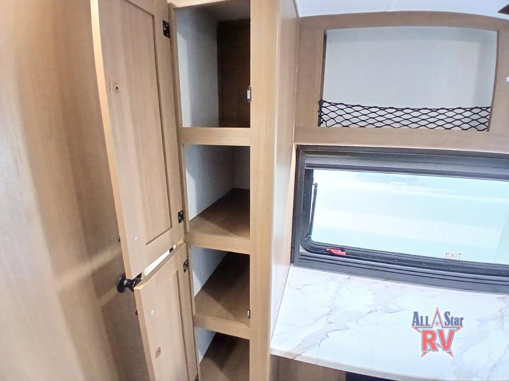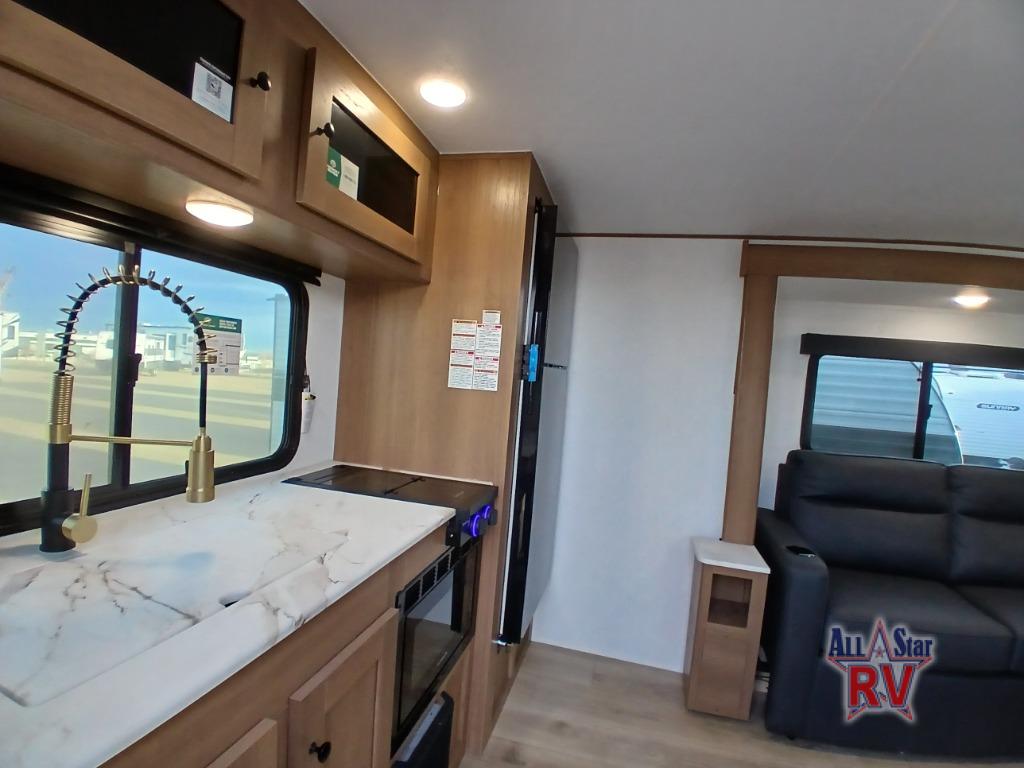 As you step inside, you’re welcomed by a spacious rear kitchen that spans the full width of the trailer, making meal prep both convenient and enjoyable. The kitchen is equipped with a stainless-steel sink featuring a flush mount cover for added counter space, a 2-burner cooktop, an air fryer microwave, and a 10 cu. ft. refrigerator, perfect for storing all your groceries. A pantry adds even more storage for dry goods and kitchen essentials. Just in front of the kitchen, a Bar-V counter with chairs offers a great spot to dine, work, or relax with company. Across from the counter, a comfortable sofa slide provides a cozy lounging area and can also convert into an extra sleeping space when needed. Moving forward, the walk-through bathroom features a shower, a skylight for natural light, and a foot flush toilet for added convenience. At the front of the trailer, the private bedroom includes a queen bed flanked by wardrobes on each side, offering both comfort and practical storage for all your essentials.