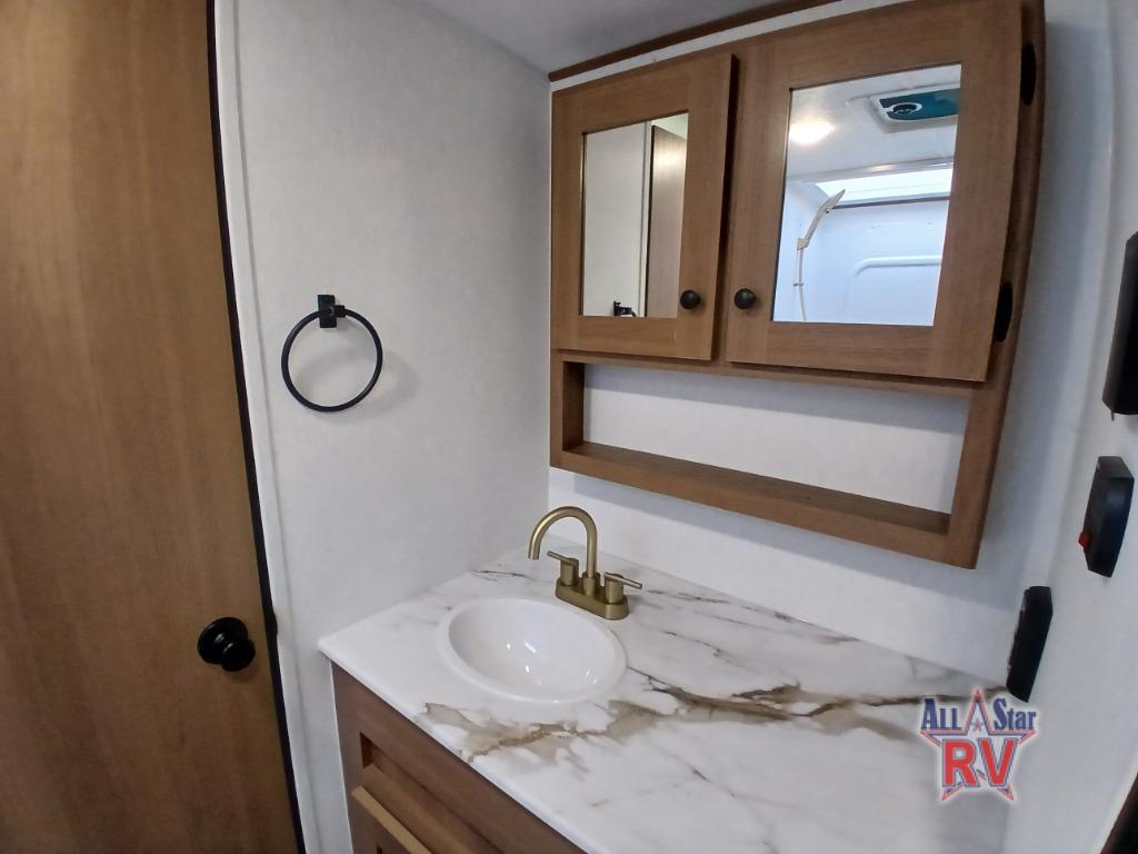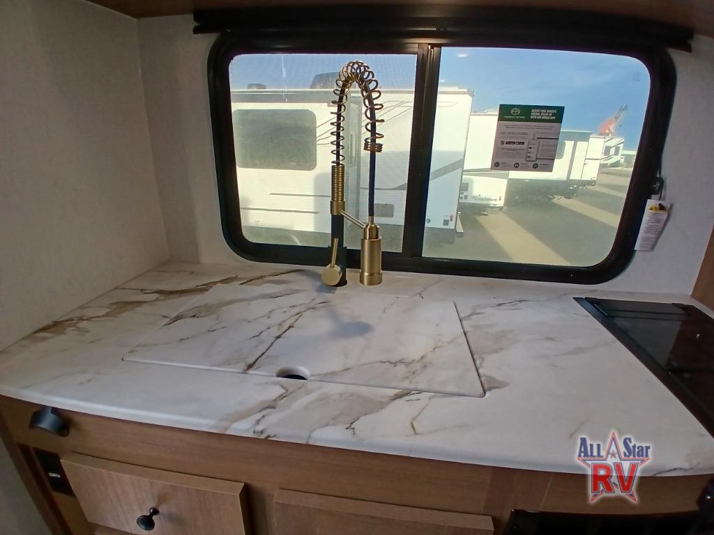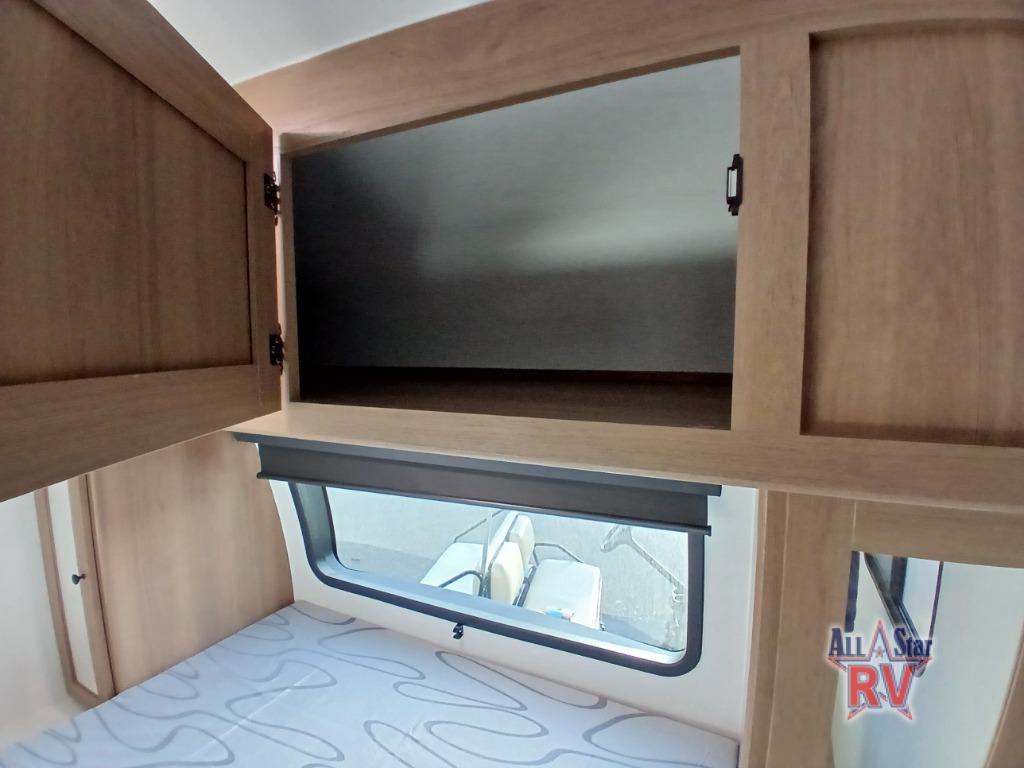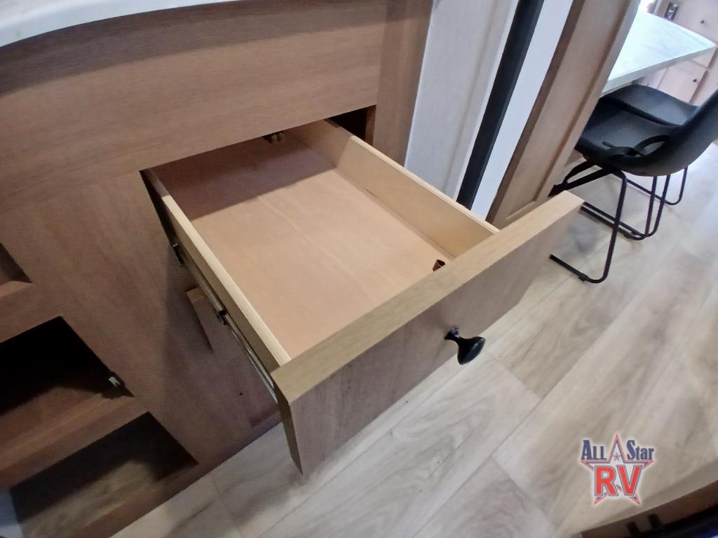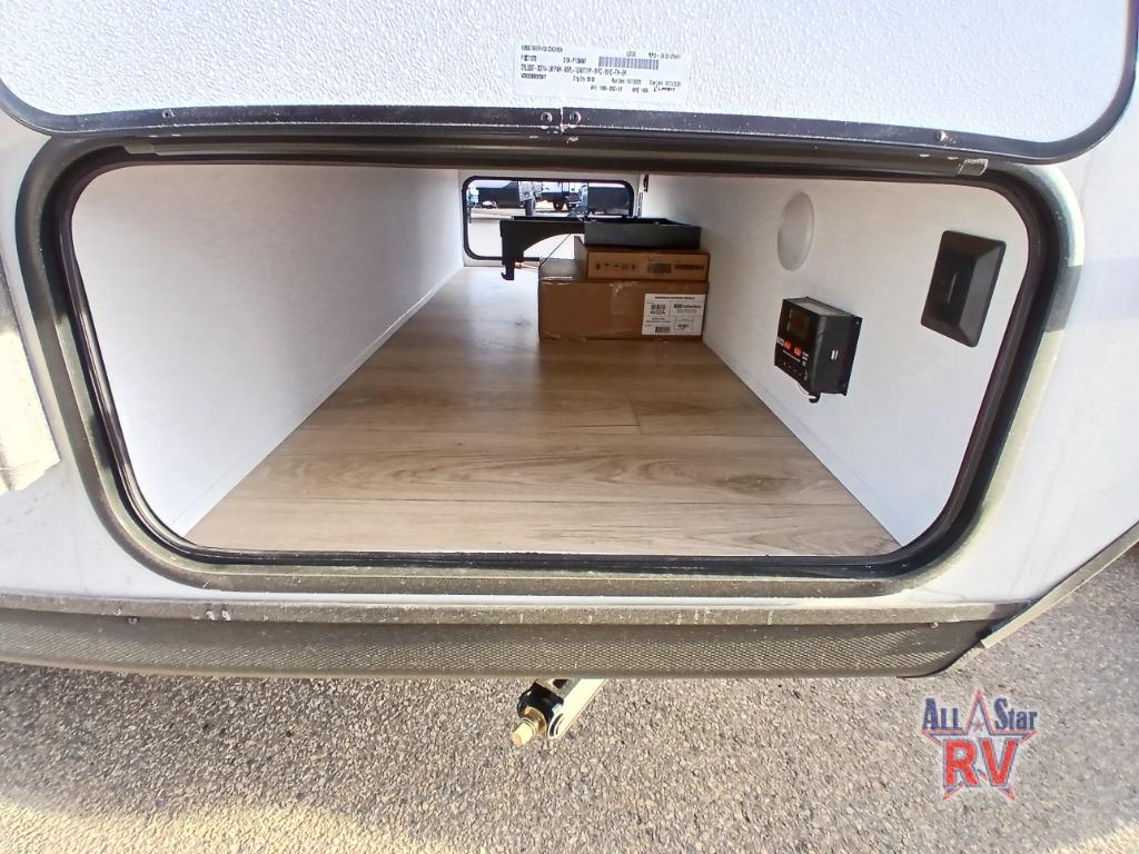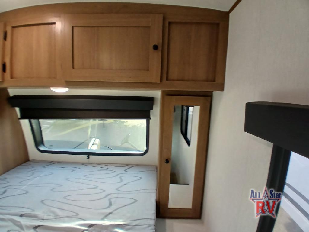 As you step inside, you’re welcomed by a spacious rear kitchen that spans the full width of the trailer, making meal prep both convenient and enjoyable. The kitchen is equipped with a stainless-steel sink featuring a flush mount cover for added counter space, a 2-burner cooktop, an air fryer microwave, and a 10 cu. ft. refrigerator, perfect for storing all your groceries. A pantry adds even more storage for dry goods and kitchen essentials. Just in front of the kitchen, a Bar-V counter with chairs offers a great spot to dine, work, or relax with company. Across from the counter, a comfortable sofa slide provides a cozy lounging area and can also convert into an extra sleeping space when needed. Moving forward, the walk-through bathroom features a shower, a skylight for natural light, and a foot flush toilet for added convenience. At the front of the trailer, the private bedroom includes a queen bed flanked by wardrobes on each side, offering both comfort and practical storage for all your essentials.