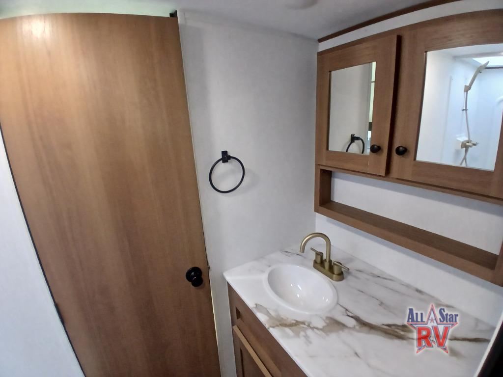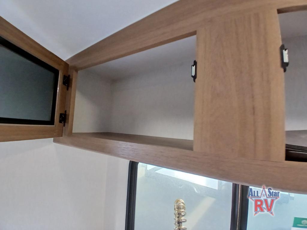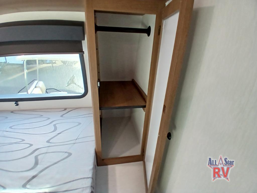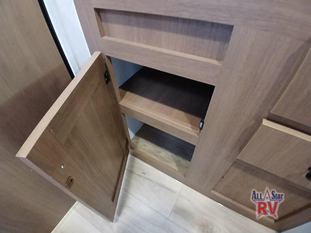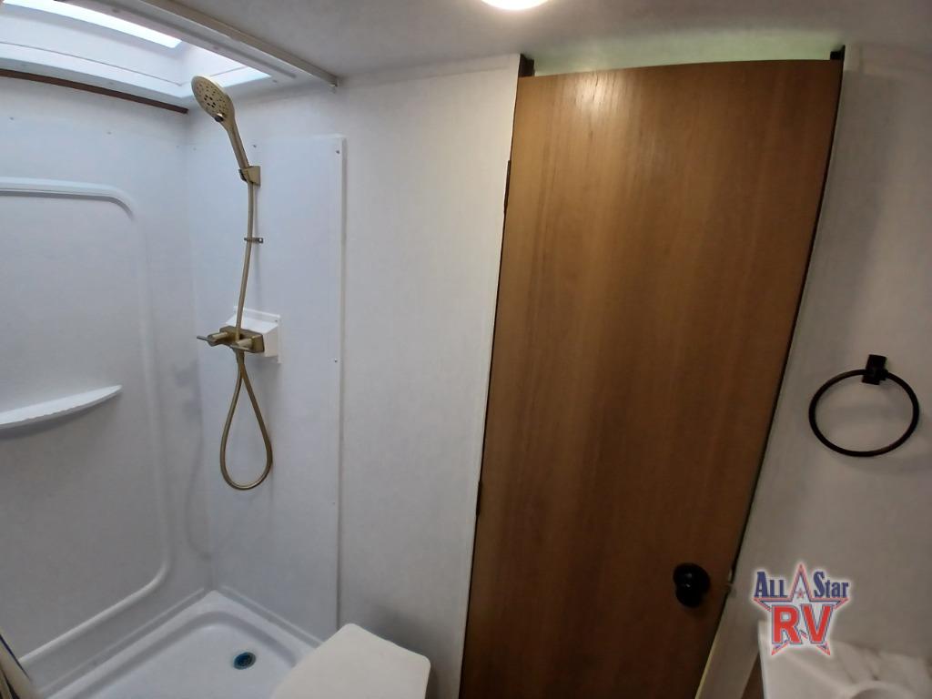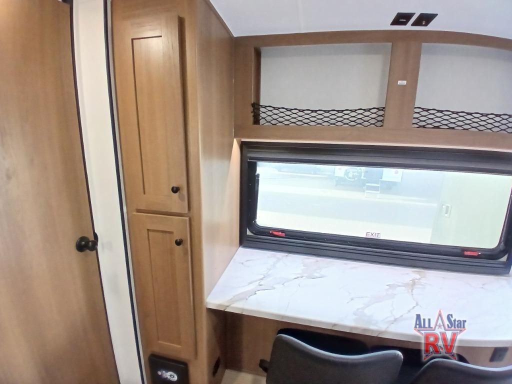 As you step inside, you’re welcomed by a spacious rear kitchen that spans the full width of the trailer, making meal prep both convenient and enjoyable. The kitchen is equipped with a stainless-steel sink featuring a flush mount cover for added counter space, a 2-burner cooktop, an air fryer microwave, and a 10 cu. ft. refrigerator, perfect for storing all your groceries. A pantry adds even more storage for dry goods and kitchen essentials. Just in front of the kitchen, a Bar-V counter with chairs offers a great spot to dine, work, or relax with company. Across from the counter, a comfortable sofa slide provides a cozy lounging area and can also convert into an extra sleeping space when needed. Moving forward, the walk-through bathroom features a shower, a skylight for natural light, and a foot flush toilet for added convenience. At the front of the trailer, the private bedroom includes a queen bed flanked by wardrobes on each side, offering both comfort and practical storage for all your essentials.