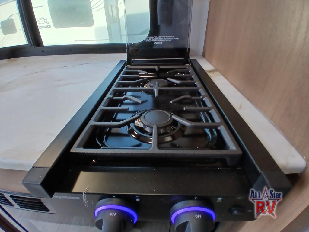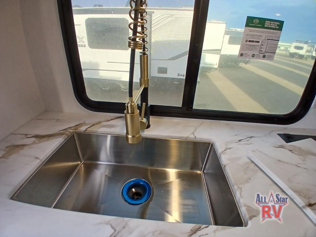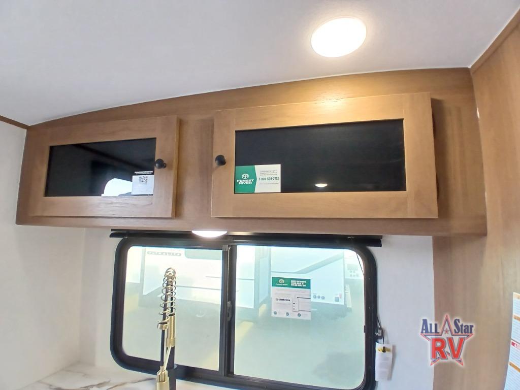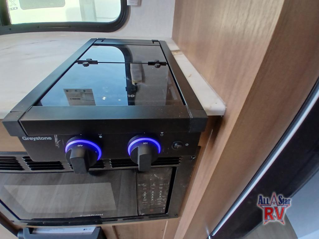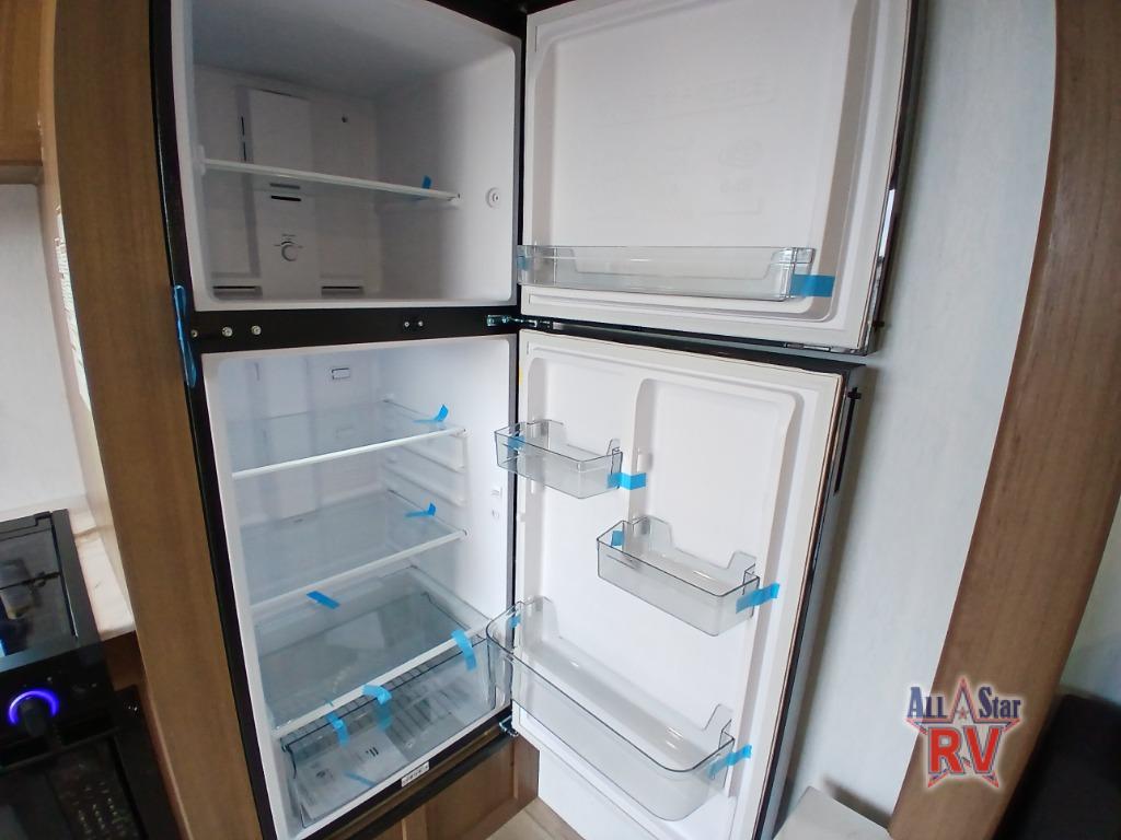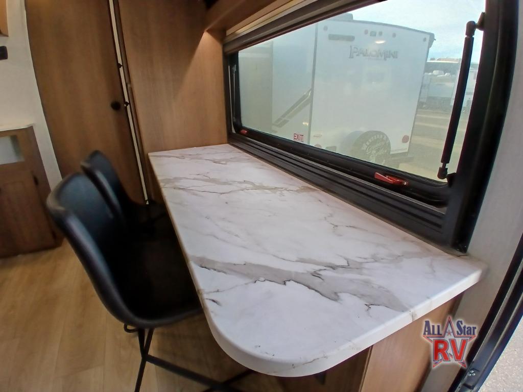 As you step inside, you’re welcomed by a spacious rear kitchen that spans the full width of the trailer, making meal prep both convenient and enjoyable. The kitchen is equipped with a stainless-steel sink featuring a flush mount cover for added counter space, a 2-burner cooktop, an air fryer microwave, and a 10 cu. ft. refrigerator, perfect for storing all your groceries. A pantry adds even more storage for dry goods and kitchen essentials. Just in front of the kitchen, a Bar-V counter with chairs offers a great spot to dine, work, or relax with company. Across from the counter, a comfortable sofa slide provides a cozy lounging area and can also convert into an extra sleeping space when needed. Moving forward, the walk-through bathroom features a shower, a skylight for natural light, and a foot flush toilet for added convenience. At the front of the trailer, the private bedroom includes a queen bed flanked by wardrobes on each side, offering both comfort and practical storage for all your essentials.