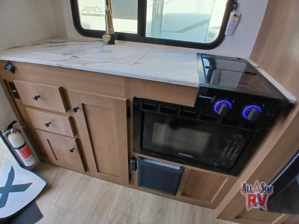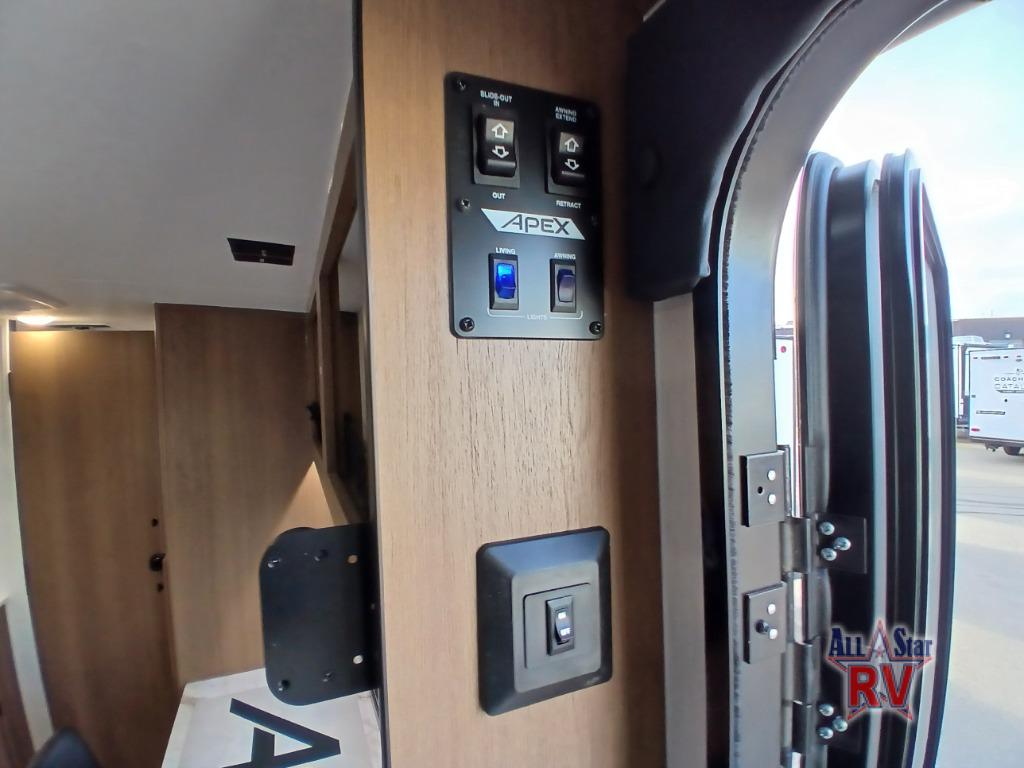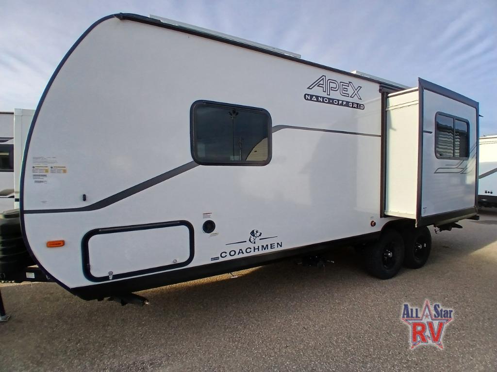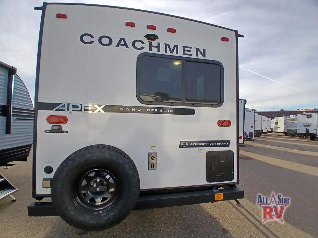 You will find comfort, convenience, and a sturdy construction with each of these Coachmen RV Apex Nano travel trailers! They are held together with an aluma-cage construction, an I-beam chassis, plus vacuum-bonded laminated dual Azdel fiberglass walls for double the protection against the elements. The 400-watt solar panel with a 30 amp control charger is included, along with two 20 lb. LP tanks, a high velocity power roof vent, plus 12V outlets to keep you powered up. More exterior features include a hot/cold shower, four stabilizer jacks, a power awning with LED lighting, and radius thumb latch baggage doors to easily pack and unload your gear. You will love the interior of your Apex Nano with Congoleum residential flooring, one-piece seamless edge countertops, matte black hardware in the galley, and a hand-crafted wood medicine cabinet in the bath.
