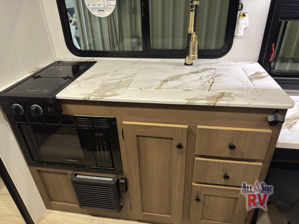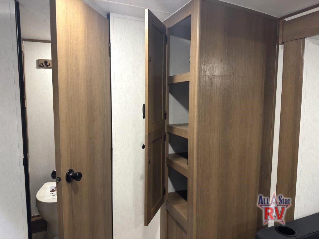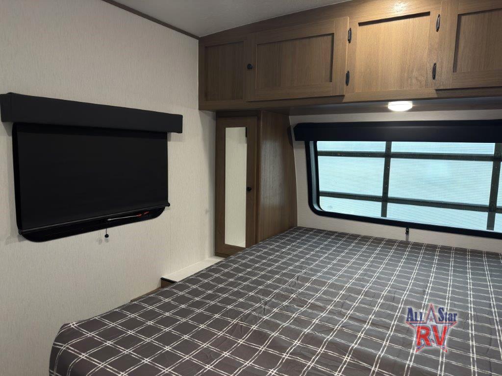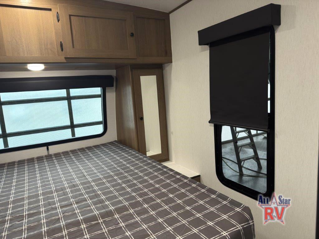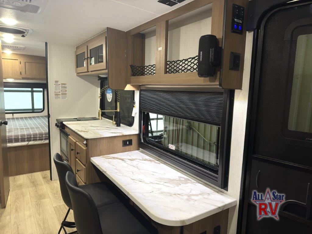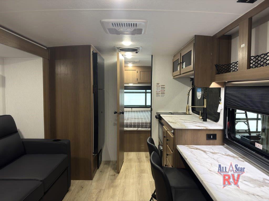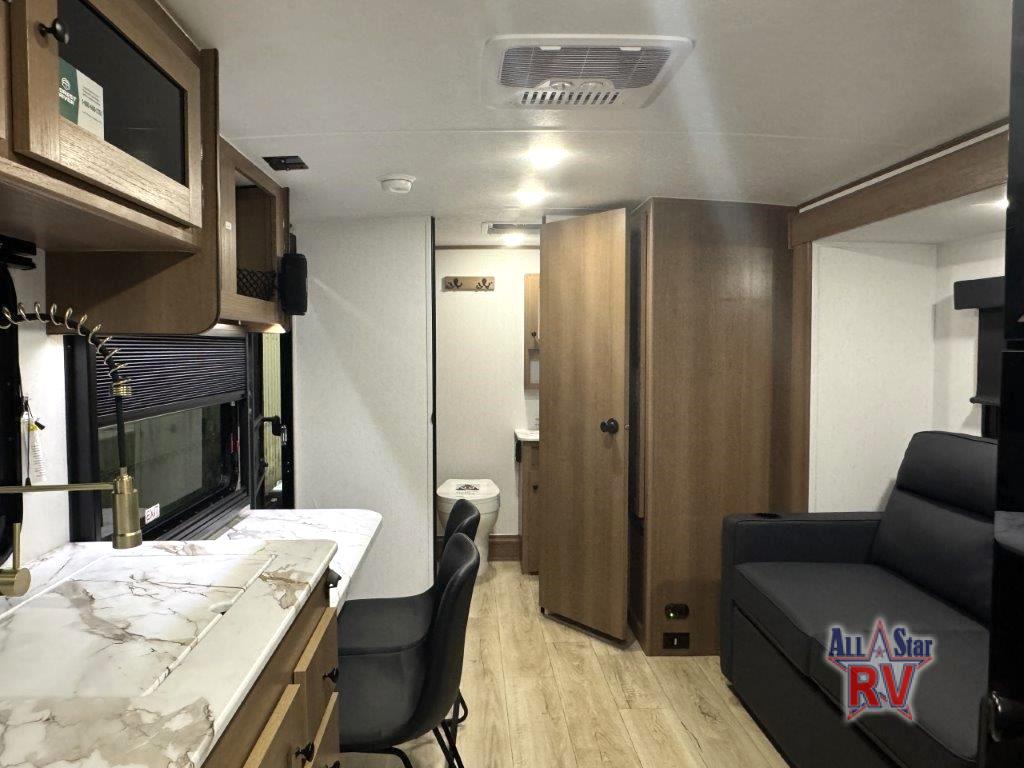 As you enter this travel trailer, you'll find the full rear bathroom designed for comfort and convenience. It features a shower, a skylight for natural light, and an on-demand tankless water heater, ensuring hot showers whenever you need them. A foot flush toilet and a wardrobe offer added practicality and storage for your essentials. Moving to the middle of the trailer, the main living area includes a sofa slide-out nestled between a pantry, perfect for storing snacks and dry goods, and a 10-cu. ft. refrigerator to keep your groceries fresh. Opposite the slide, the kitchen is fully equipped with a 2-burner cooktop and an air fryer microwave, allowing you to prepare meals with ease. Beside the kitchen is a counter with chairs, offering a cozy spot to dine or relax. At the front of the trailer, the private bedroom features a comfortable queen bed and dual wardrobes on either side, giving you a restful retreat with plenty of storage for your clothes and personal items.