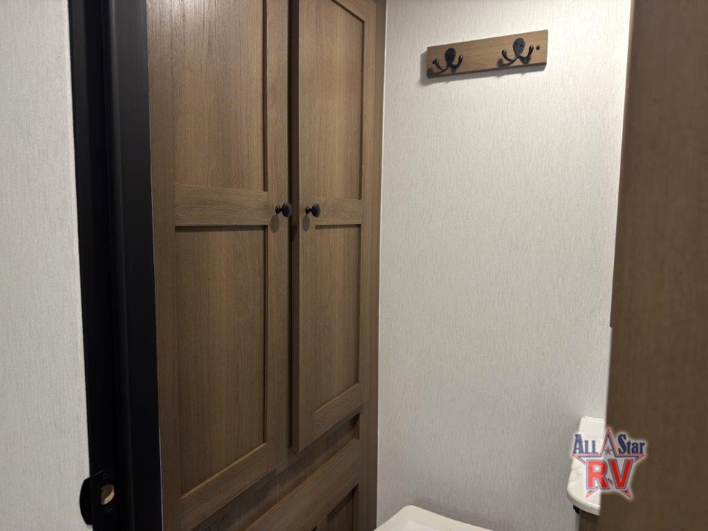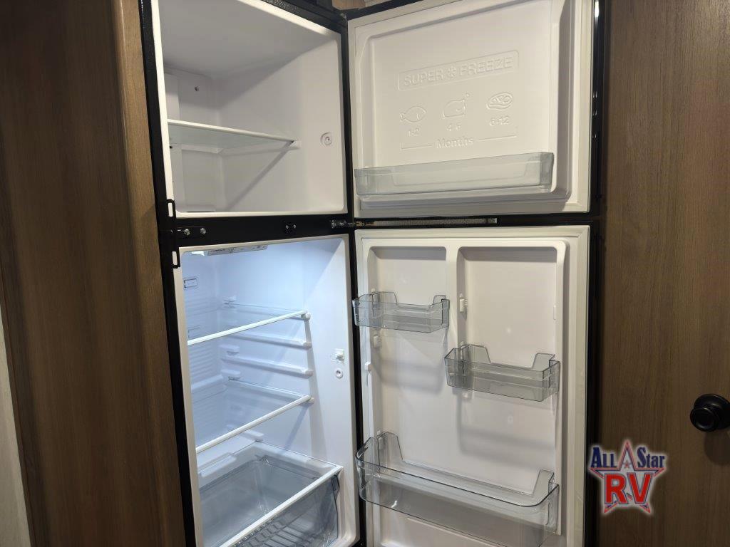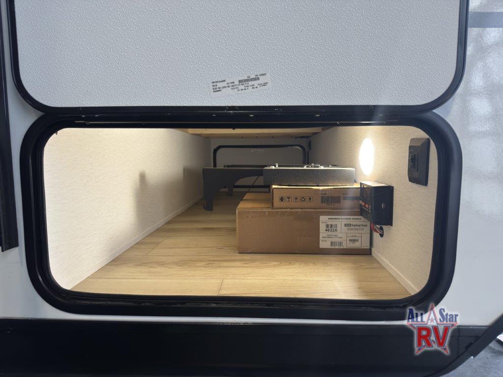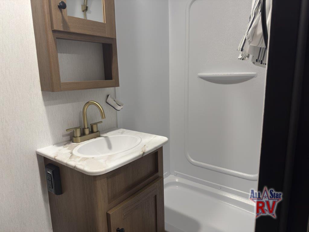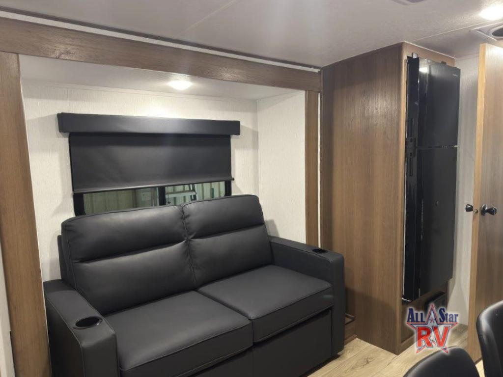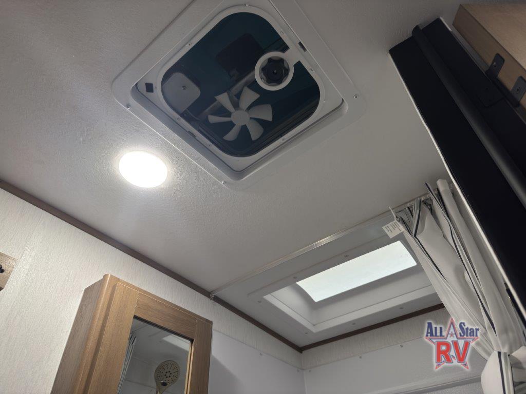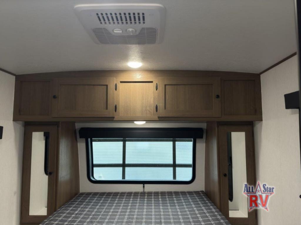 As you enter this travel trailer, you'll find the full rear bathroom designed for comfort and convenience. It features a shower, a skylight for natural light, and an on-demand tankless water heater, ensuring hot showers whenever you need them. A foot flush toilet and a wardrobe offer added practicality and storage for your essentials. Moving to the middle of the trailer, the main living area includes a sofa slide-out nestled between a pantry, perfect for storing snacks and dry goods, and a 10-cu. ft. refrigerator to keep your groceries fresh. Opposite the slide, the kitchen is fully equipped with a 2-burner cooktop and an air fryer microwave, allowing you to prepare meals with ease. Beside the kitchen is a counter with chairs, offering a cozy spot to dine or relax. At the front of the trailer, the private bedroom features a comfortable queen bed and dual wardrobes on either side, giving you a restful retreat with plenty of storage for your clothes and personal items.