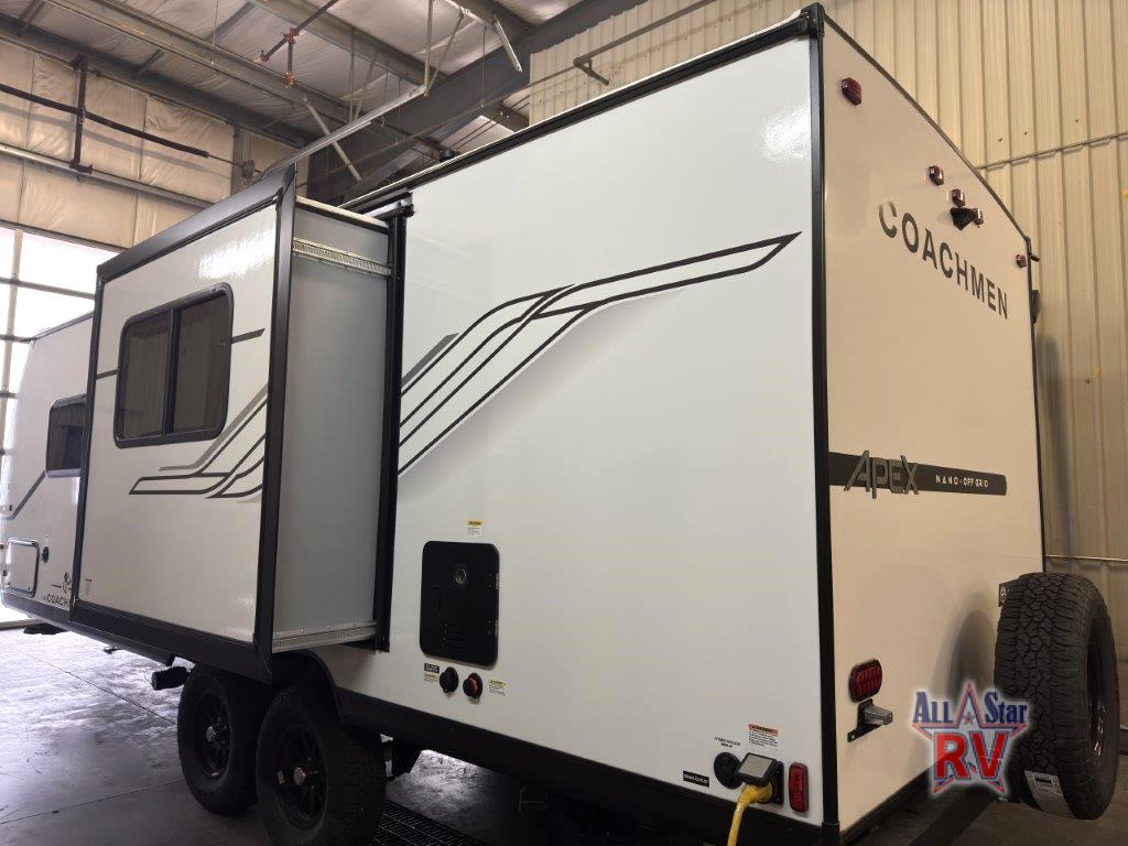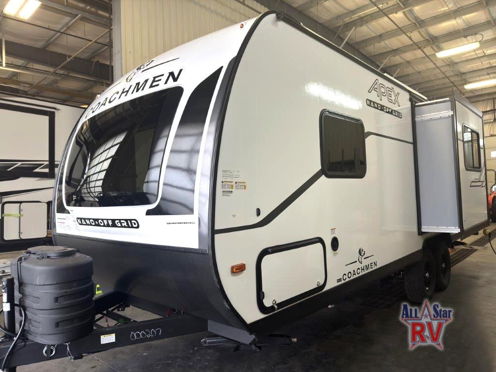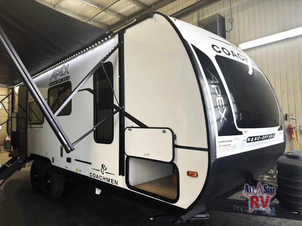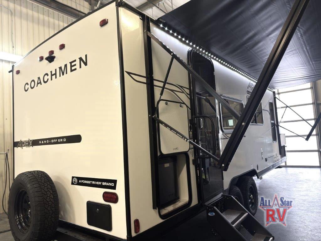 You will find comfort, convenience, and a sturdy construction with each of these Coachmen RV Apex Nano travel trailers! They are held together with an aluma-cage construction, an I-beam chassis, plus vacuum-bonded laminated dual Azdel fiberglass walls for double the protection against the elements. The 400-watt solar panel with a 30-amp control charger is included, along with two 20 lb. LP tanks, a high velocity power roof vent, plus 12V outlets to keep you powered up. More exterior features include a hot/cold shower, four stabilizer jacks, a power awning with LED lighting, and radius thumb latch baggage doors to easily pack and unload your gear. You will love the interior of your Apex Nano with Congoleum residential flooring, one-piece seamless edge countertops, matte black hardware in the galley, and a hand-crafted wood medicine cabinet in the bath.