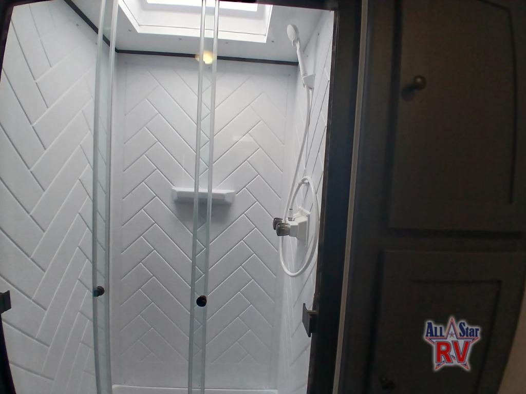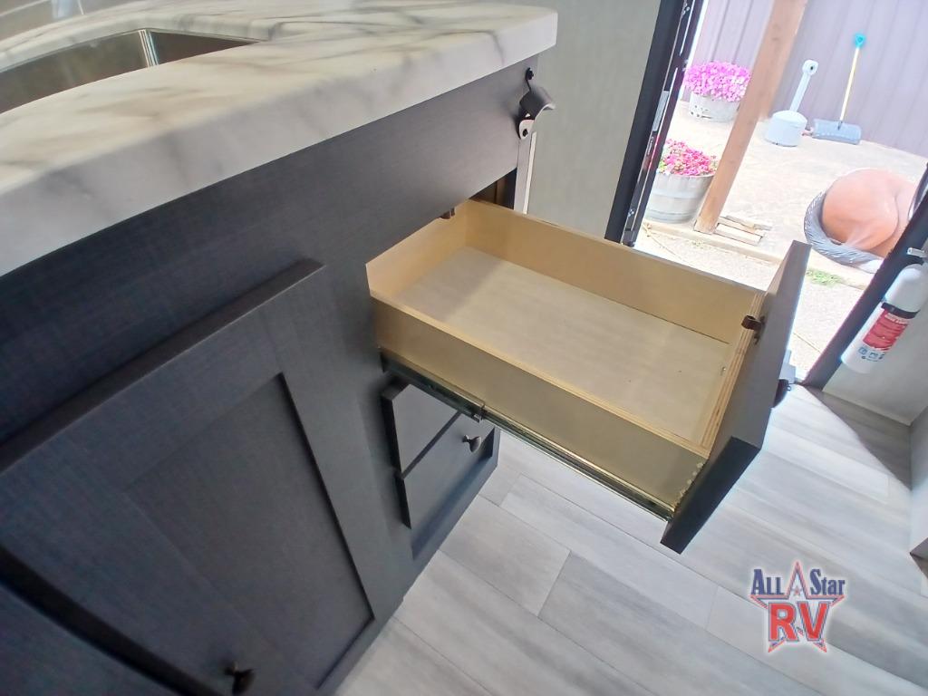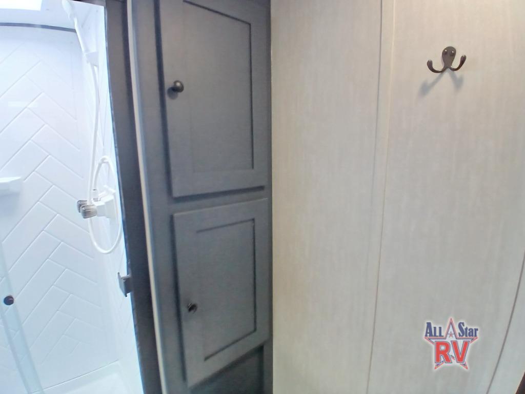 This travel trailer resembles the layout of 242BARV, but you'll enjoy the added semi-private bunkhouse in this unit. There is a 30" x 74" bottom bunk with storage and a 30" x 74" tilt-up bunk above, plus a wardrobe and flip-up TV prep in the wall. The owners will enjoy the front private bedroom with a 60 x 80 queen bed with super storage, dual wardrobes beside the bed and a overhead cabinet. In the kitchen area you will find a 12V refrigerator, pantry, three burner cooktop and a bar countertop with chairs. There is also a tri-fold sofa slide for more seating and sleeping space. This unit also includes a spacious full bath with one of the dual entry doors to the unit for added convenience!