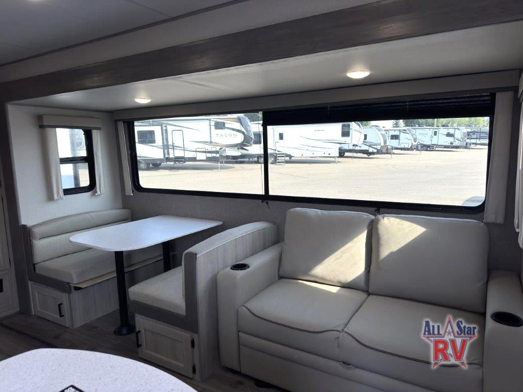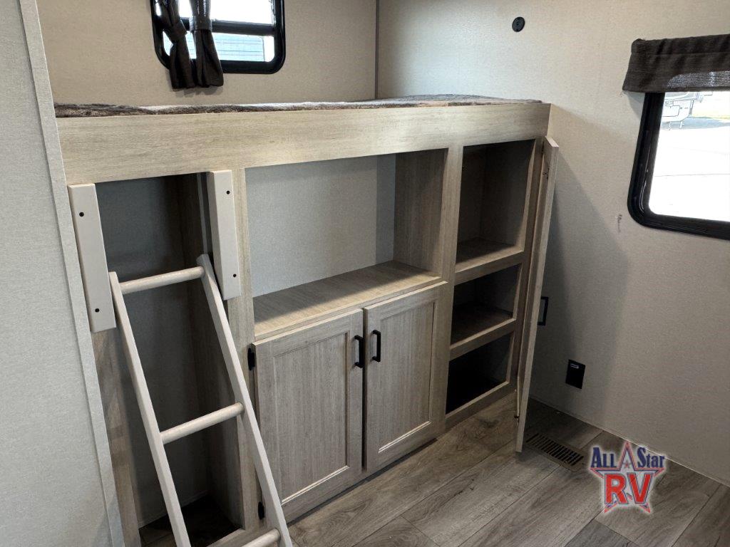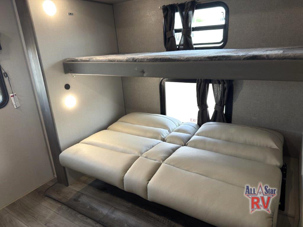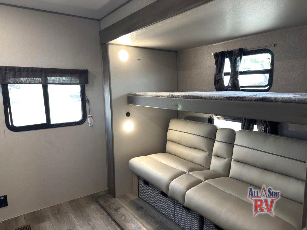 This family-friendly trailer offers lots of floor space thanks to the triple slides throughout! You and your family will love the combined living and kitchen area with a slide out booth dinette and a sofa with drink holders. The L-shaped kitchen counter allows the cook to make meals without moving for anyone trying to get to the full bathroom or the rear bunkhouse. The kids will have their own privacy, two bunk beds, a jack knife sofa with storage totes below plus a TV/wardrobe cabinet. The front private bedroom allows you to sleep like royalty, and offers a large closet for your clothing and another closet prepped for a washer/dryer. And don't forget about the full size camper kitchen and the 21' power awning with multicolor LED lights when you are outside.
