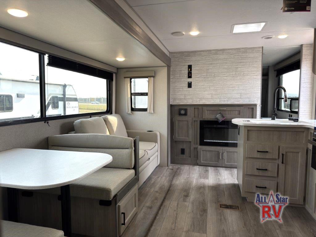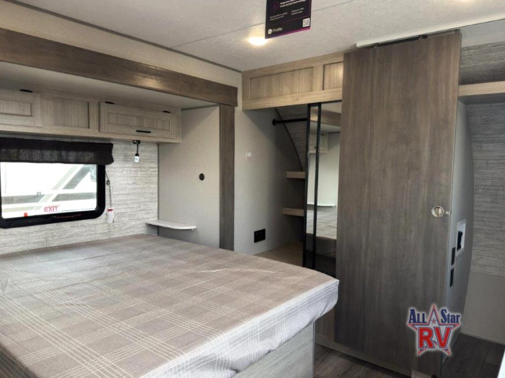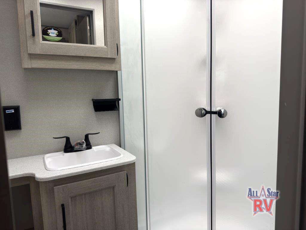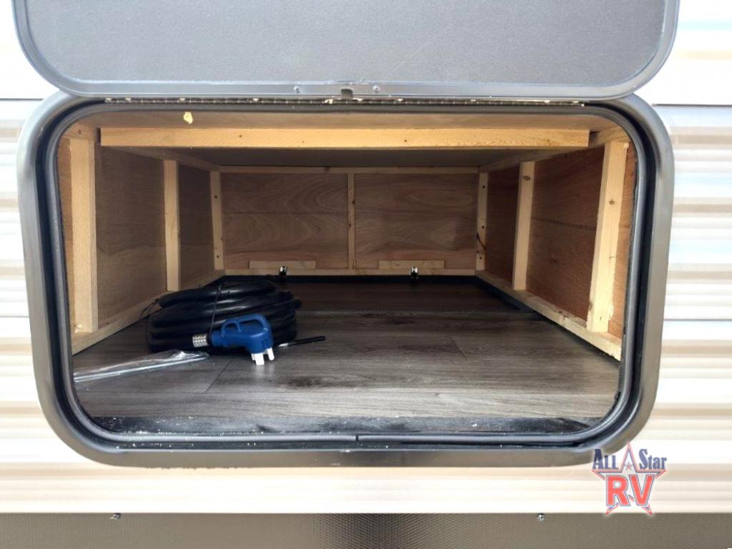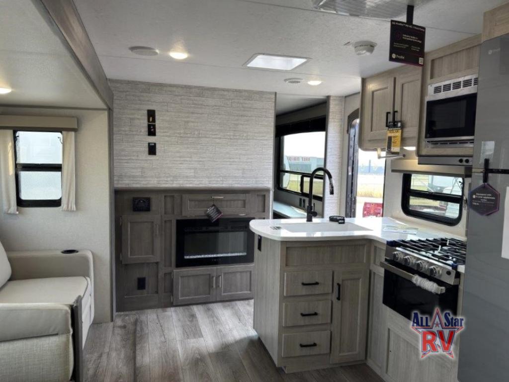 This family-friendly trailer offers lots of floor space thanks to the triple slides throughout! You and your family will love the combined living and kitchen area with a slide out booth dinette and a sofa with drink holders. The L-shaped kitchen counter allows the cook to make meals without moving for anyone trying to get to the full bathroom or the rear bunkhouse. The kids will have their own privacy, two bunk beds, a jack knife sofa with storage totes below plus a TV/wardrobe cabinet. The front private bedroom allows you to sleep like royalty, and offers a large closet for your clothing and another closet prepped for a washer/dryer. And don't forget about the full size camper kitchen and the 21' power awning with multicolor LED lights when you are outside.