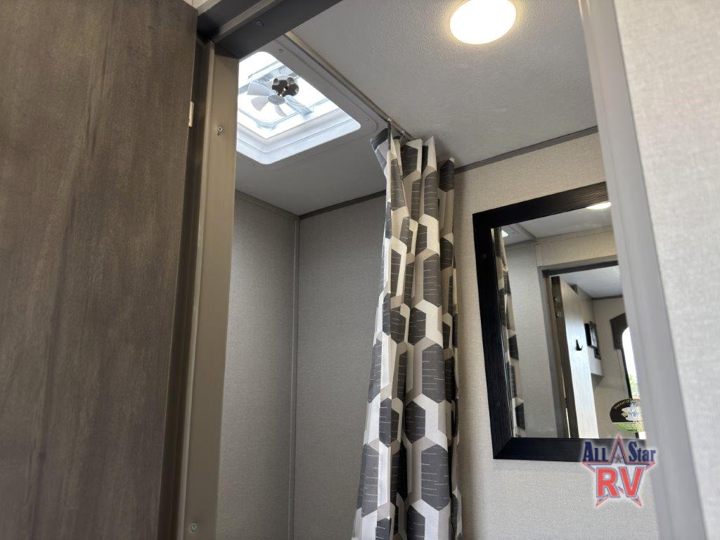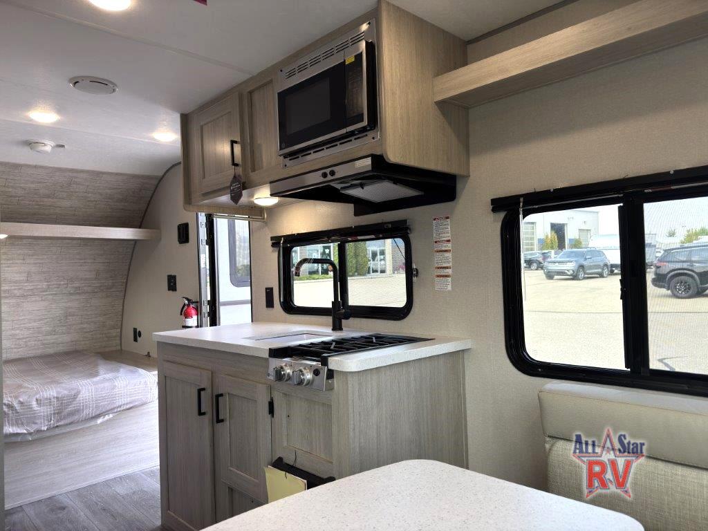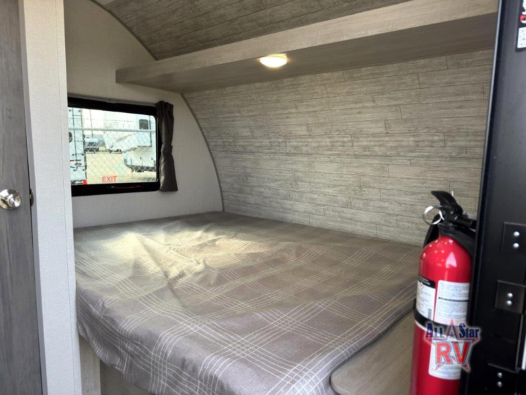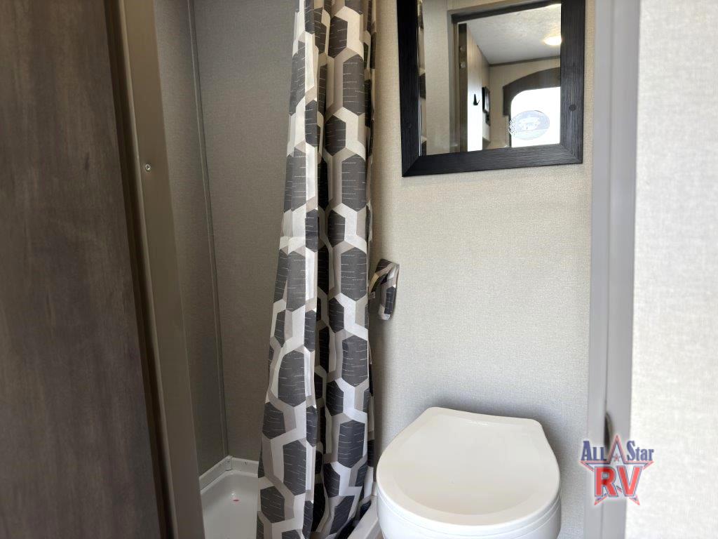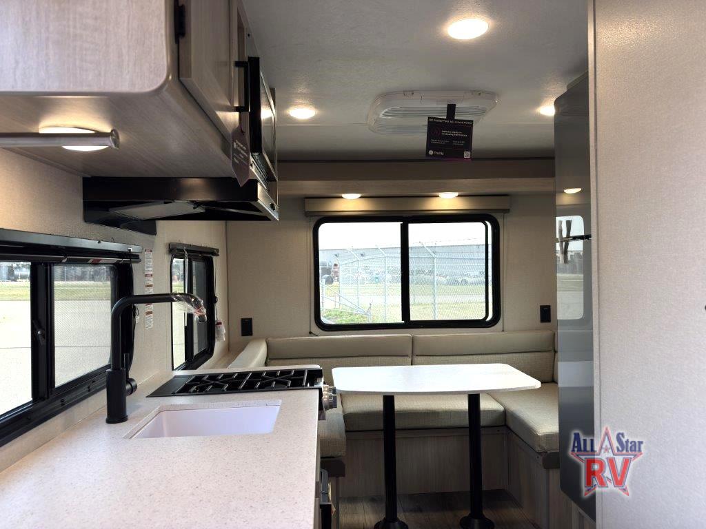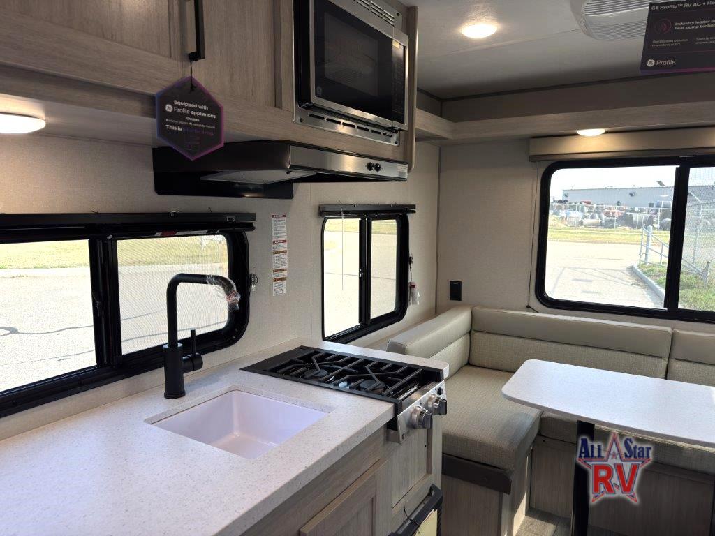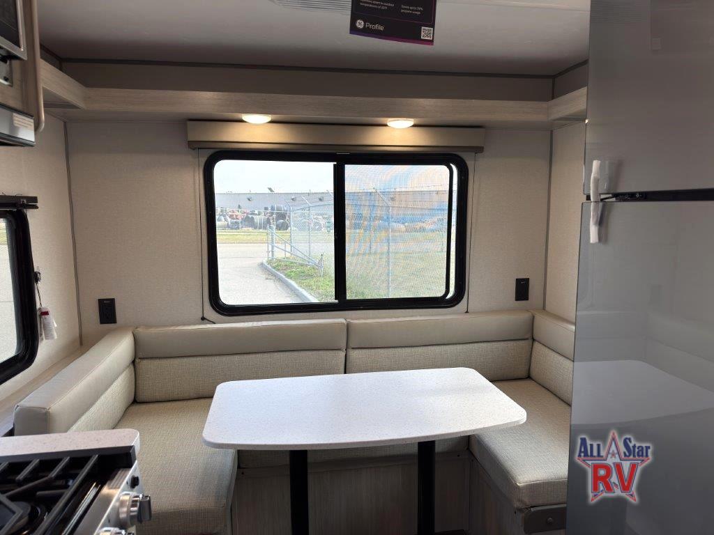 The perfect unit for a cozy weekend retreat for two or three! There is a queen bed up front with overhead storage and more at the foot of the bed to keep your things tidy. The rear of the unit offers a U-shaped dinette with an end table on one end and a handy overhead shelf which is a great spot for meals, watching TV or playing cards and games. A mid-coach bath includes a 36" x 30" shower and toilet with foot flush, plus a storage shelf for necessities. This model also includes a GE two burner cooktop, a GE stainless microwave oven, plus a 3.3 cu. ft. 12V refrigerator to keep food fresh!