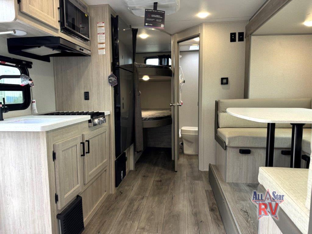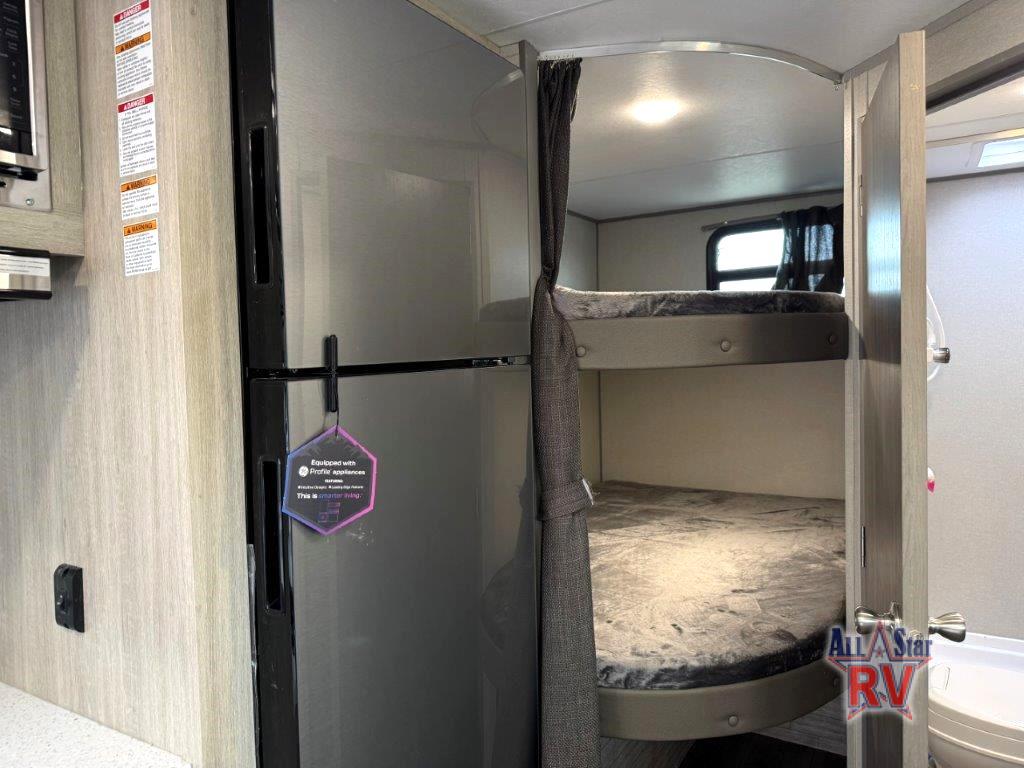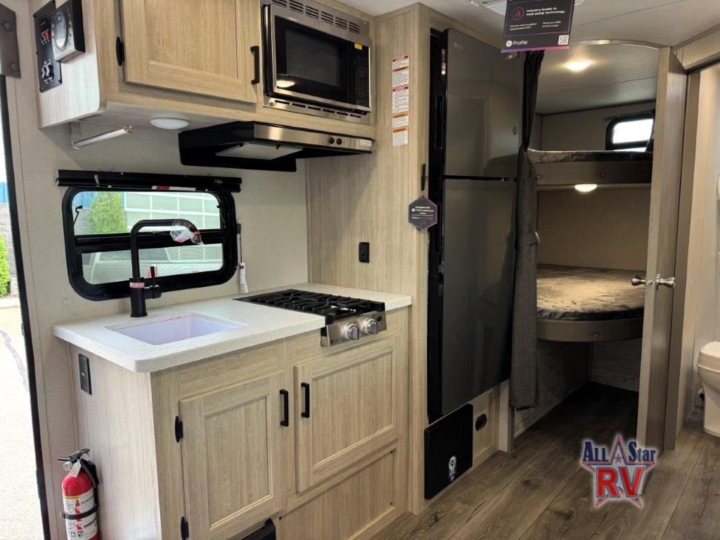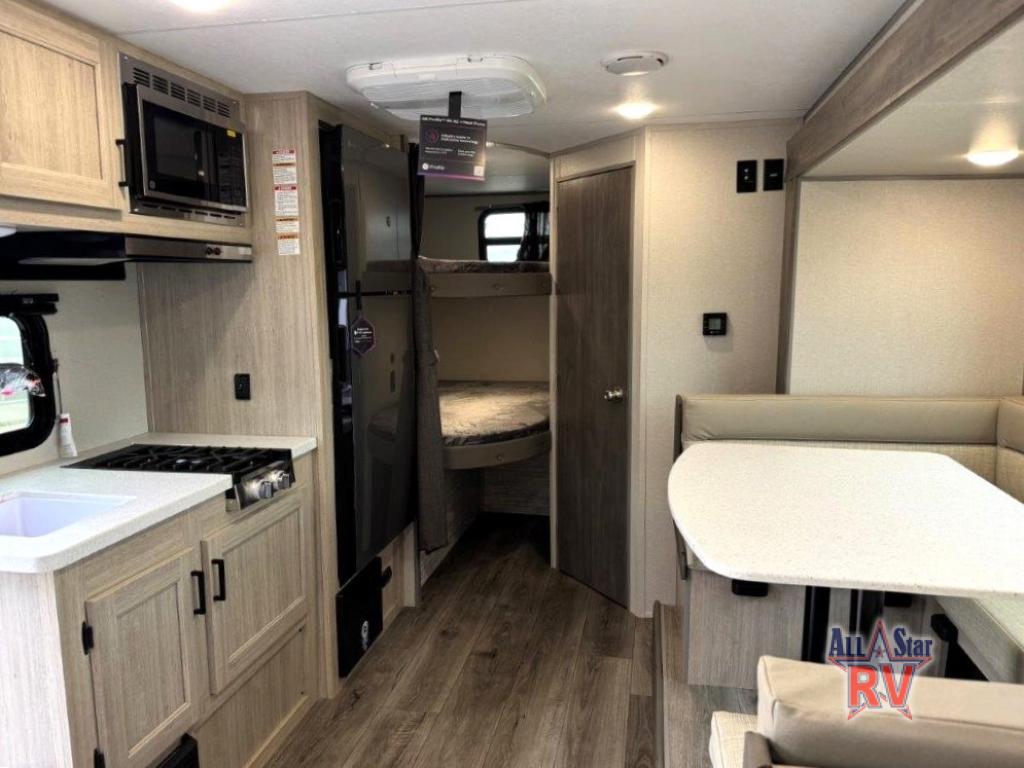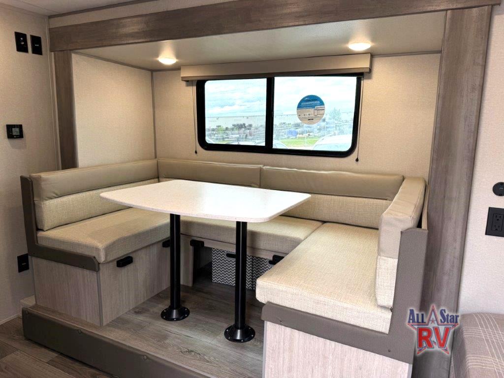 This spacious travel trailer can sleep eight campers each night thanks to the double-size bunks in the back, the U-shaped dinette within the slide out, and the queen bed up front! You can easily make meals for your crew with the two burner cooktop and microwave oven, and leftovers can go in the 10.7 cu. ft. 12V refrigerator! After you've cleaned up in the full bath, head outdoors to relax under the 15' power awning with multicolor LED lights and a remote!
