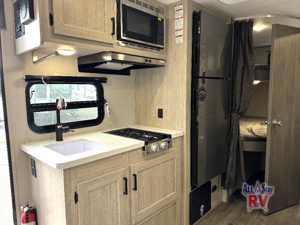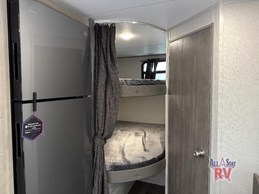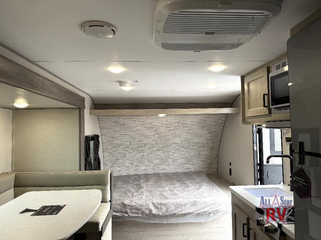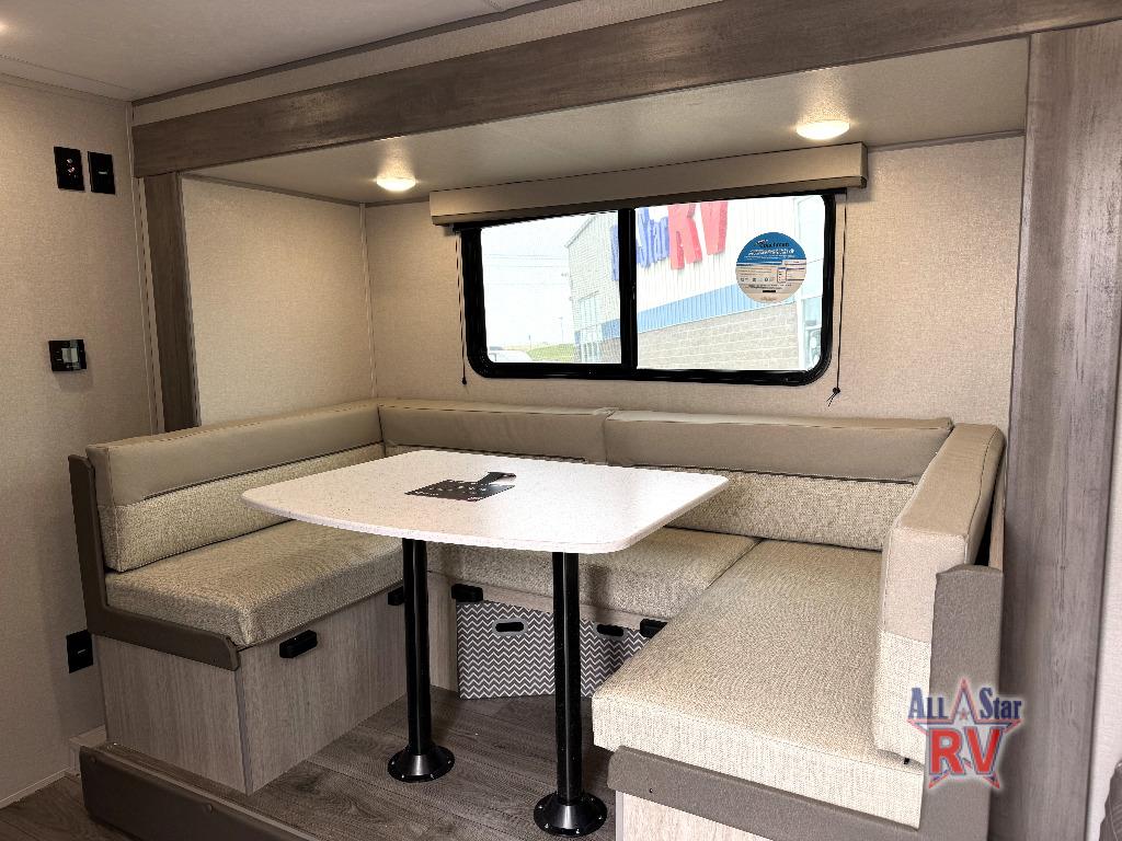 This spacious travel trailer can sleep eight campers each night thanks to the double-size bunks in the back, the U-shaped dinette within the slide out, and the queen bed up front! You can easily make meals for your crew with the two burner cooktop and microwave oven, and leftovers can go in the 10.7 cu. ft. 12V refrigerator! After you've cleaned up in the full bath, head outdoors to relax under the 15' power awning with multicolor LED lights and a remote!