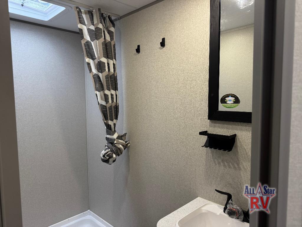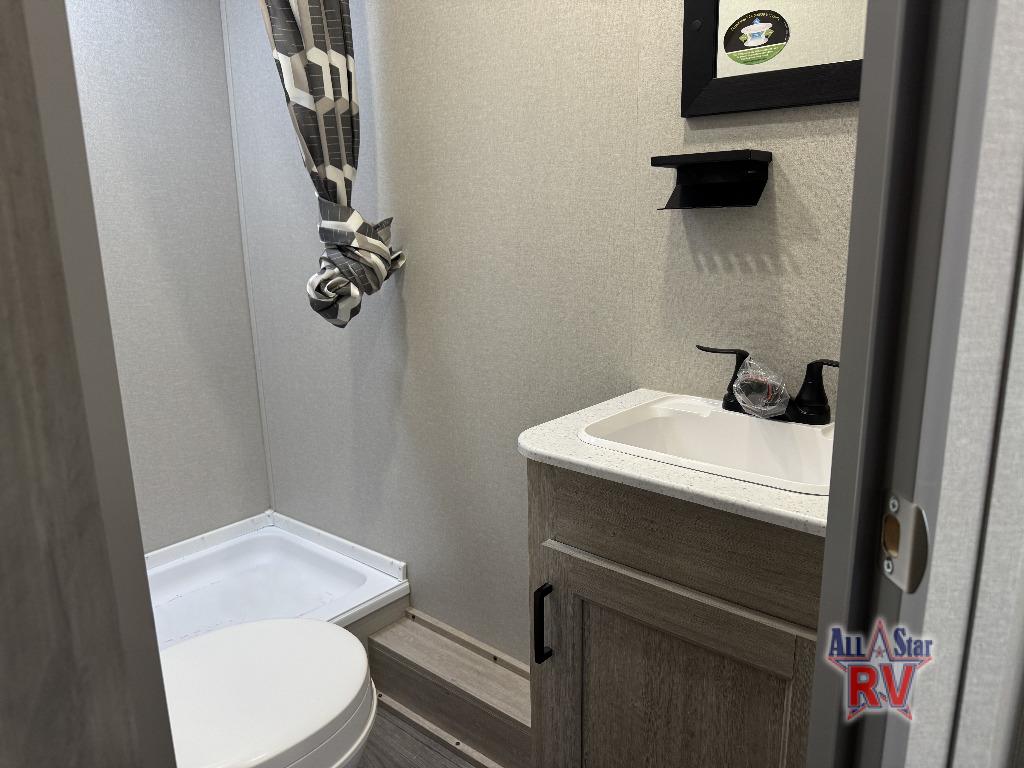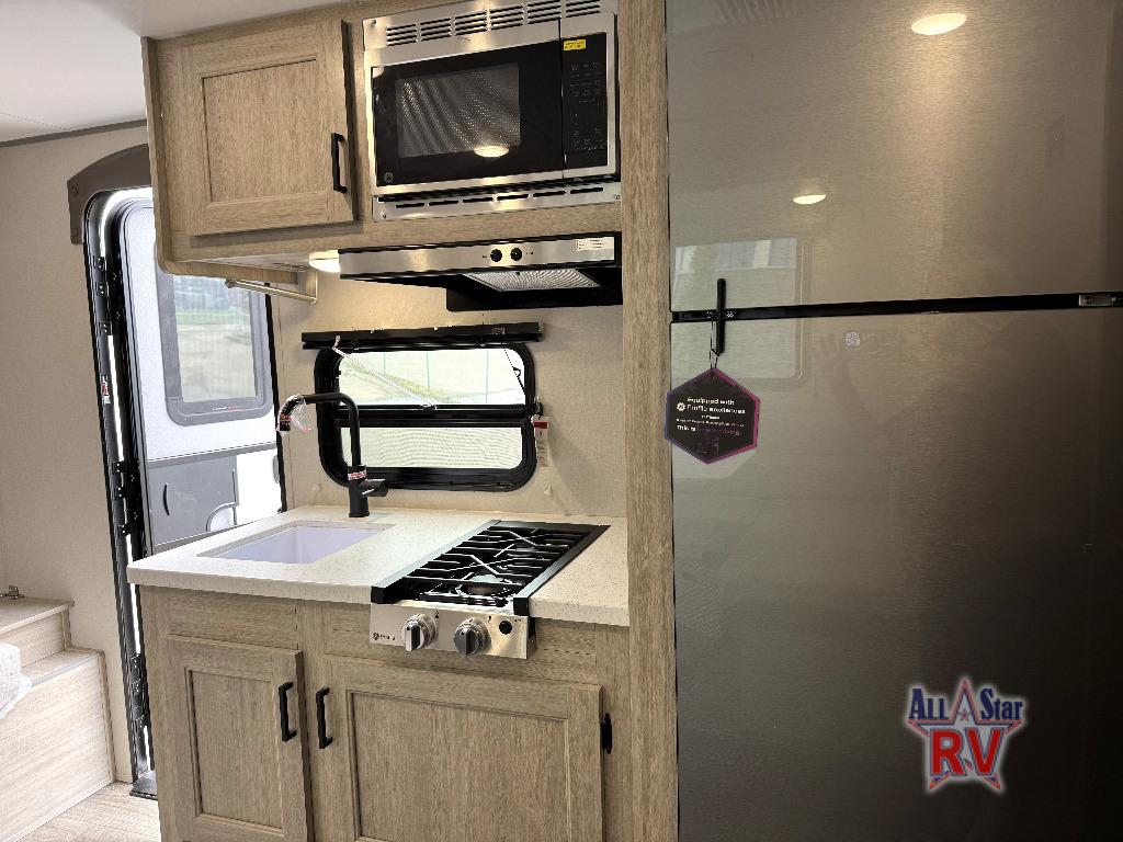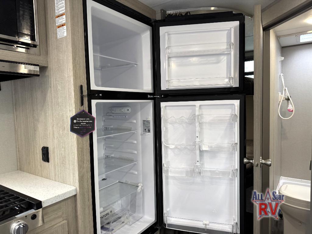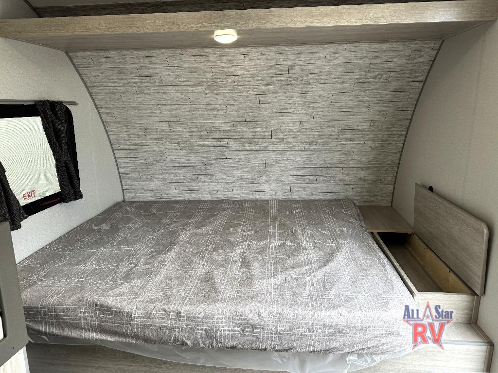 This spacious travel trailer can sleep eight campers each night thanks to the double-size bunks in the back, the U-shaped dinette within the slide out, and the queen bed up front! You can easily make meals for your crew with the two burner cooktop and microwave oven, and leftovers can go in the 10.7 cu. ft. 12V refrigerator! After you've cleaned up in the full bath, head outdoors to relax under the 15' power awning with multicolor LED lights and a remote!