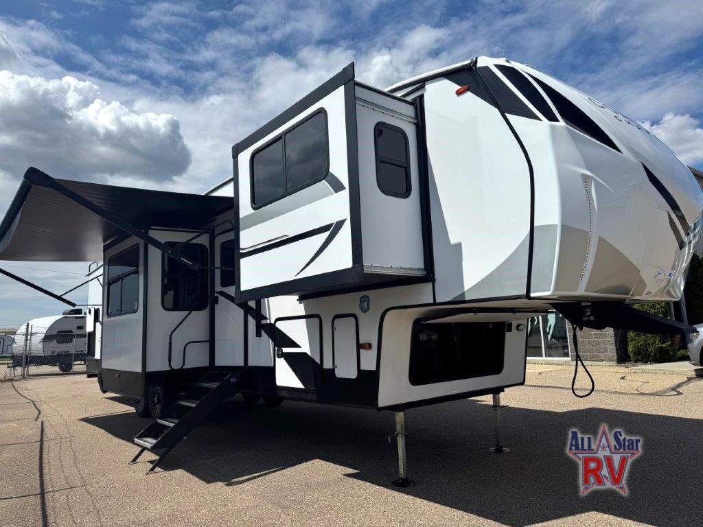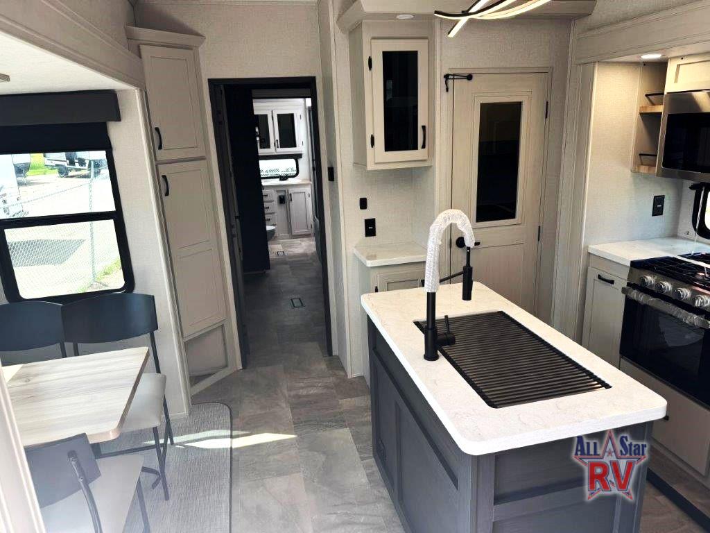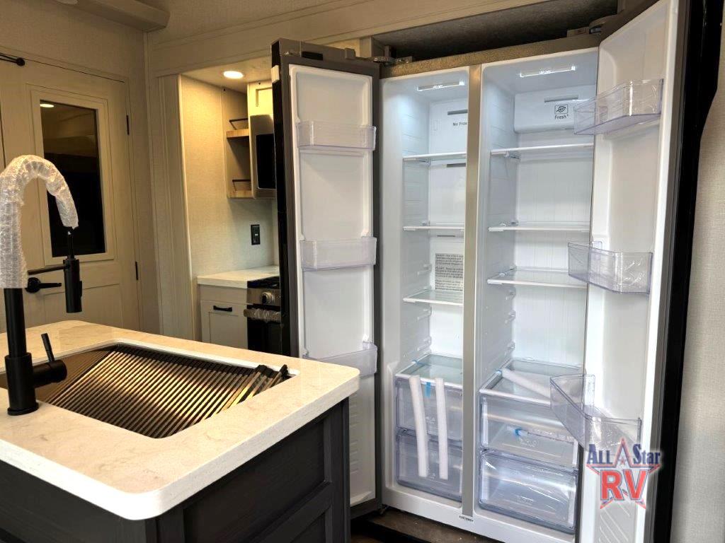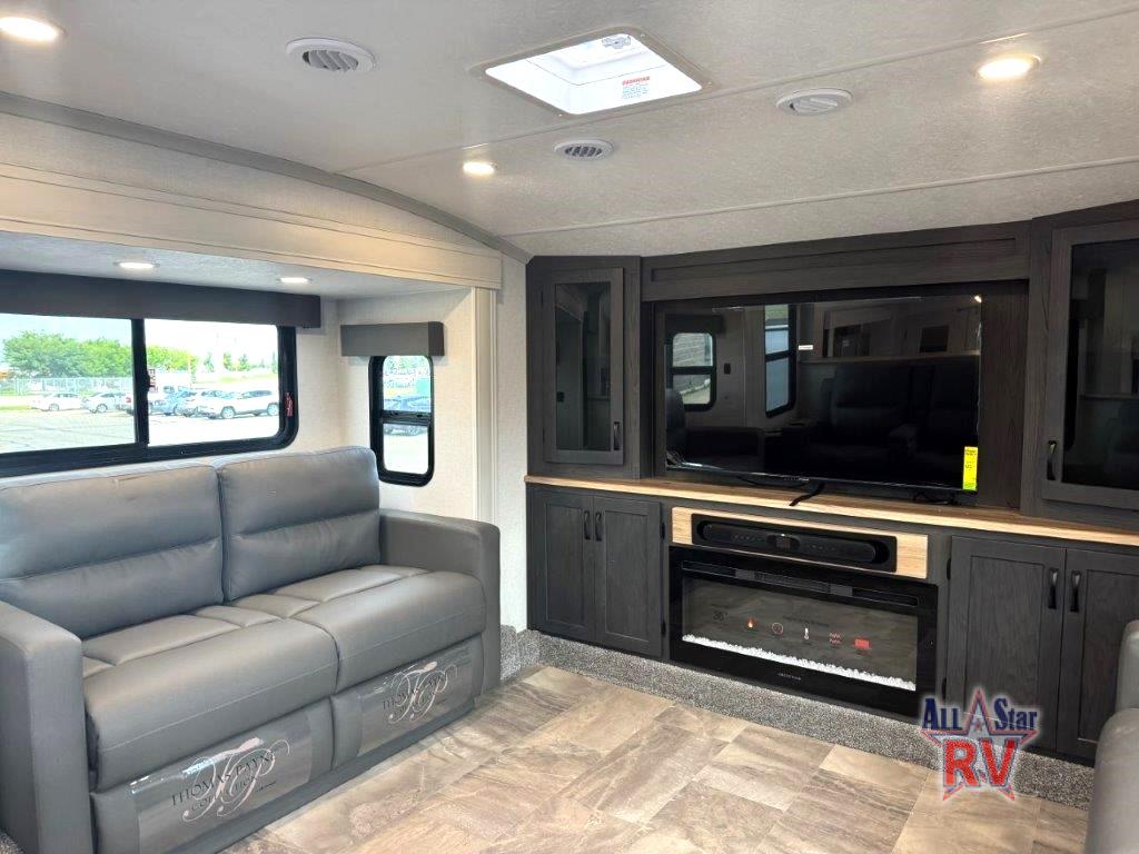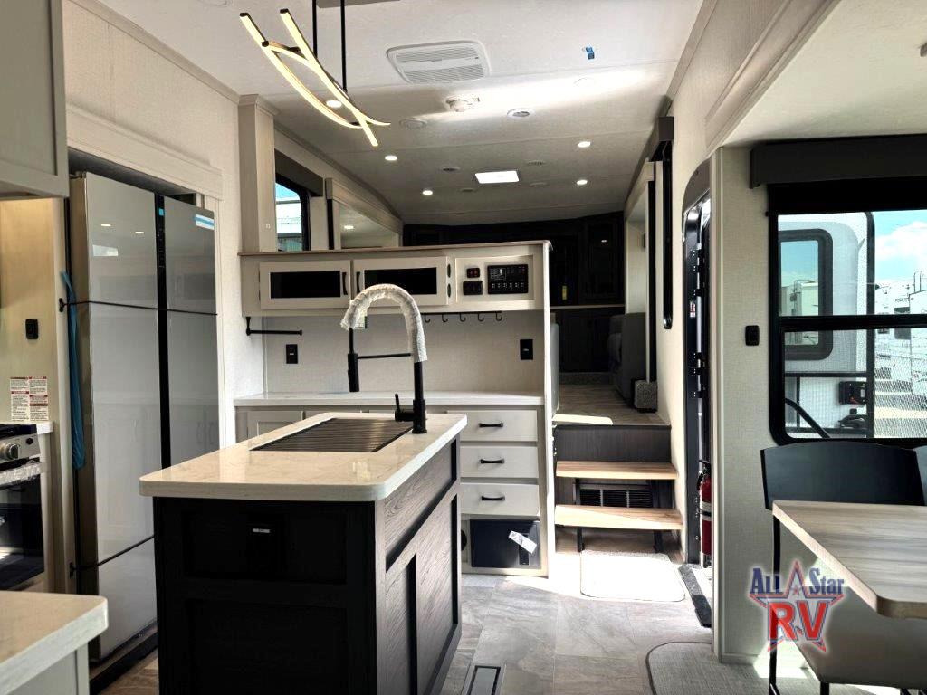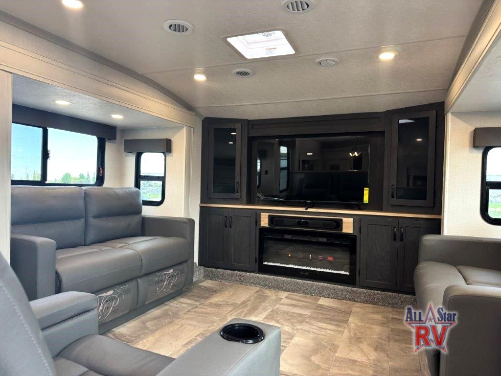 Camping or full-timing in this spacious fifth wheel will make the whole family happy. Your crew will love to visit in the front living area that included two tri-fold hide-a-bed sofas, theatre seating with a side table, plus an entertainment center for a 50" 4K Smart LED TV. The kitchen is any chef's dream with its kitchen island, large pantry, plus a hutch to store nice dishes, and stainless steel appliances. And the free-spanning table will allow you to dine just like you do at home. Head to the master suite to find a king bed slide out, two dressers, plus a full rear bath with dual bath sinks!