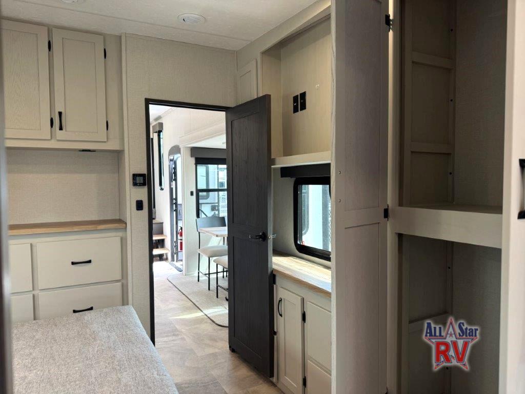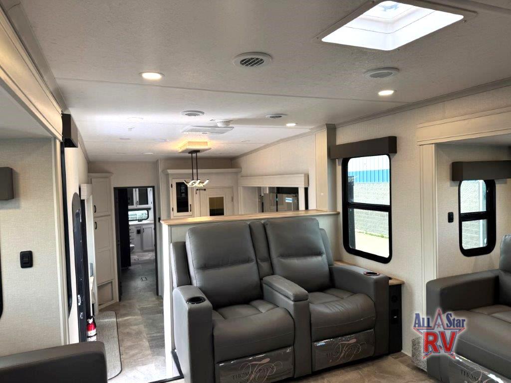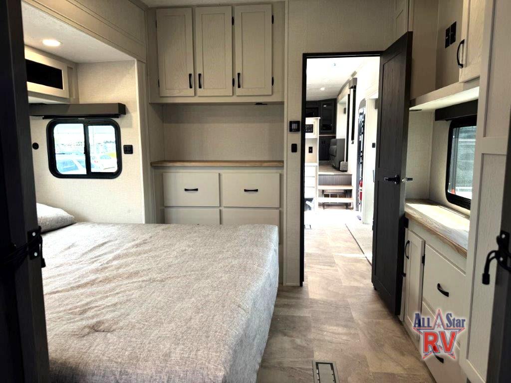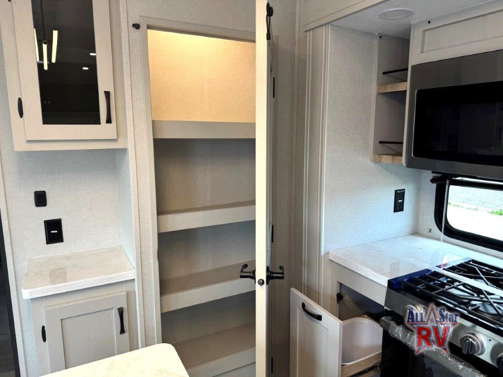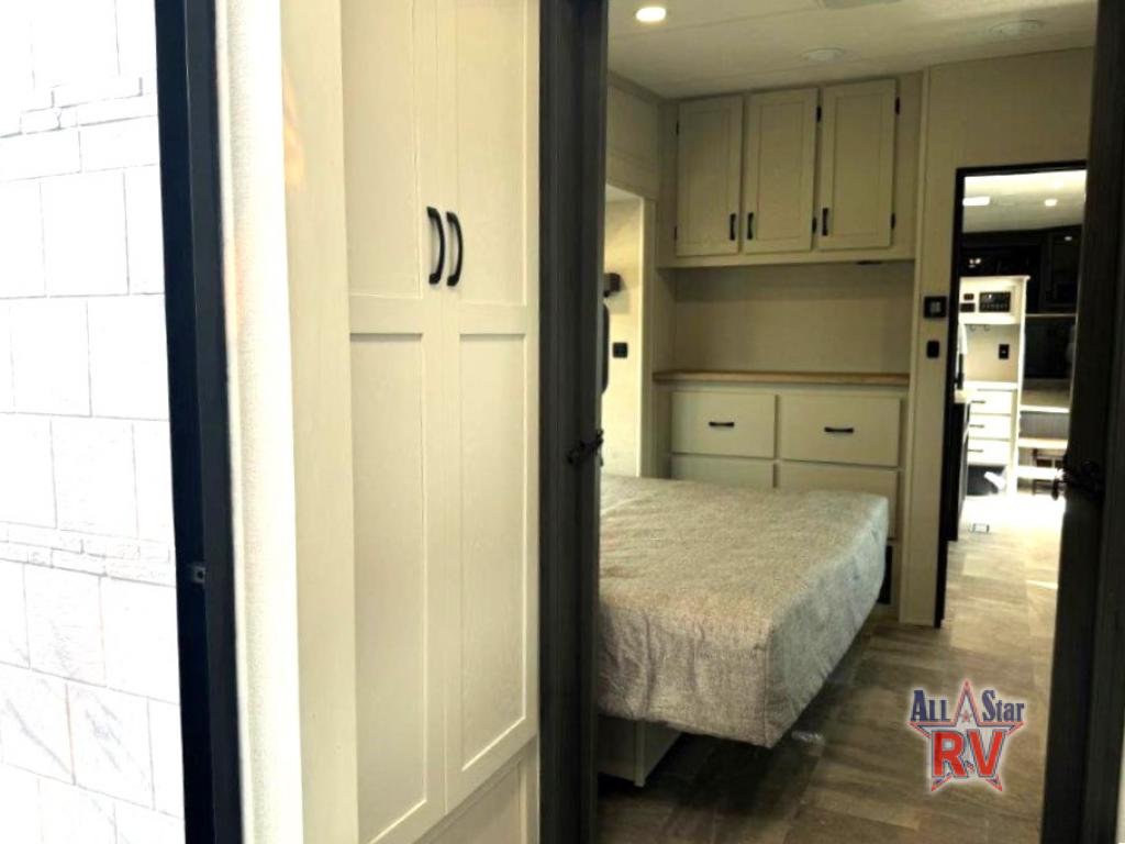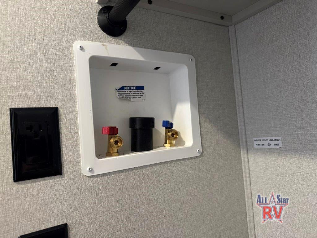 Camping or full-timing in this spacious fifth wheel will make the whole family happy. Your crew will love to visit in the front living area that included two tri-fold hide-a-bed sofas, theatre seating with a side table, plus an entertainment center for a 50" 4K Smart LED TV. The kitchen is any chef's dream with its kitchen island, large pantry, plus a hutch to store nice dishes, and stainless steel appliances. And the free-spanning table will allow you to dine just like you do at home. Head to the master suite to find a king bed slide out, two dressers, plus a full rear bath with dual bath sinks!