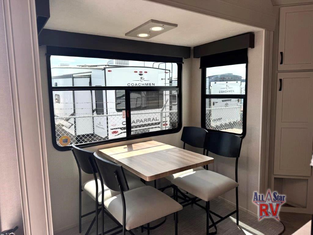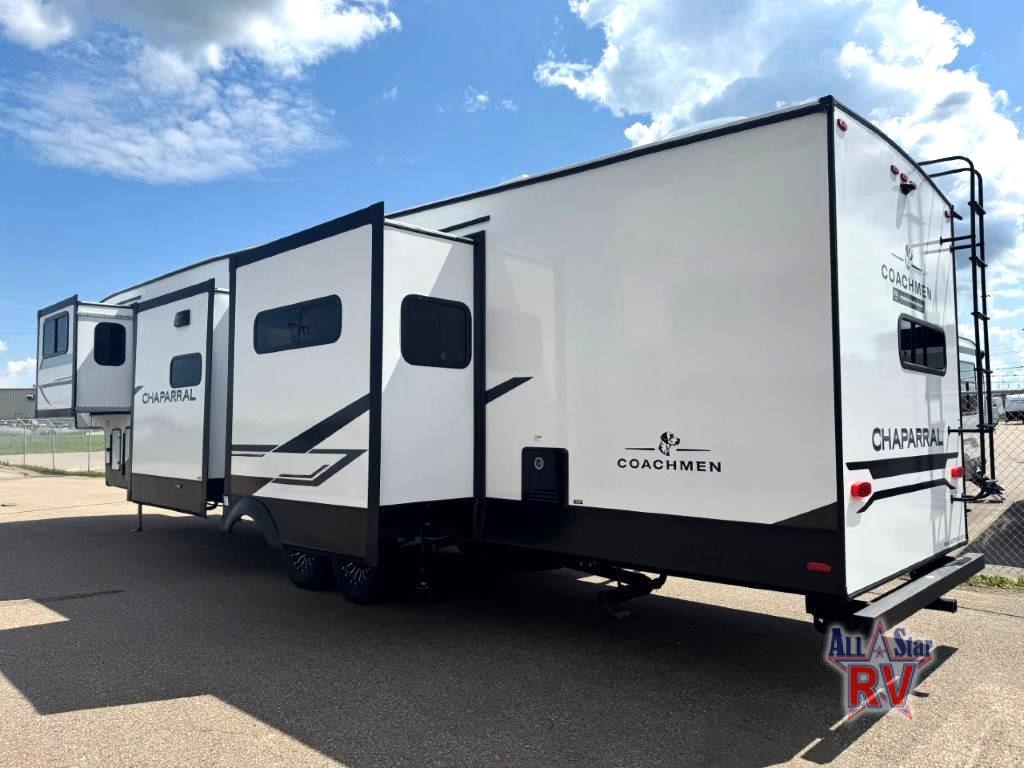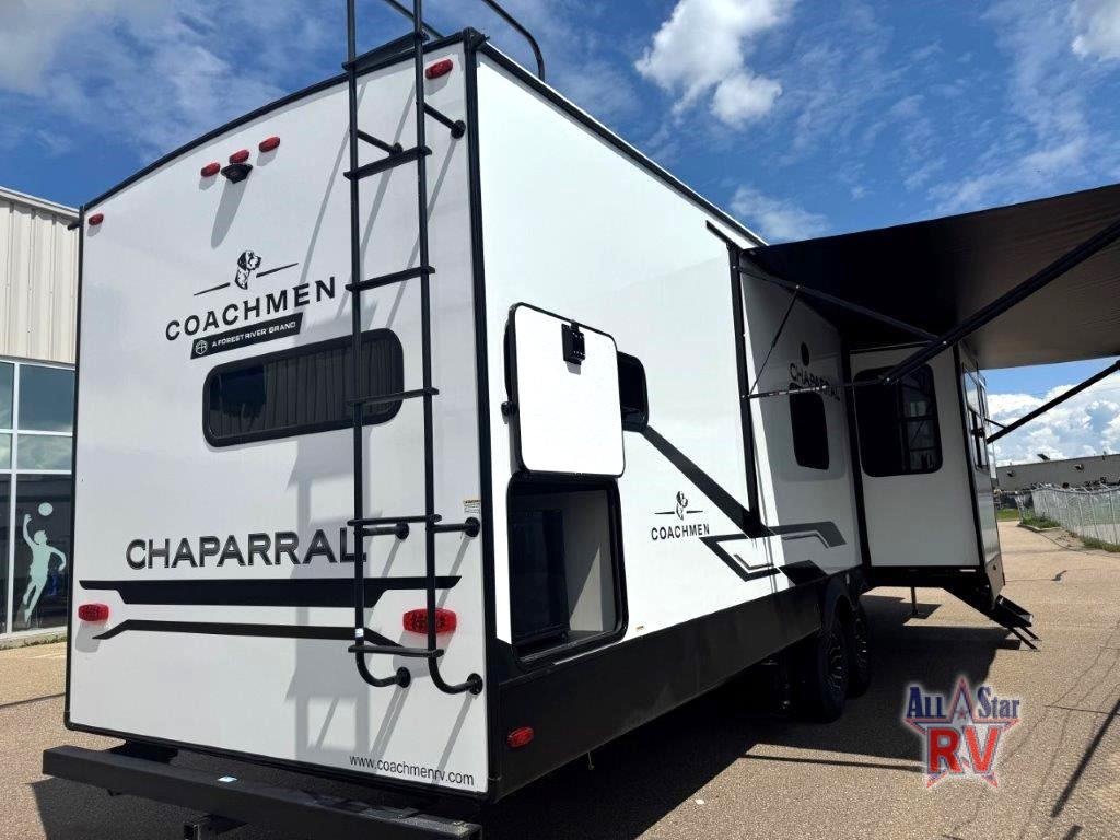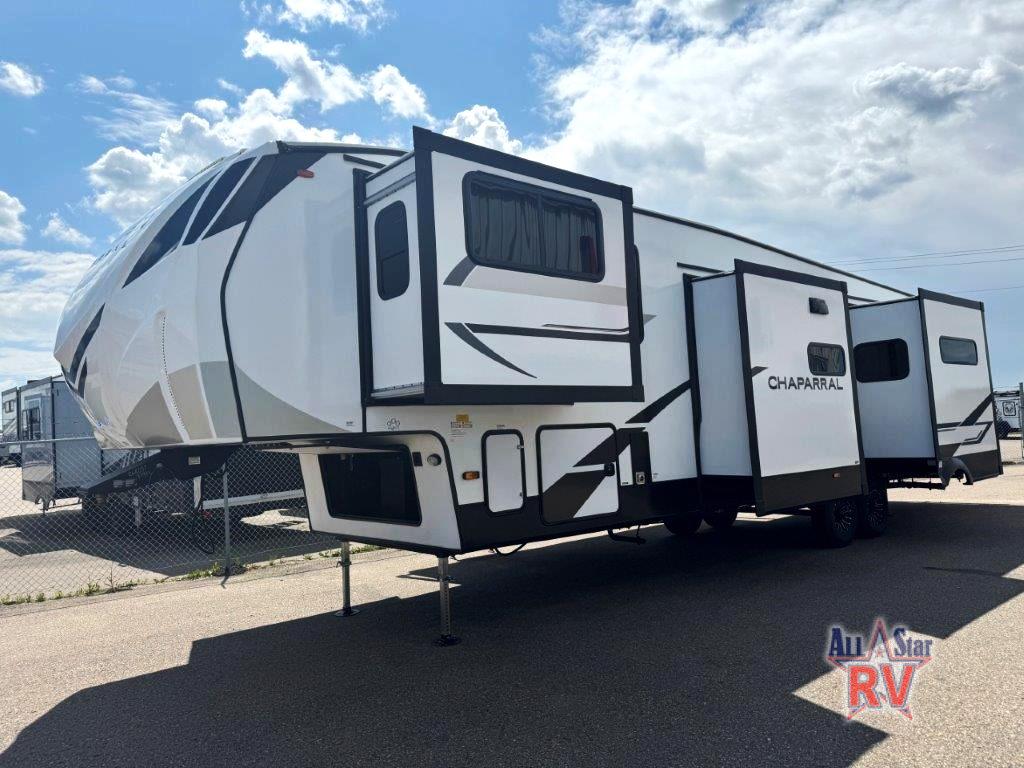 Each Chaparral mid-profile fifth wheel by Coachmen is designed with residential features, loads of storage space, and roomy bedroom suites to make you feel right at home. The durable construction means you can enjoy your RV for years to come. There's 6X double Azdel aluminum cage sidewall system, Weather Shield+ technology, and Tri-Tex powder coated frame technology that will help extend your camping season. Each model includes a Winegard Air 360+ HDTV/radio dome antenna to help keep you connected as you camp, slow rise blackout roller night shades, a new 16 cu. ft. side-by-side stainless glass 12V refrigerator, and a modern electric fireplace to make your space cozy. There is also a large transom window in the kitchen, a modern high-rise faucet, LED motion sensor lights in the bathroom, plus a full-size shower with glass doors and a seat. Now that's what I call luxury! Choose a Chaparral fifth wheel today!