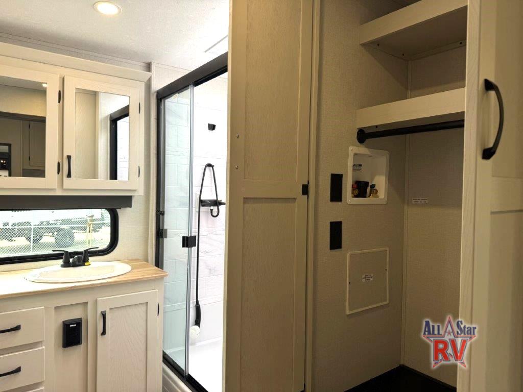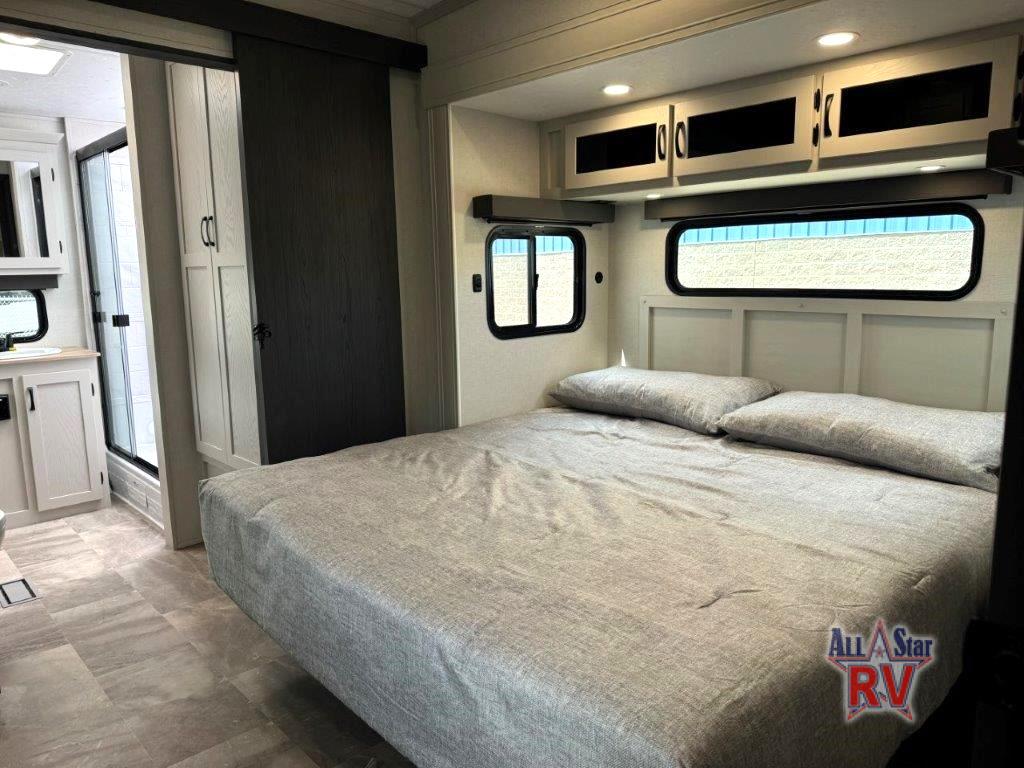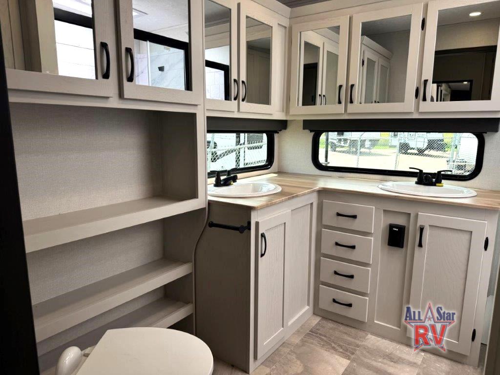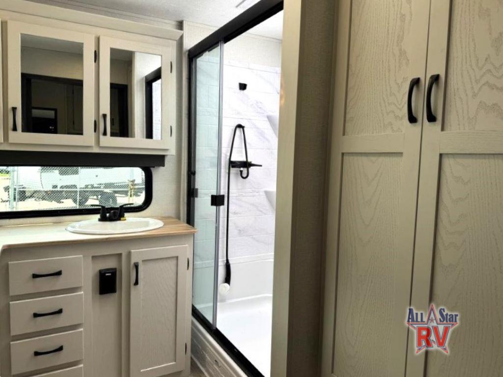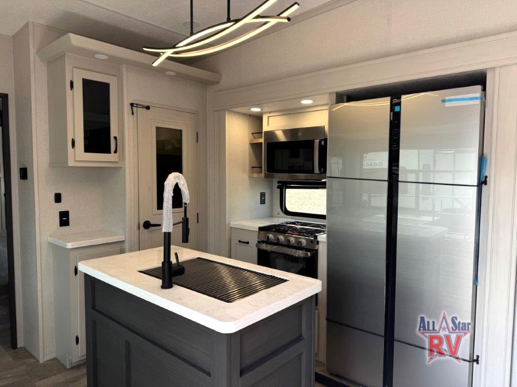 Each Chaparral mid-profile fifth wheel by Coachmen is designed with residential features, loads of storage space, and roomy bedroom suites to make you feel right at home. The durable construction means you can enjoy your RV for years to come. There's 6X double Azdel aluminum cage sidewall system, Weather Shield+ technology, and Tri-Tex powder coated frame technology that will help extend your camping season. Each model includes a Winegard Air 360+ HDTV/radio dome antenna to help keep you connected as you camp, slow rise blackout roller night shades, a new 16 cu. ft. side-by-side stainless glass 12V refrigerator, and a modern electric fireplace to make your space cozy. There is also a large transom window in the kitchen, a modern high-rise faucet, LED motion sensor lights in the bathroom, plus a full-size shower with glass doors and a seat. Now that's what I call luxury! Choose a Chaparral fifth wheel today!