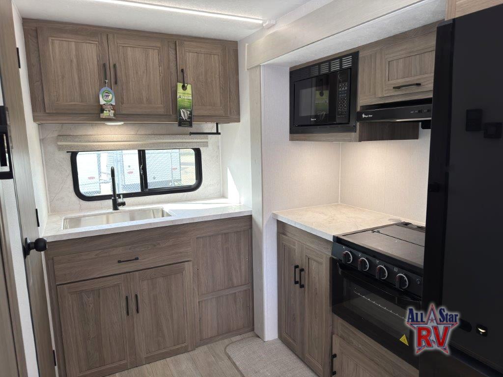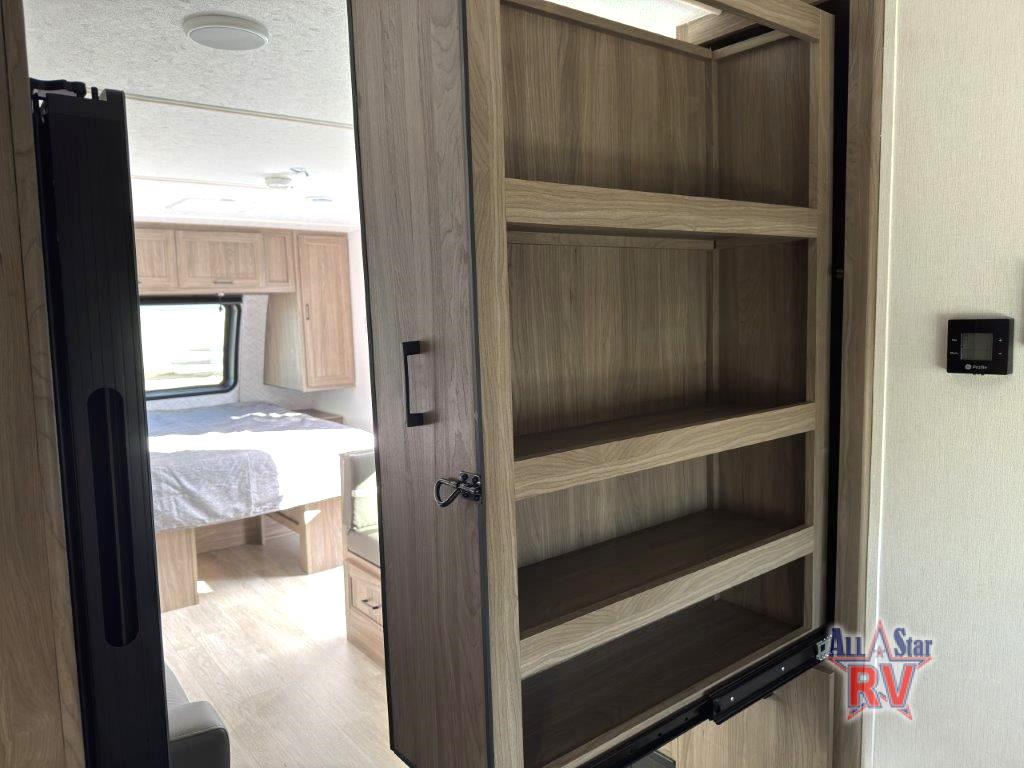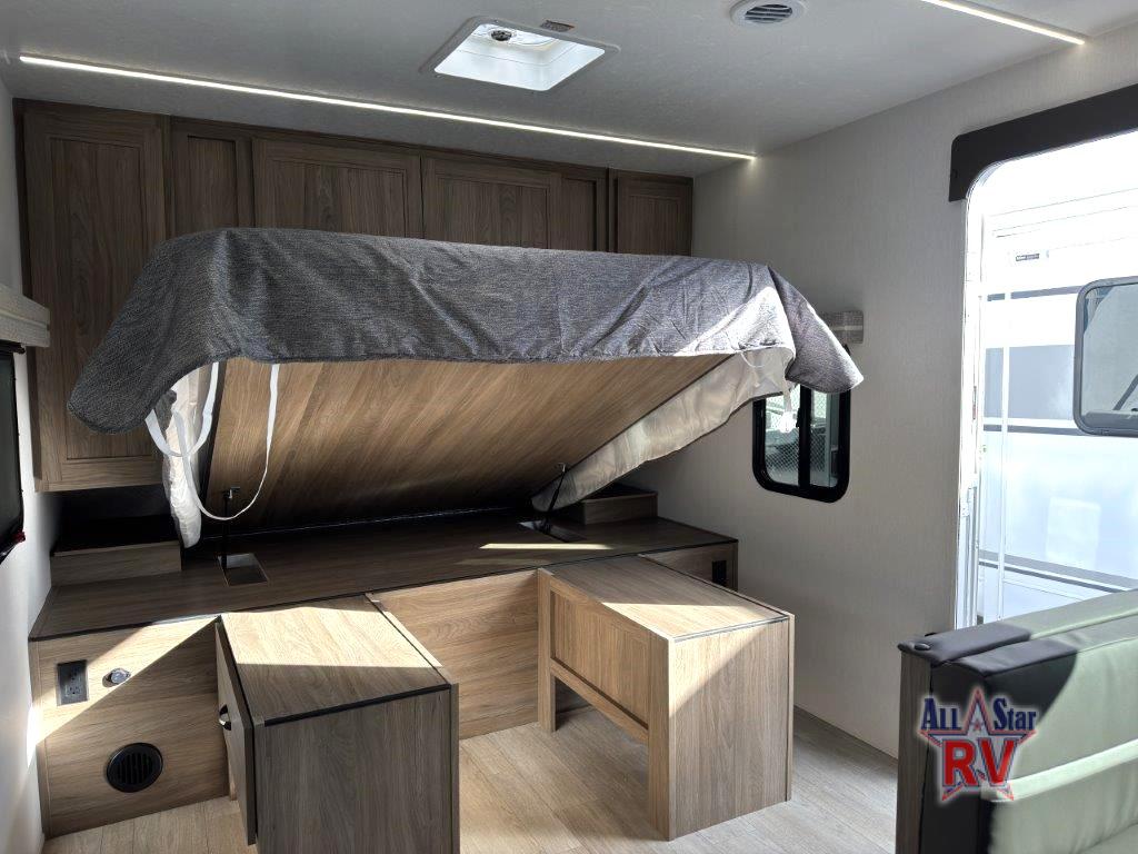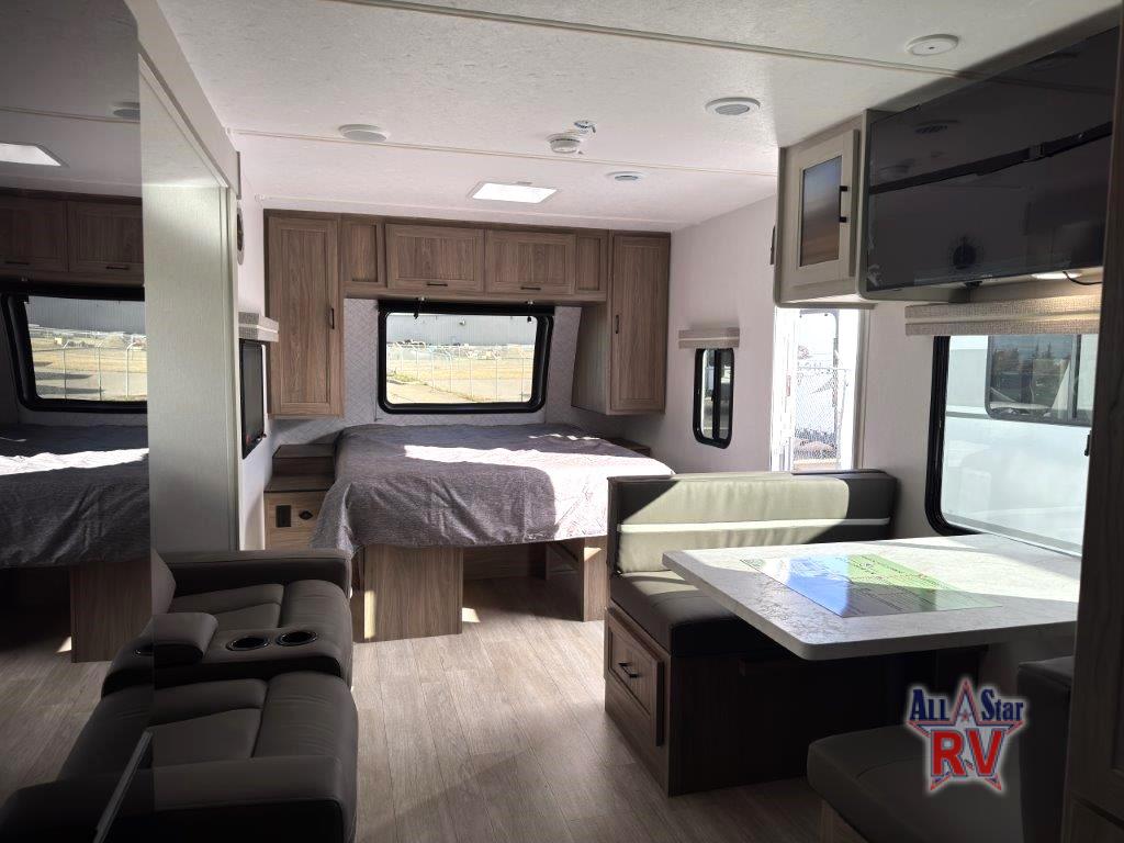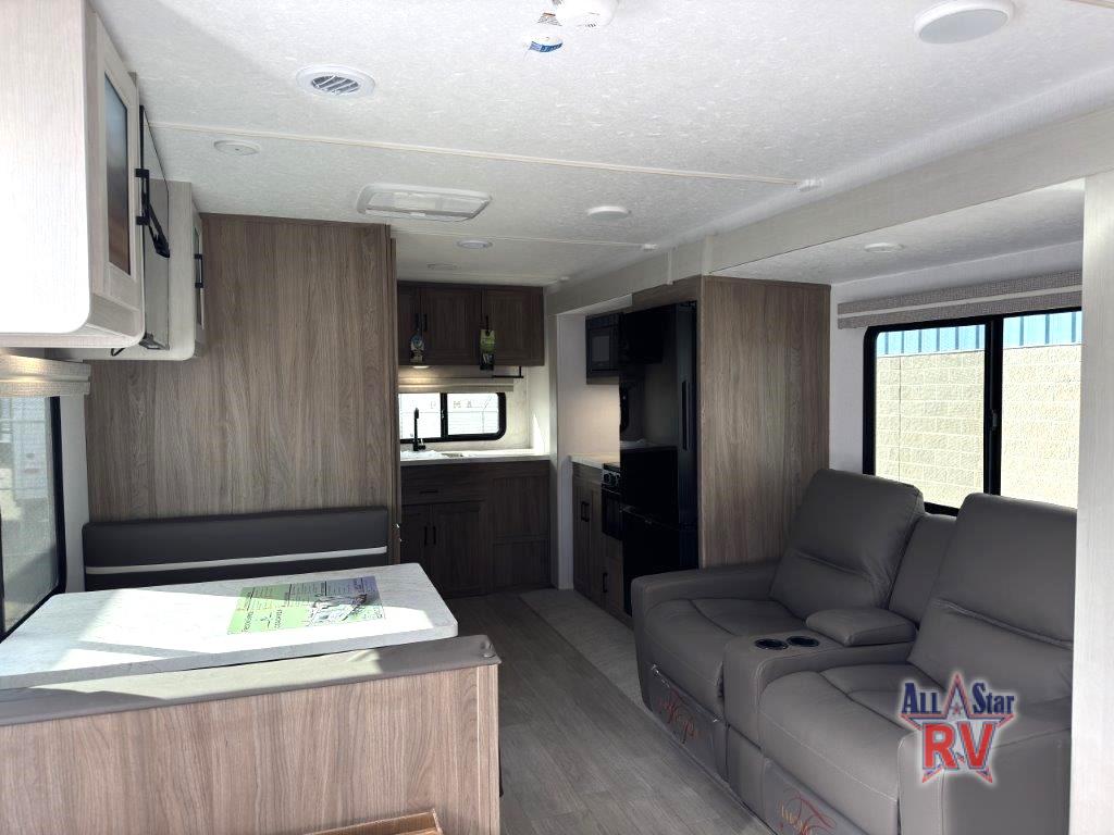 This trailer provides the perfect blend of utility and comfort. You will enjoy your own queen bed up front that includes vaulted under-bed storage for your luggage. Theater seating provides a great spot to watch any show on the smart TV, and you can enjoy meals at the booth dinette. The chef will enjoy the well-equipped kitchen which includes a three burner cooktop, microwave, and stainless steel sink. Additional storage can be found in the overhead consoles plus a pantry/wardrobe closet.