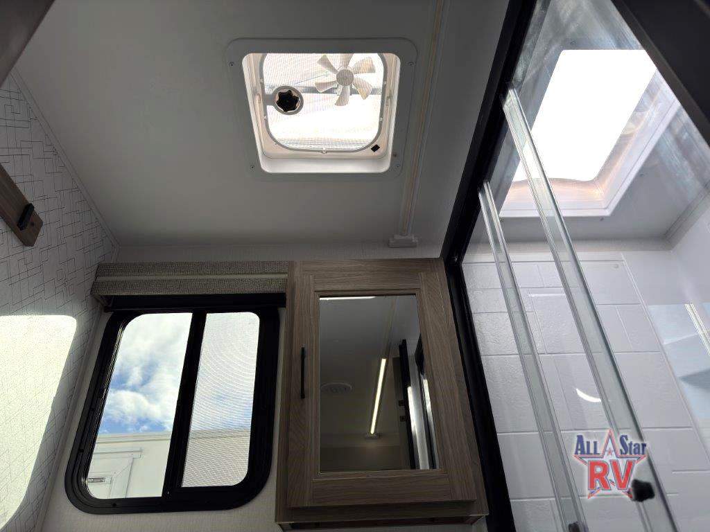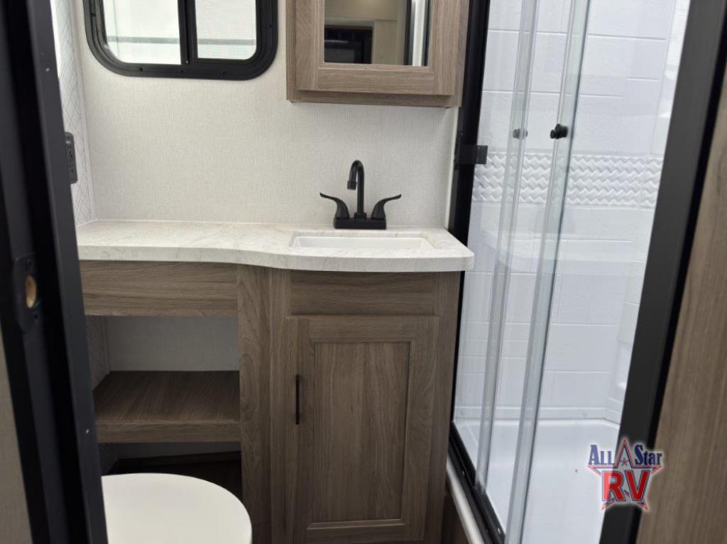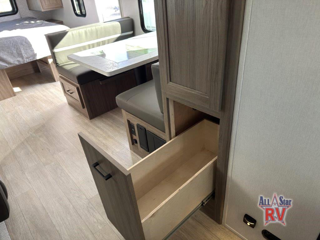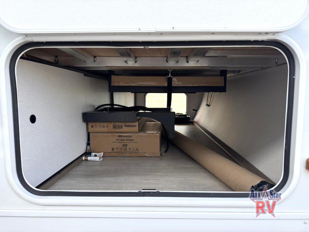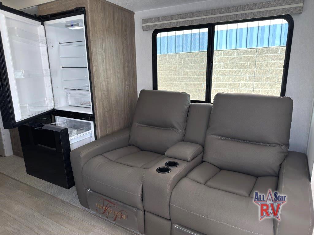 This trailer provides the perfect blend of utility and comfort. You will enjoy your own queen bed up front that includes vaulted under-bed storage for your luggage. Theater seating provides a great spot to watch any show on the smart TV, and you can enjoy meals at the booth dinette. The chef will enjoy the well-equipped kitchen which includes a three burner cooktop, microwave, and stainless steel sink. Additional storage can be found in the overhead consoles plus a pantry/wardrobe closet.