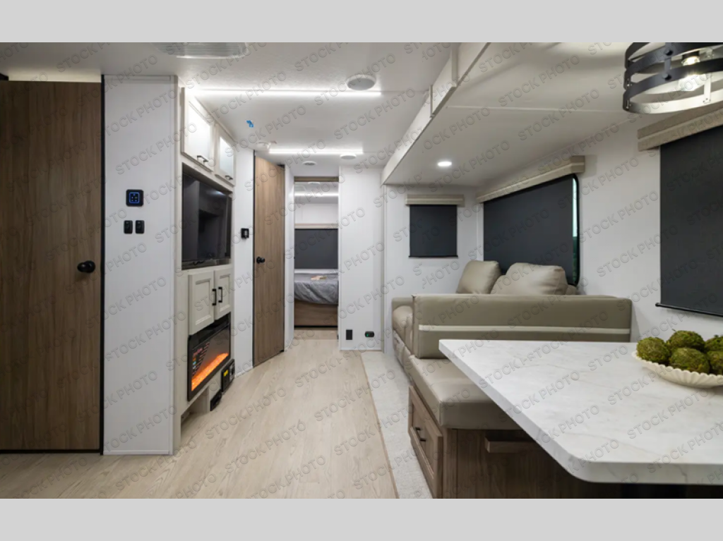 Comfort comes easy in this front kitchen travel trailer for four! You will love the rear master bedroom with its king bed slide out and spacious wardrobe. There is a sofa that sits directly across from the fireplace and entertainment center, or you can choose the optional theater seat or optional hide-a-bed sofa in place of the standard sofa. The front kitchen features tons of counter space, a 10 cu. ft. 12V refrigerator, plus a large pantry for dry good and snacks. There is also a pantry/closet just as you enter the trailer that will be perfect for shoes and jackets!