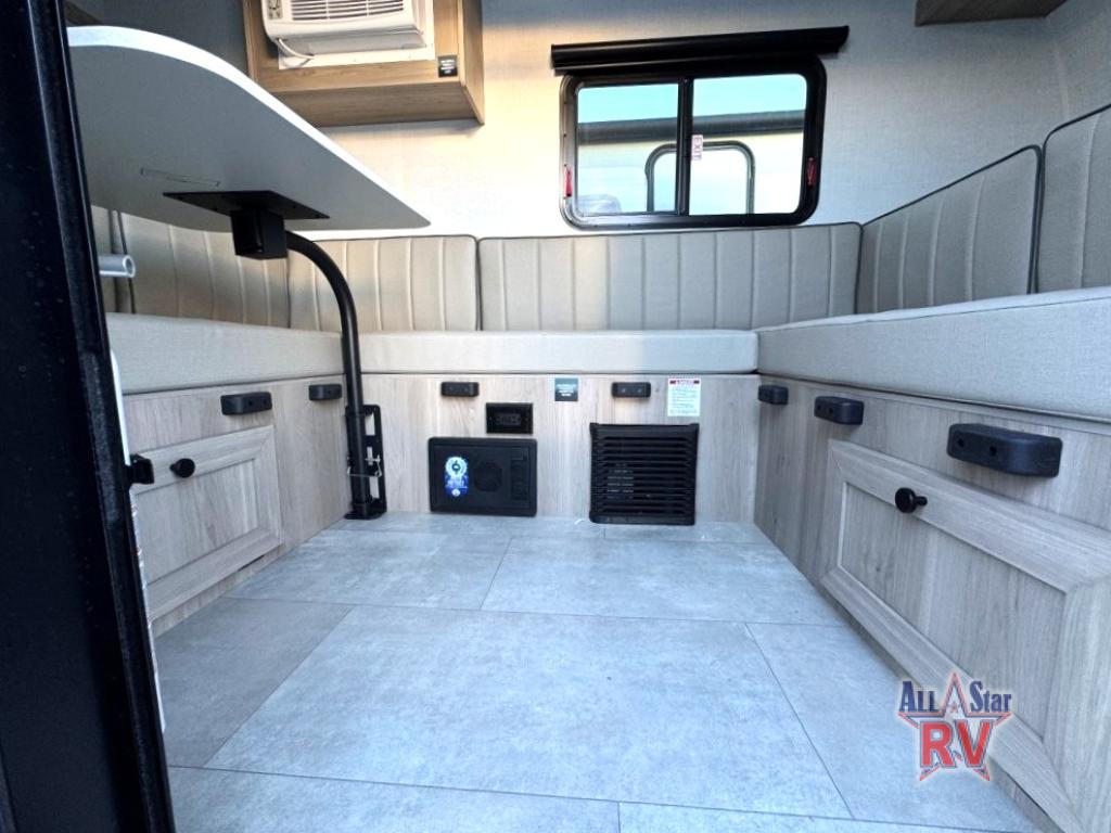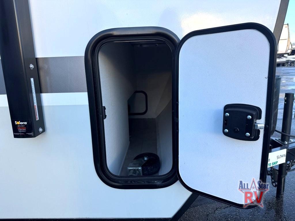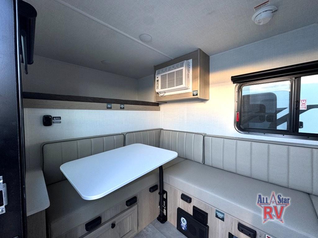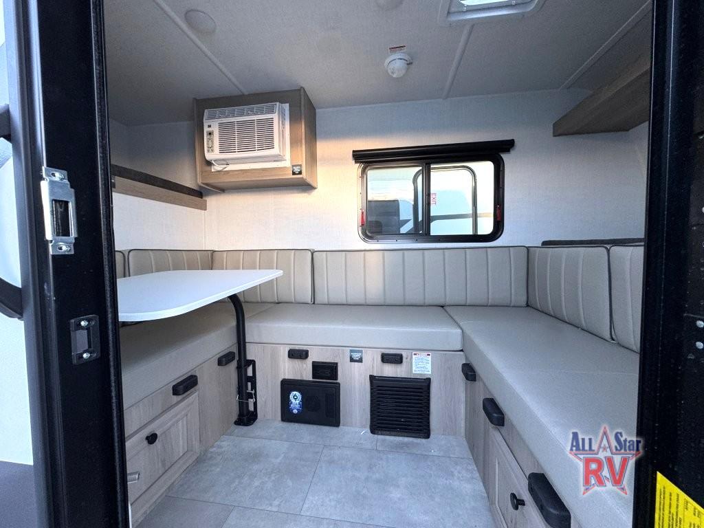 With its practical design, this trailer is designed to make your travels easy and enjoyable. The bunk beds are a fun and practical sleeping solution for kids. Perfect for sleepovers, family gatherings, or outdoor adventures! The U-dinette is a cozy spot for meals and conversation and can convert into two more sleeping spaces. The outside kitchen features a fridge and sink, perfect for alfresco dining and outdoor cooking. The shelf provides ample storage space for outdoor gear, toys, and essentials. Plus, the pass-thru storage allows for easy access to your belongings. The exterior awning creates a comfortable outdoor living space, perfect for relaxing, socializing, or enjoying the great outdoors.