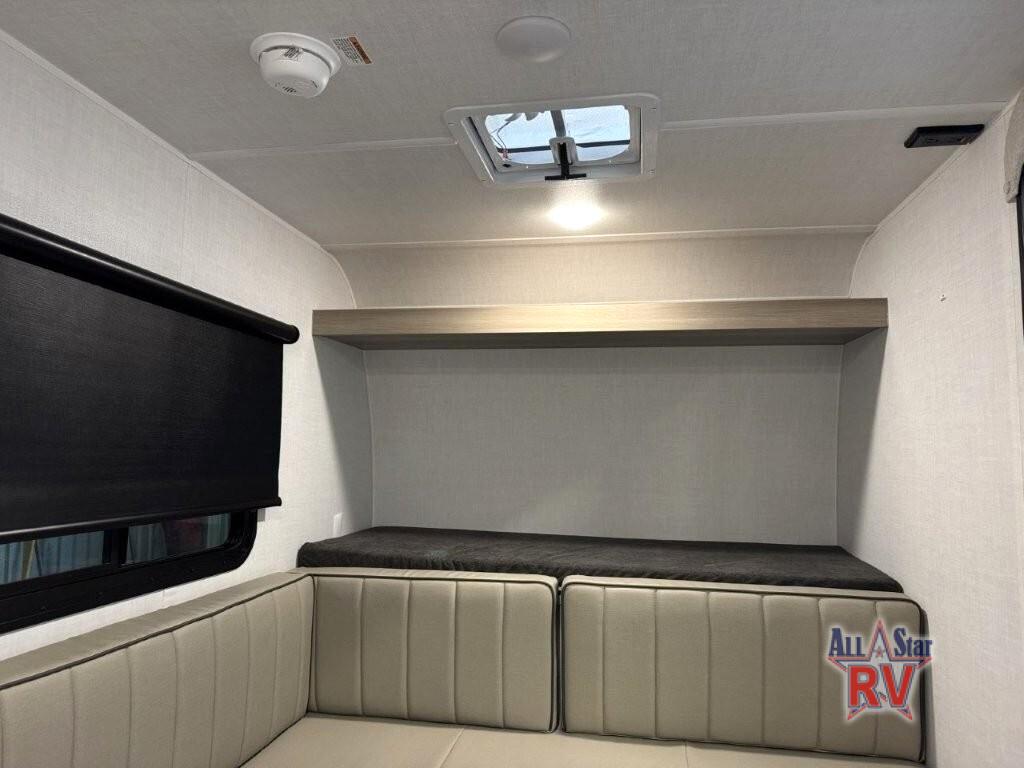 With its practical design, this trailer is designed to make your travels easy and enjoyable. The bunk beds are a fun and practical sleeping solution for kids. Perfect for sleepovers, family gatherings, or outdoor adventures! The U-dinette is a cozy spot for meals and conversation and can convert into two more sleeping spaces. The outside kitchen features a fridge and sink, perfect for alfresco dining and outdoor cooking. The shelf provides ample storage space for outdoor gear, toys, and essentials. Plus, the pass-thru storage allows for easy access to your belongings. The exterior awning creates a comfortable outdoor living space, perfect for relaxing, socializing, or enjoying the great outdoors.