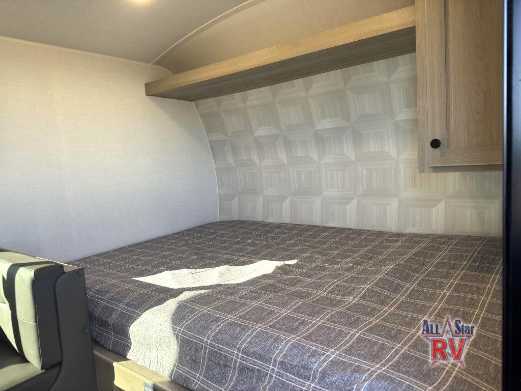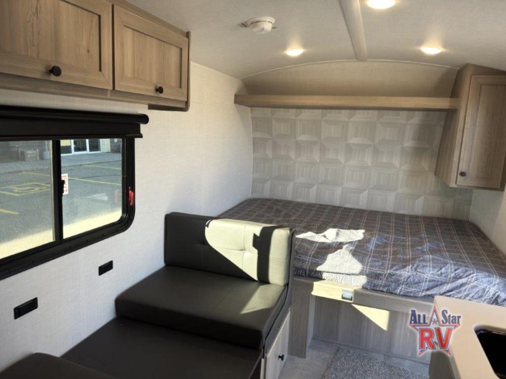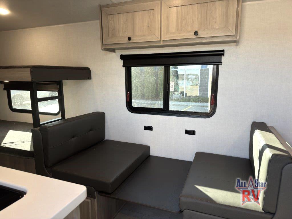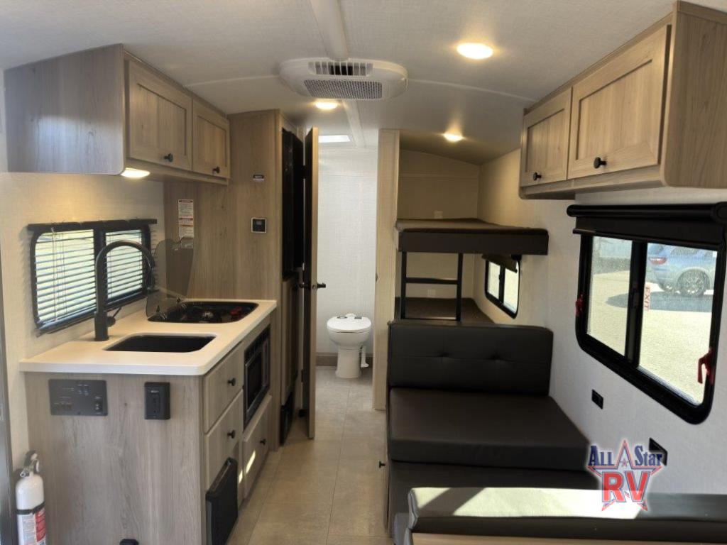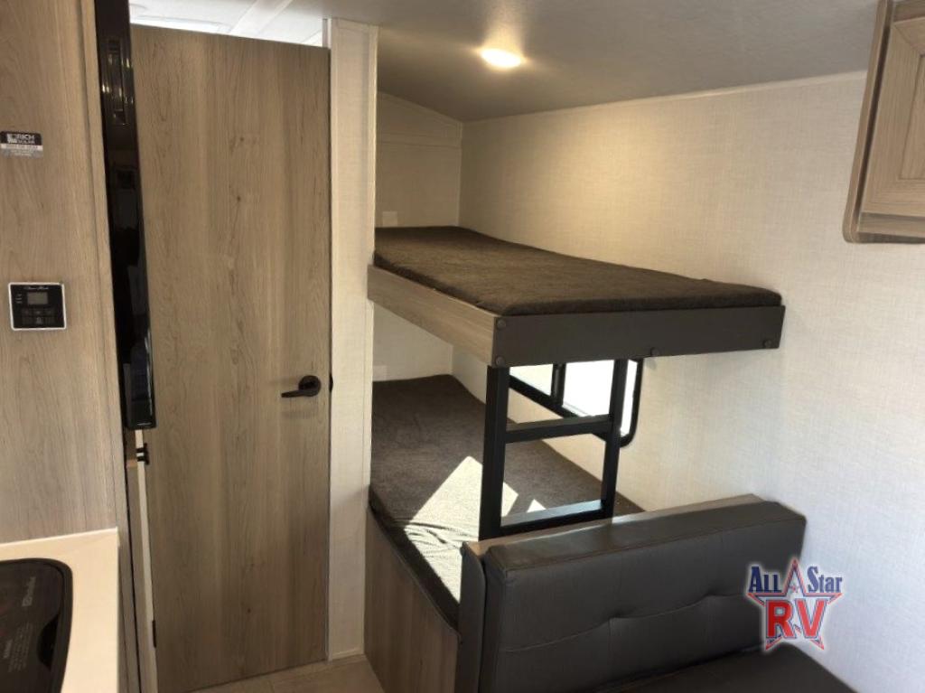 This charming travel trailer is perfect for families or small groups. The front bedroom features a full bed, perfect for a restful night's sleep. Ample storage space ensures you stay organized and clutter-free. The booth dinette is a cozy spot for meals and conversation, while the kitchen area is equipped with a microwave, fridge, and overhead cabinets. Prepare delicious meals and snacks with ease. The bunk beds provide a fun and practical sleeping solution for kids or additional guests. Perfect for sleepovers or family gatherings! The full bathroom is a convenient and refreshing space, with all the essentials for a comfortable stay.