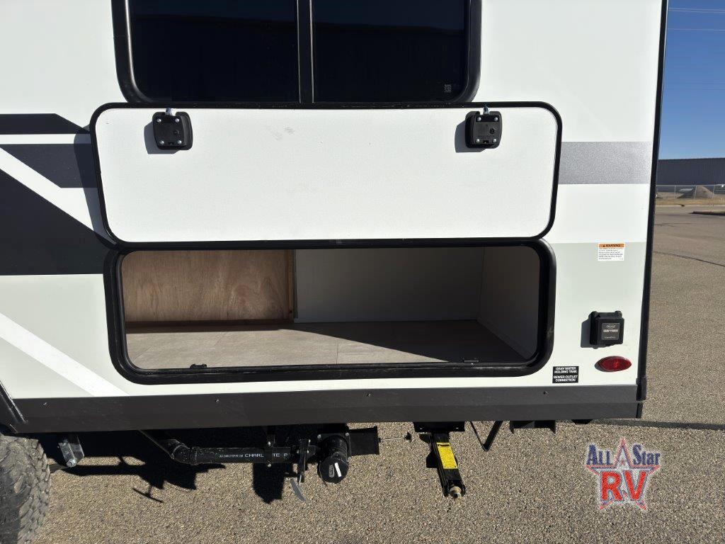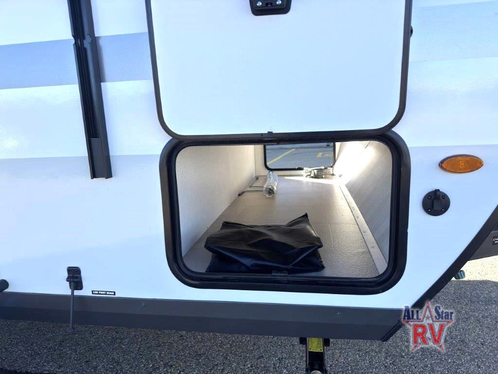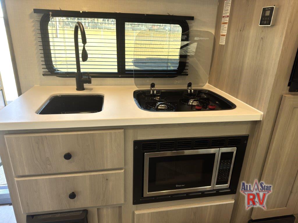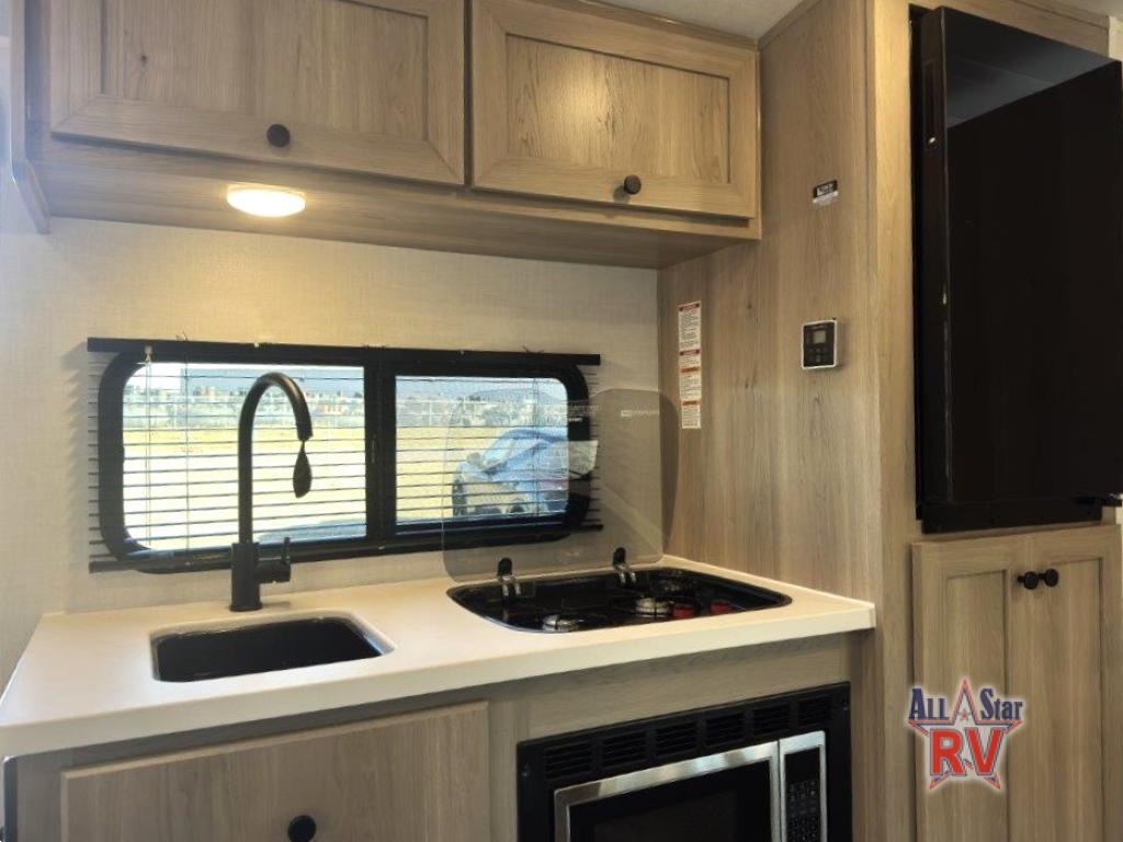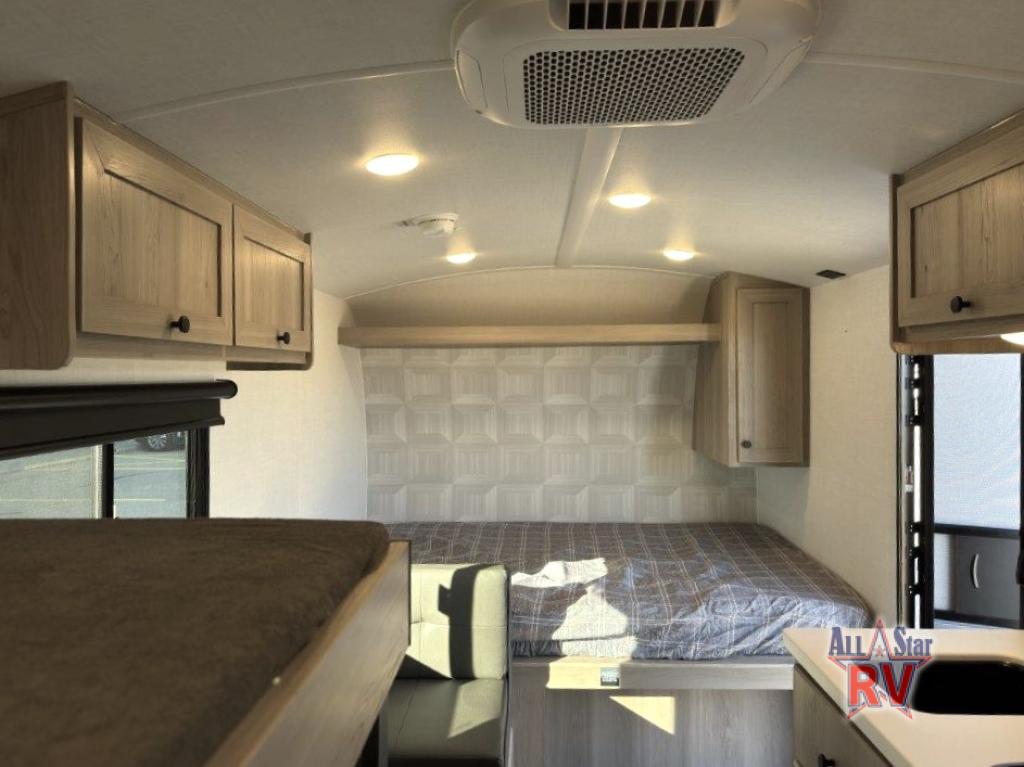 This charming travel trailer is perfect for families or small groups. The front bedroom features a full bed, perfect for a restful night's sleep. Ample storage space ensures you stay organized and clutter-free. The booth dinette is a cozy spot for meals and conversation, while the kitchen area is equipped with a microwave, fridge, and overhead cabinets. Prepare delicious meals and snacks with ease. The bunk beds provide a fun and practical sleeping solution for kids or additional guests. Perfect for sleepovers or family gatherings! The full bathroom is a convenient and refreshing space, with all the essentials for a comfortable stay.