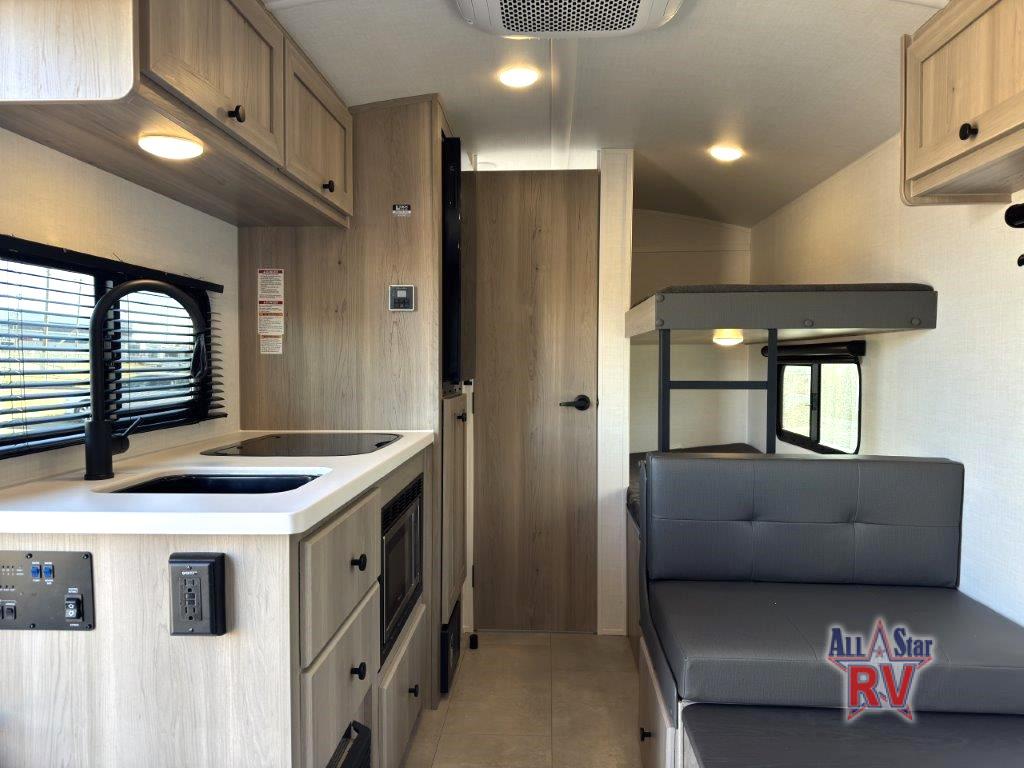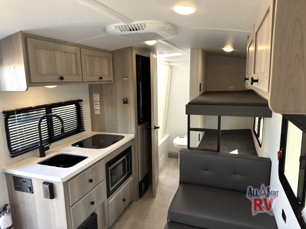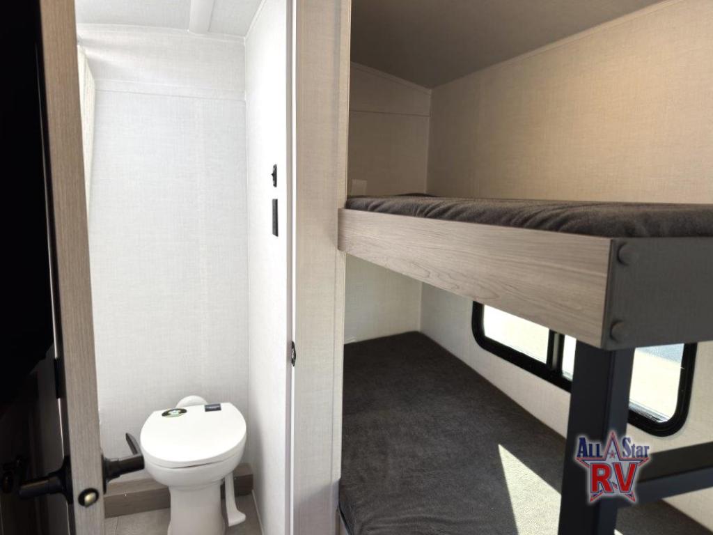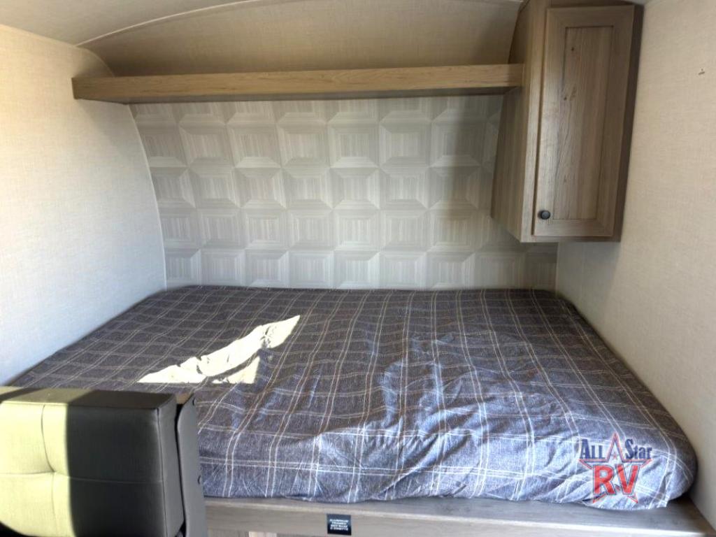 This charming travel trailer is perfect for families or small groups. The front bedroom features a full bed, perfect for a restful night's sleep. Ample storage space ensures you stay organized and clutter-free. The booth dinette is a cozy spot for meals and conversation, while the kitchen area is equipped with a microwave, fridge, and overhead cabinets. Prepare delicious meals and snacks with ease. The bunk beds provide a fun and practical sleeping solution for kids or additional guests. Perfect for sleepovers or family gatherings! The full bathroom is a convenient and refreshing space, with all the essentials for a comfortable stay.