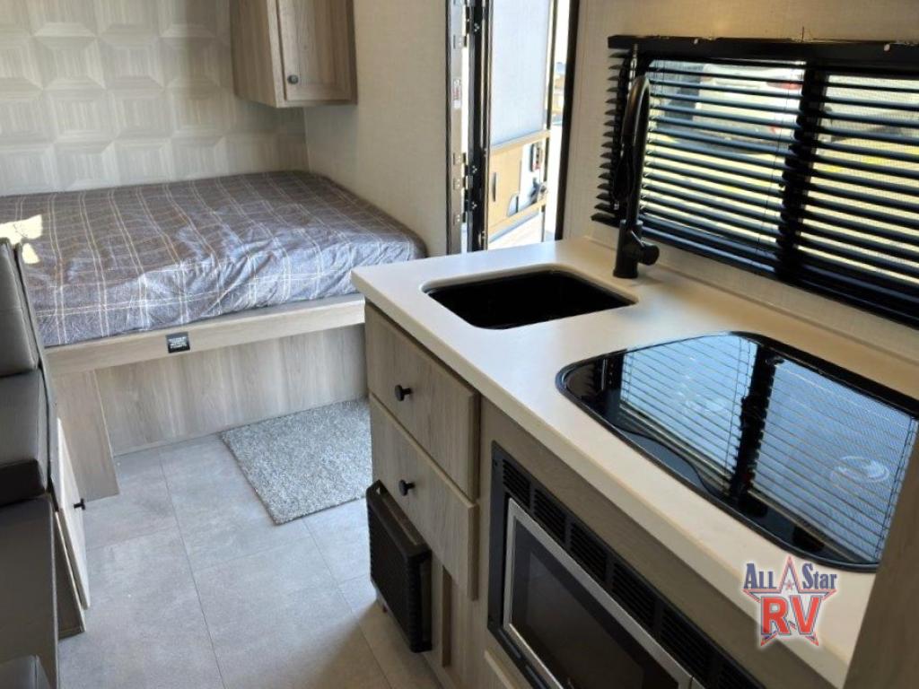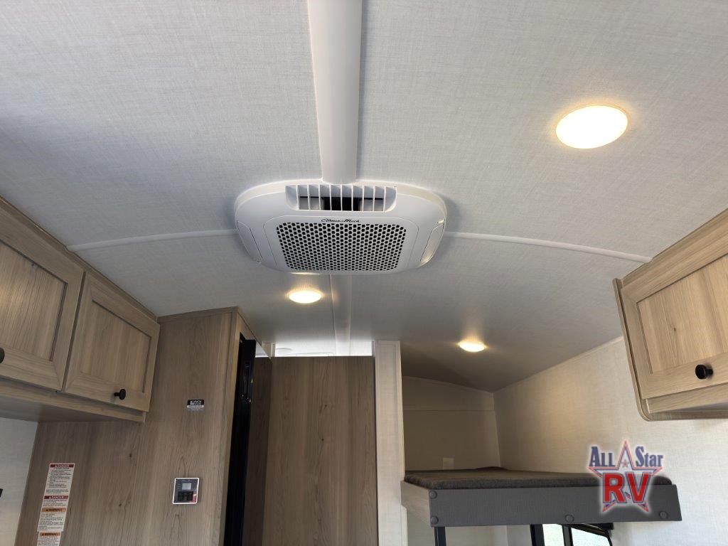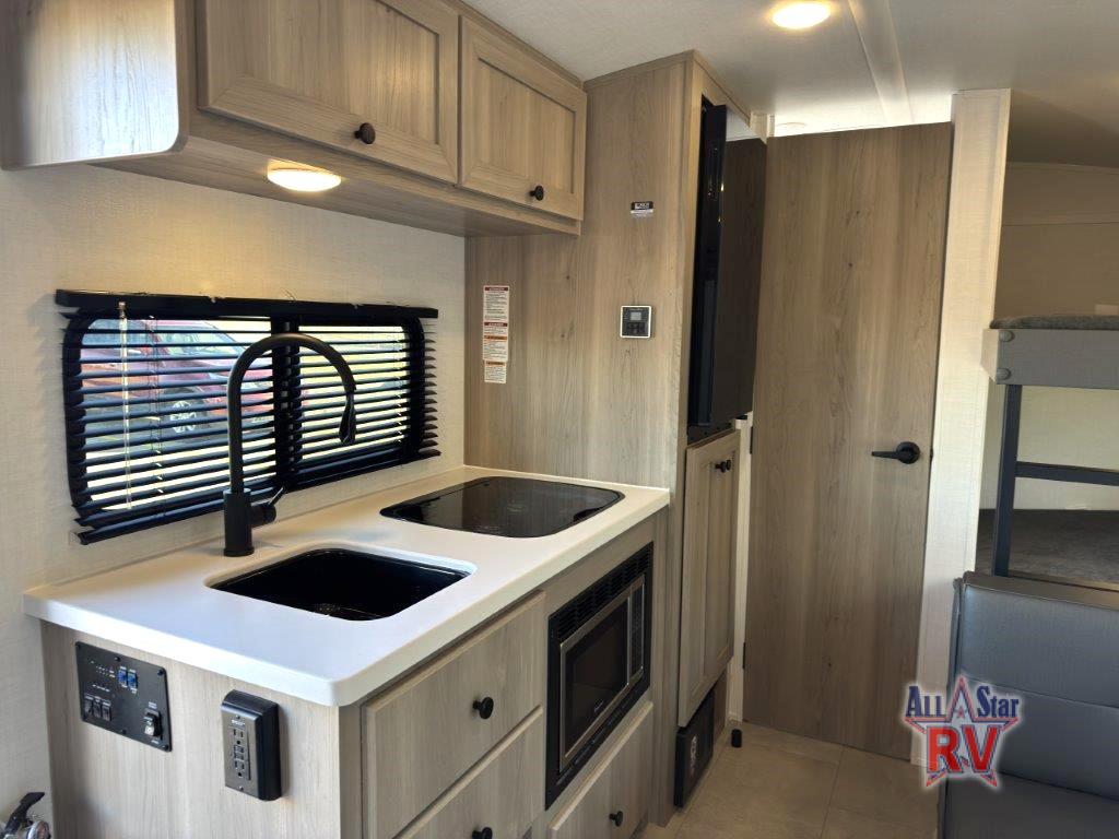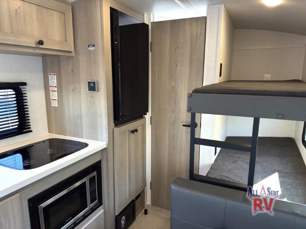 This charming travel trailer is perfect for families or small groups. The front bedroom features a full bed, perfect for a restful night's sleep. Ample storage space ensures you stay organized and clutter-free. The booth dinette is a cozy spot for meals and conversation, while the kitchen area is equipped with a microwave, fridge, and overhead cabinets. Prepare delicious meals and snacks with ease. The bunk beds provide a fun and practical sleeping solution for kids or additional guests. Perfect for sleepovers or family gatherings! The full bathroom is a convenient and refreshing space, with all the essentials for a comfortable stay.