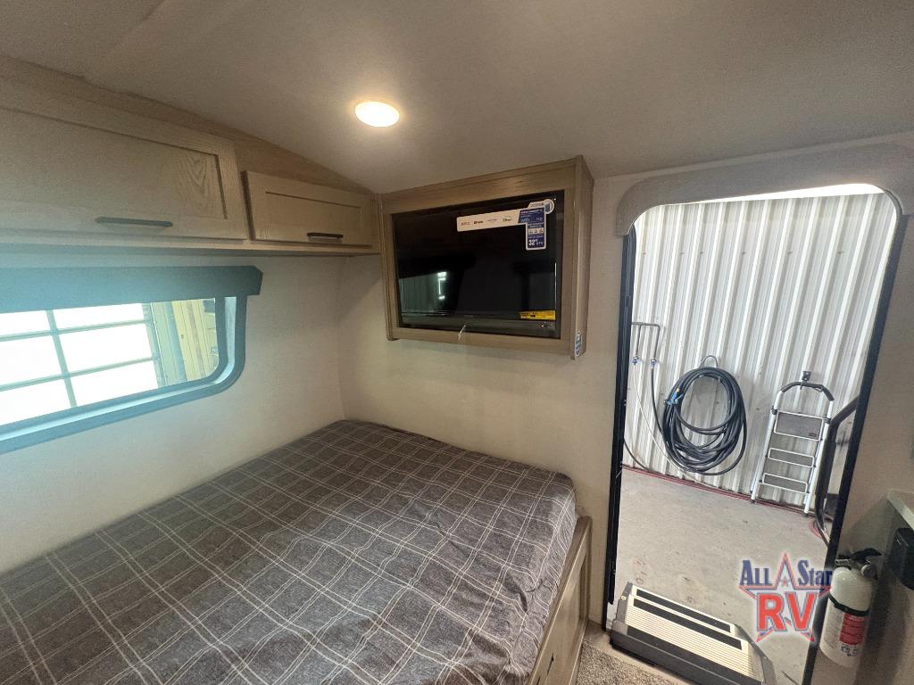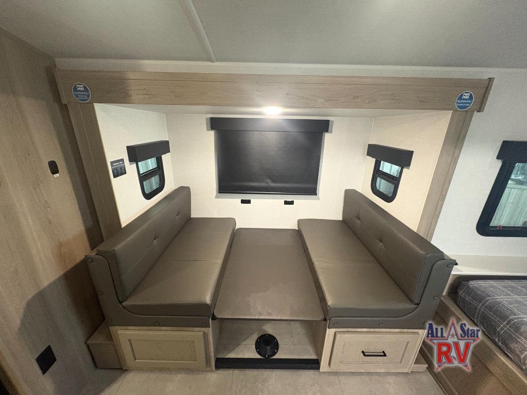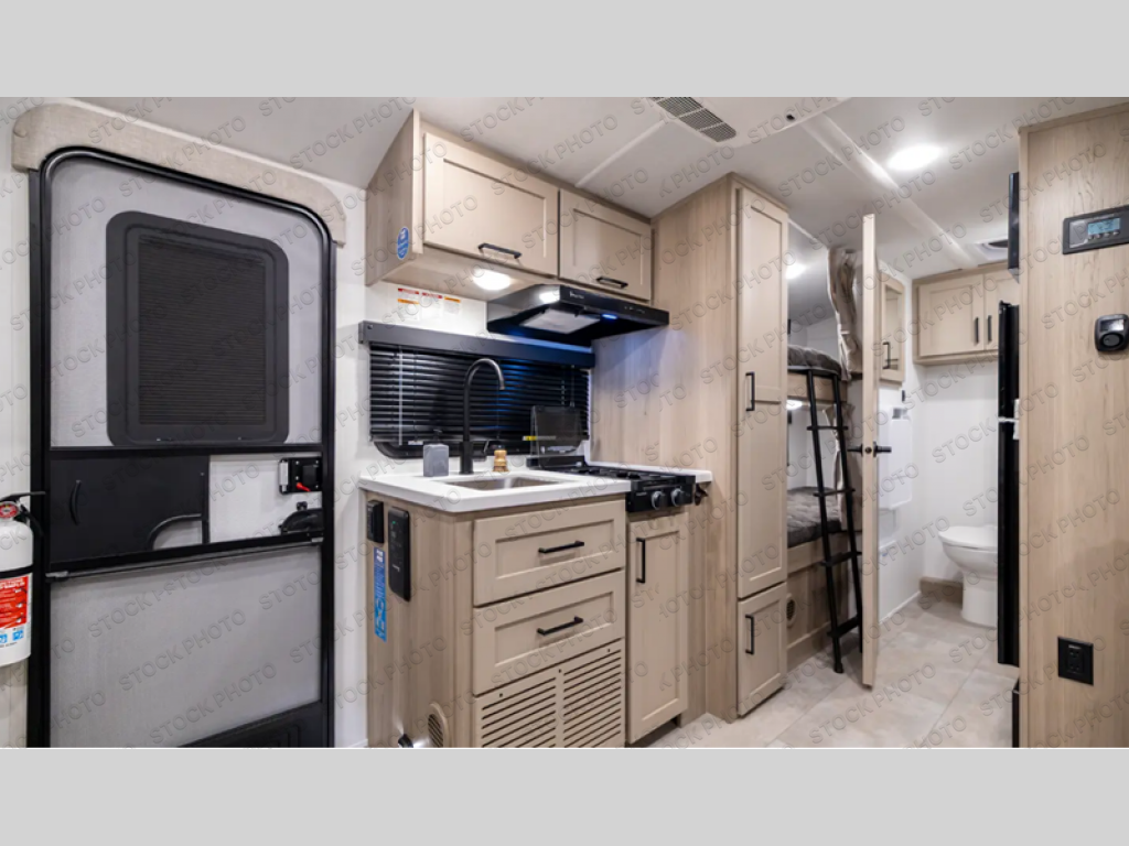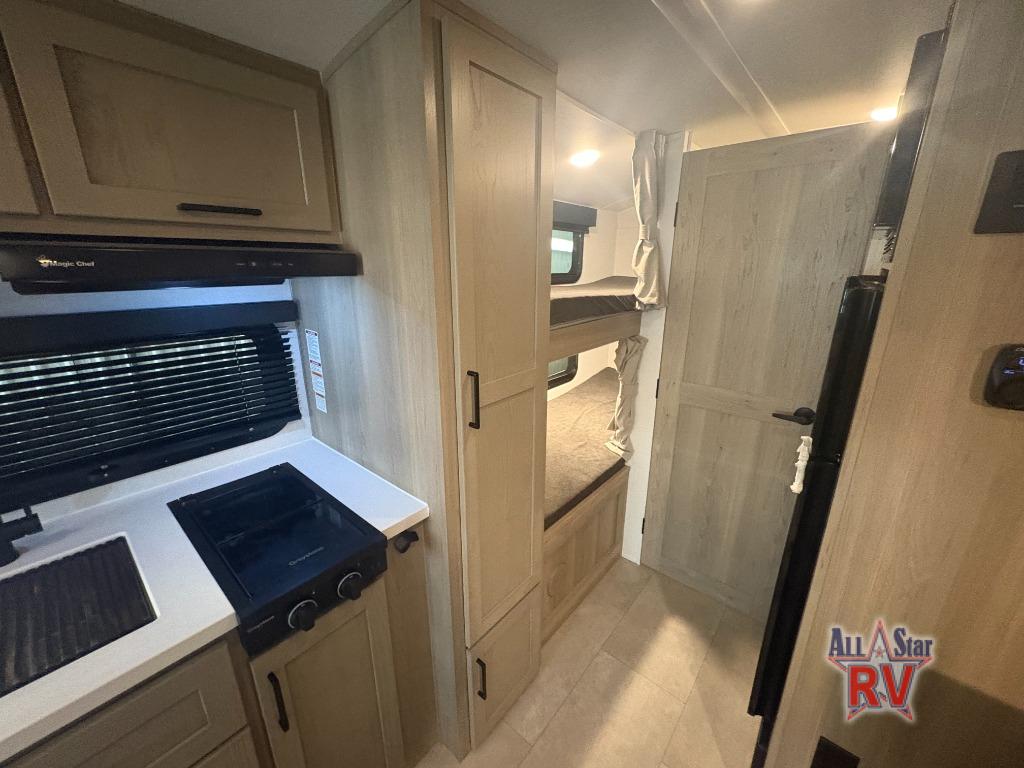 This spacious bunk trailer will work perfectly for a family or friend group that enjoys their own sleeping space, plus more floor space with the dinette slide out that can sleep one to two. There are two bunks so you or your kids can sleep. There is exterior storage for more outdoor gear, and interior storage found throughout. The cook will love having a pantry and overhead cabinets for snacks, canned goods, dishes and more. After making a warm meal, the 12V refrigerator can hold the leftovers. There is also a flip-down lavy sink in the full bath for added space when not in use!